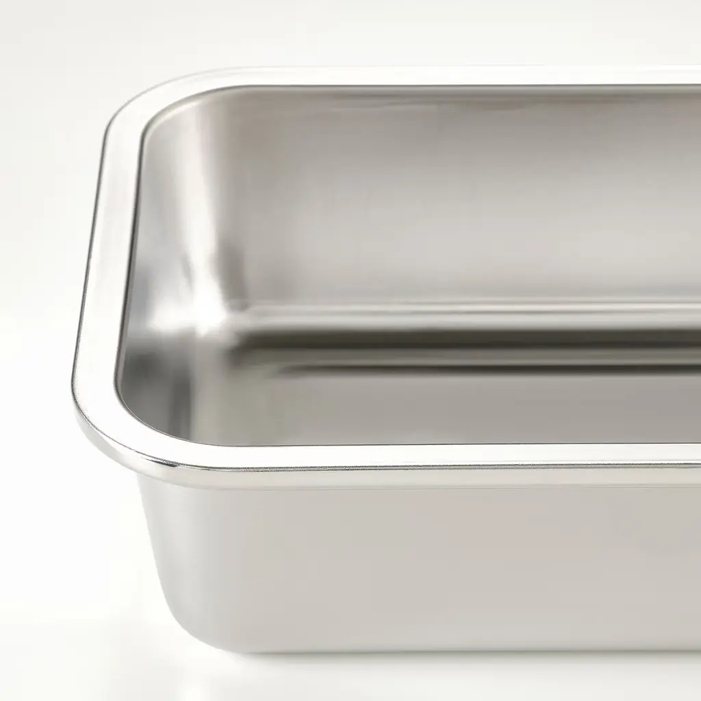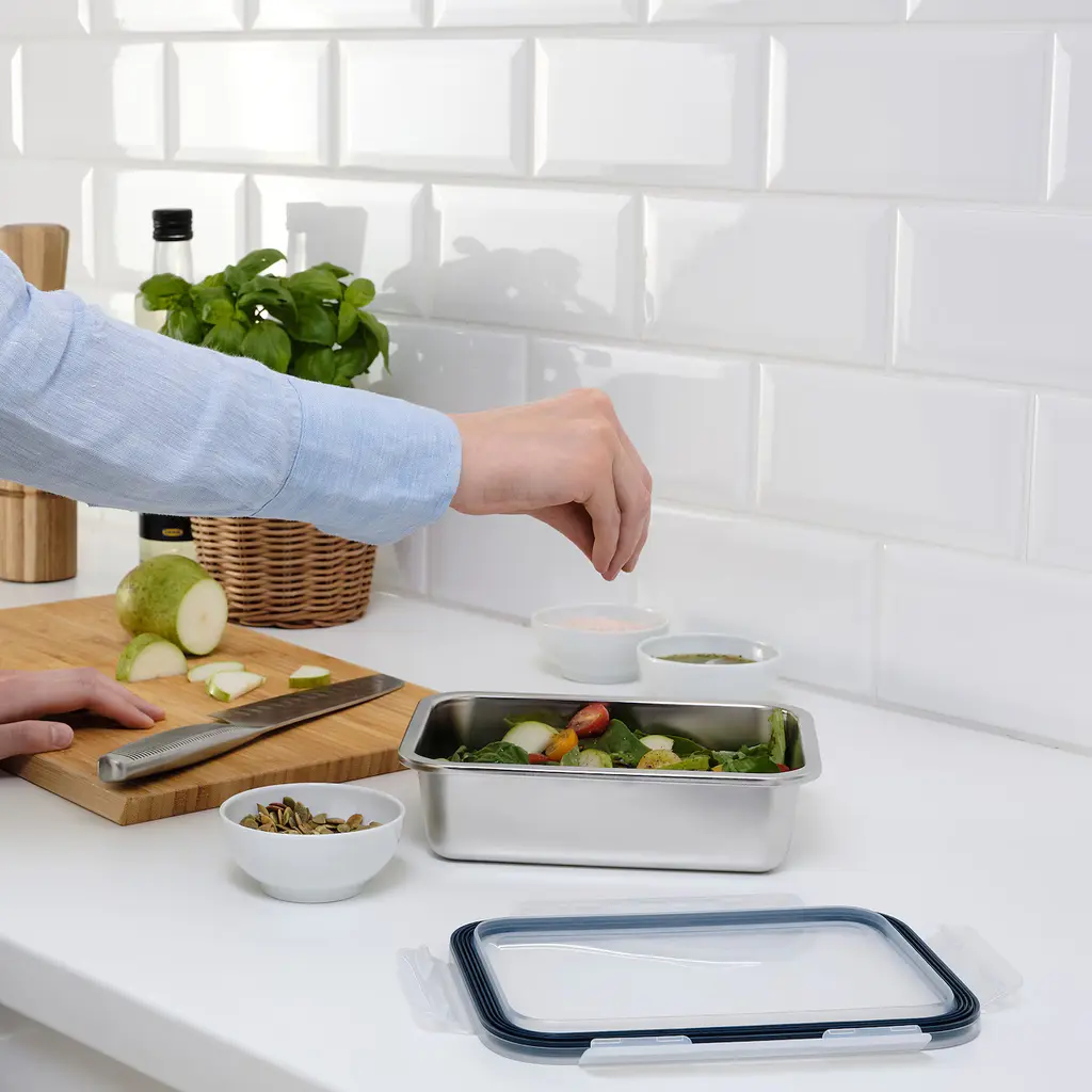IKEA 365+ Food container with lid - rectangular stainless steel/plastic 34 oz. The snap-and-lock lid prevents leakage and creates an aroma tight seal, making it ideal for both transporting and storing food. You can easily see the contents as the lid is transparent.