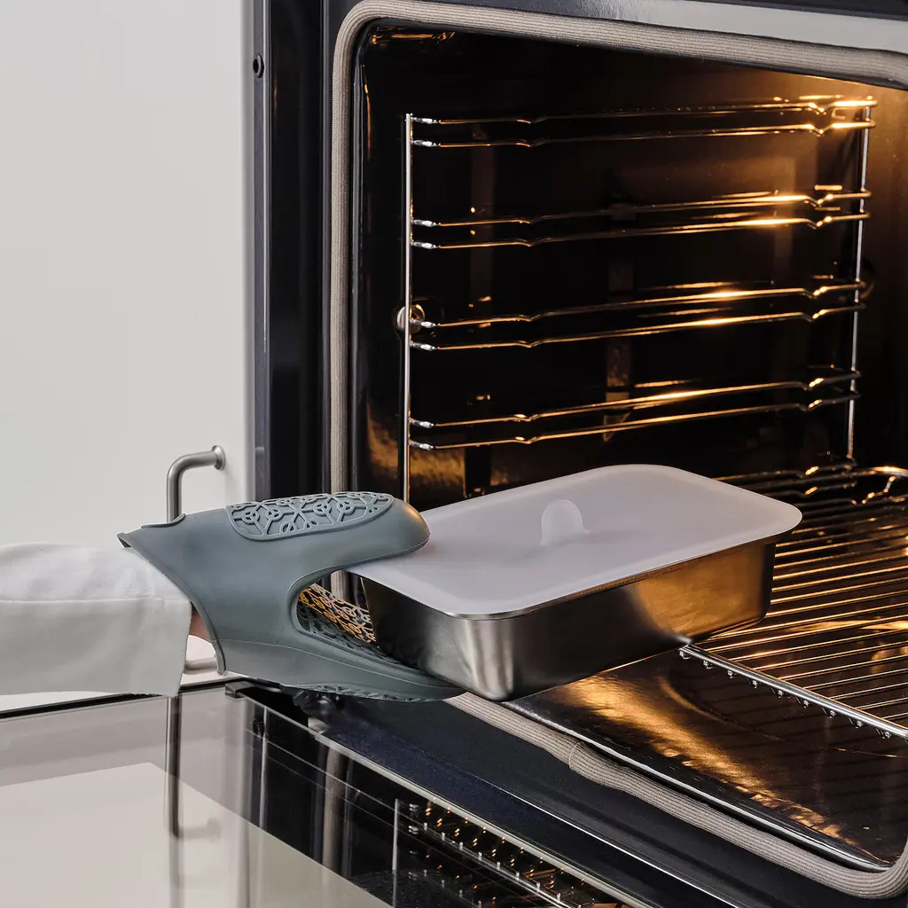IKEA 365+ Food container with lid - rectangular stainless steel/silicone 34 oz. The lid creates a vacuum when placed on a container ‒ keeping the food fresh longer and helping the food retain both heat and coolness. The lid can be used to protect from splatter in the oven and the microwave.