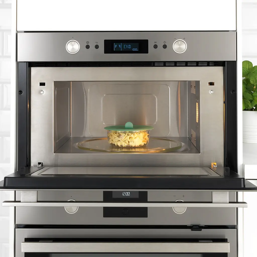 IKEA 365+ Food container with lid - round glass/silicone 14 oz. The food container is made of oven-safe glass and can be used as an oven/serving dish. The lid creates a vacuum when placed on a container ‒ keeping the food fresh longer and helping the food retain both heat and coolness.