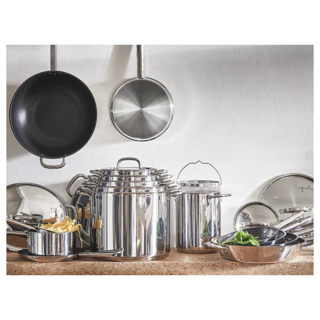 IKEA 365+ Pot with lid - stainless steel 5 qt. Works well on all types of cooktops, including induction. The pot handles are designed to reduce heat transfer. Made from stainless steel that is durable and easy to clean. The pot has a rounded interior, which makes stirring and mixing easy.