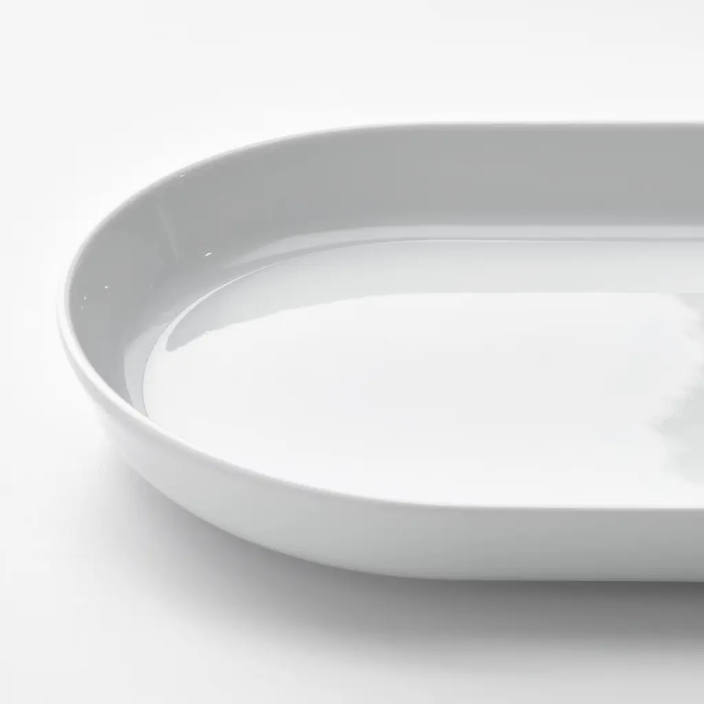 IKEA 365+ Serving plate - white 11x6 ". Made of feldspar porcelain, which makes the serving plate impact resistant and durable. The dinnerware’s smart design allows you to stack the smaller sizes inside the larger ones without taking more vertical space, so you get room for other things.