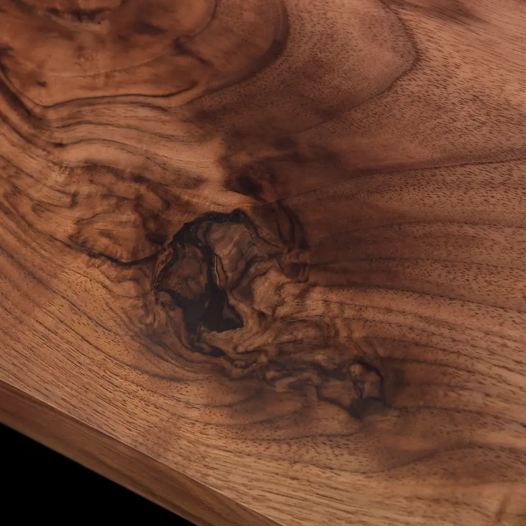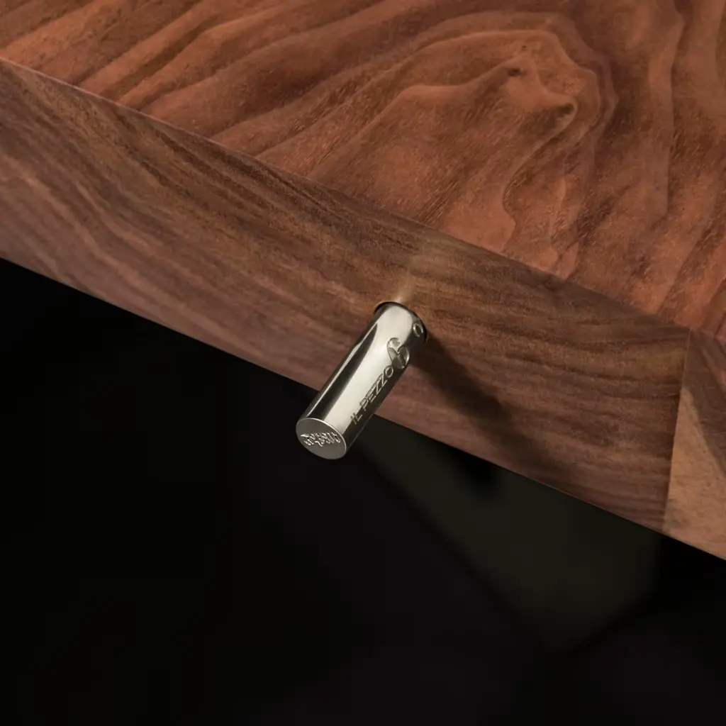 A solid block of fine walnut rests harmoniously on a series of hand-crafted brass legs, while a wood streak in a contrasting color runs across its surface. Il Pezzo 6 Console is finished with natural oil that protects the wood while letting it breathe. In each piece, a small brass cylinder with a personalized number attests to its uniqueness and authenticity. This piece can be custom made to your desired size and finish.