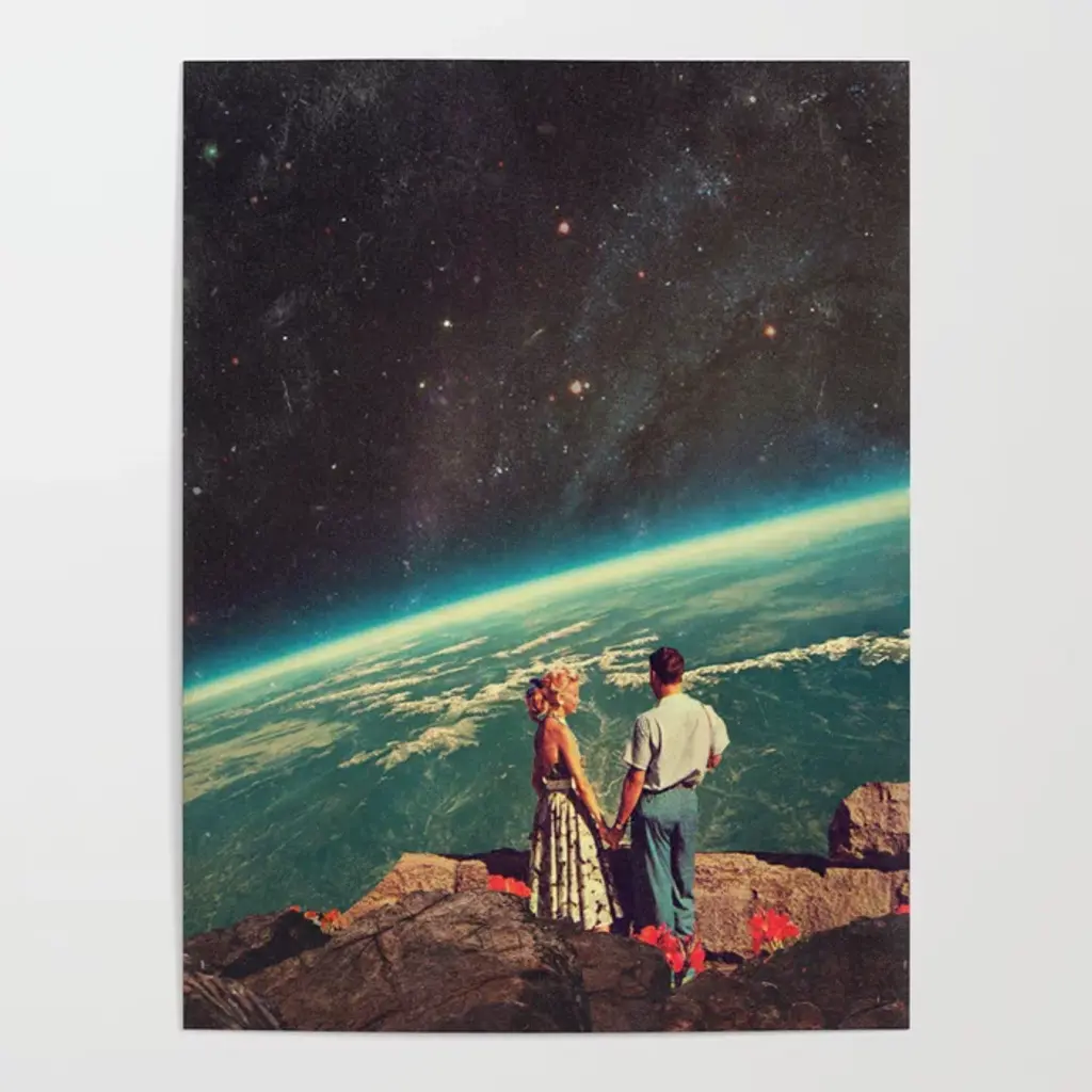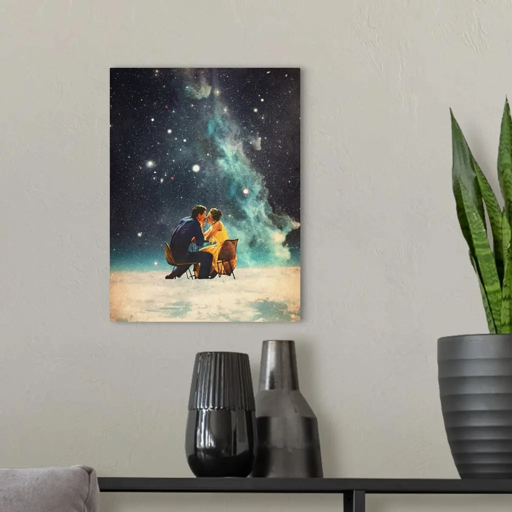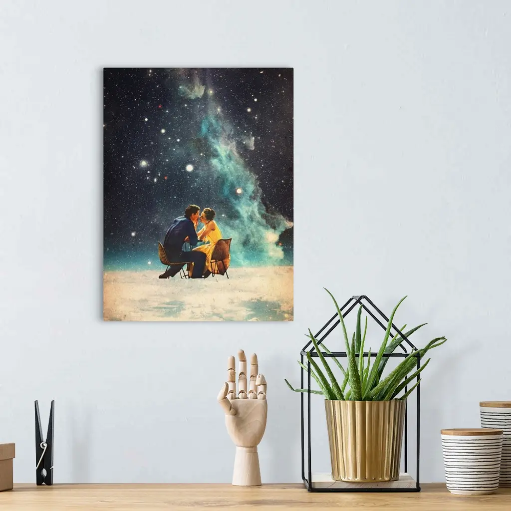 A retrofuturism surrealist collage featuring a couple kissing beneath a space nebula.