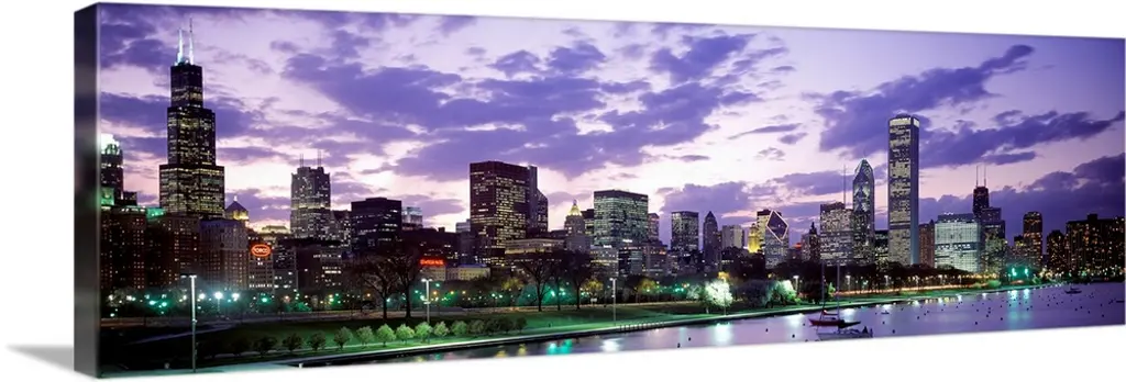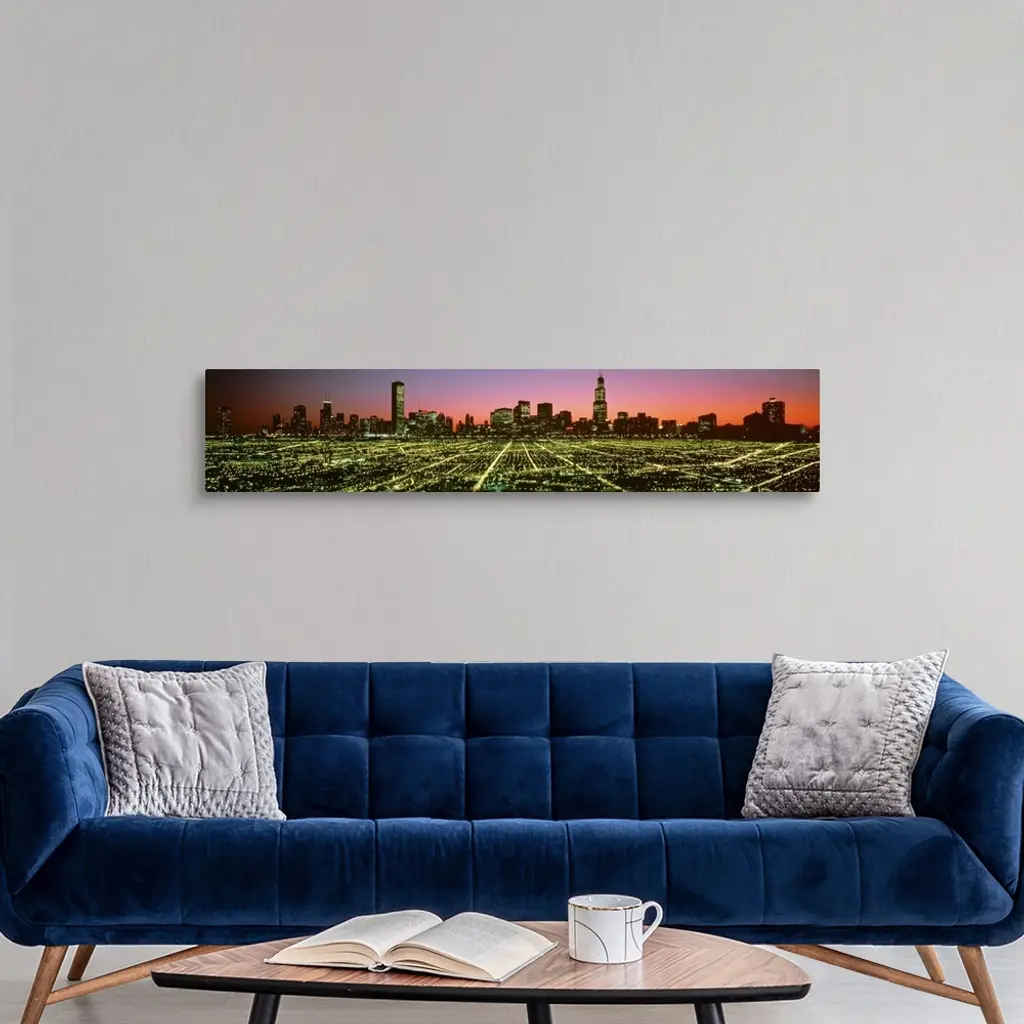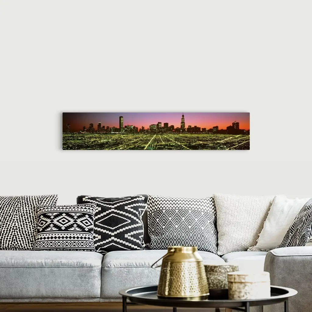 Illinois, Chicago, High angle view of the city at night wall art for home and office decor. Discover canvas art prints, photos, mural, big canvas art and framed wall art in GreatBigCanvas.com's varied collections.