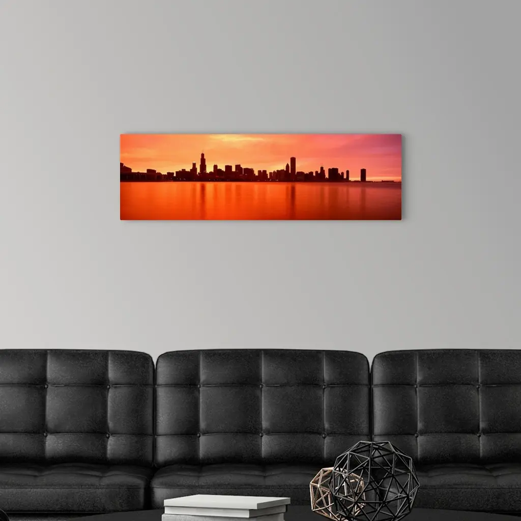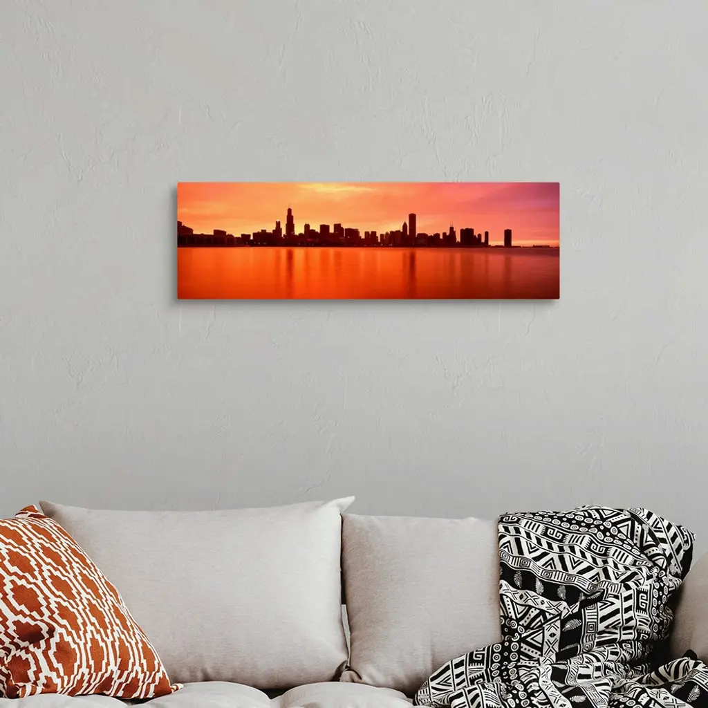 Panoramic photograph of skyline silhouette and waterfront at dusk.