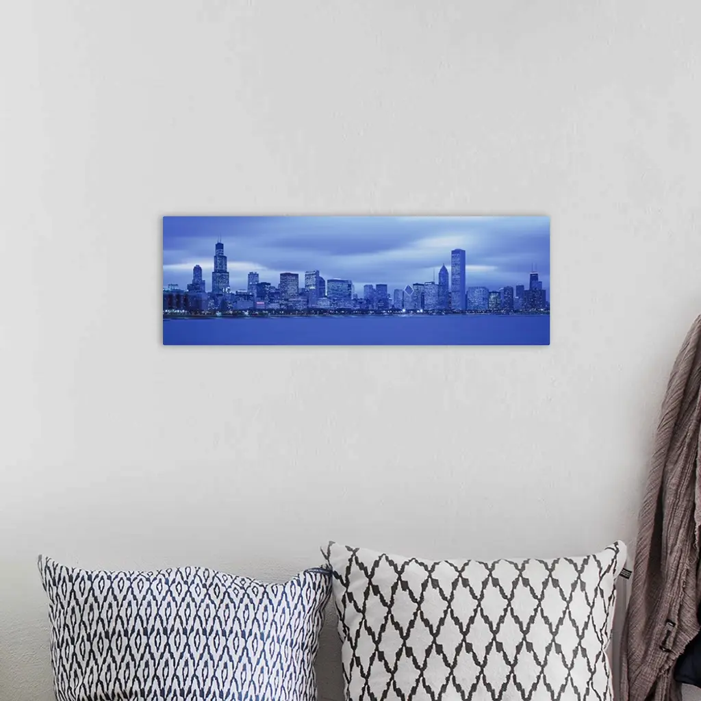 The Chicago skyline is photographed in panoramic view with a cool tone over the entire picture.