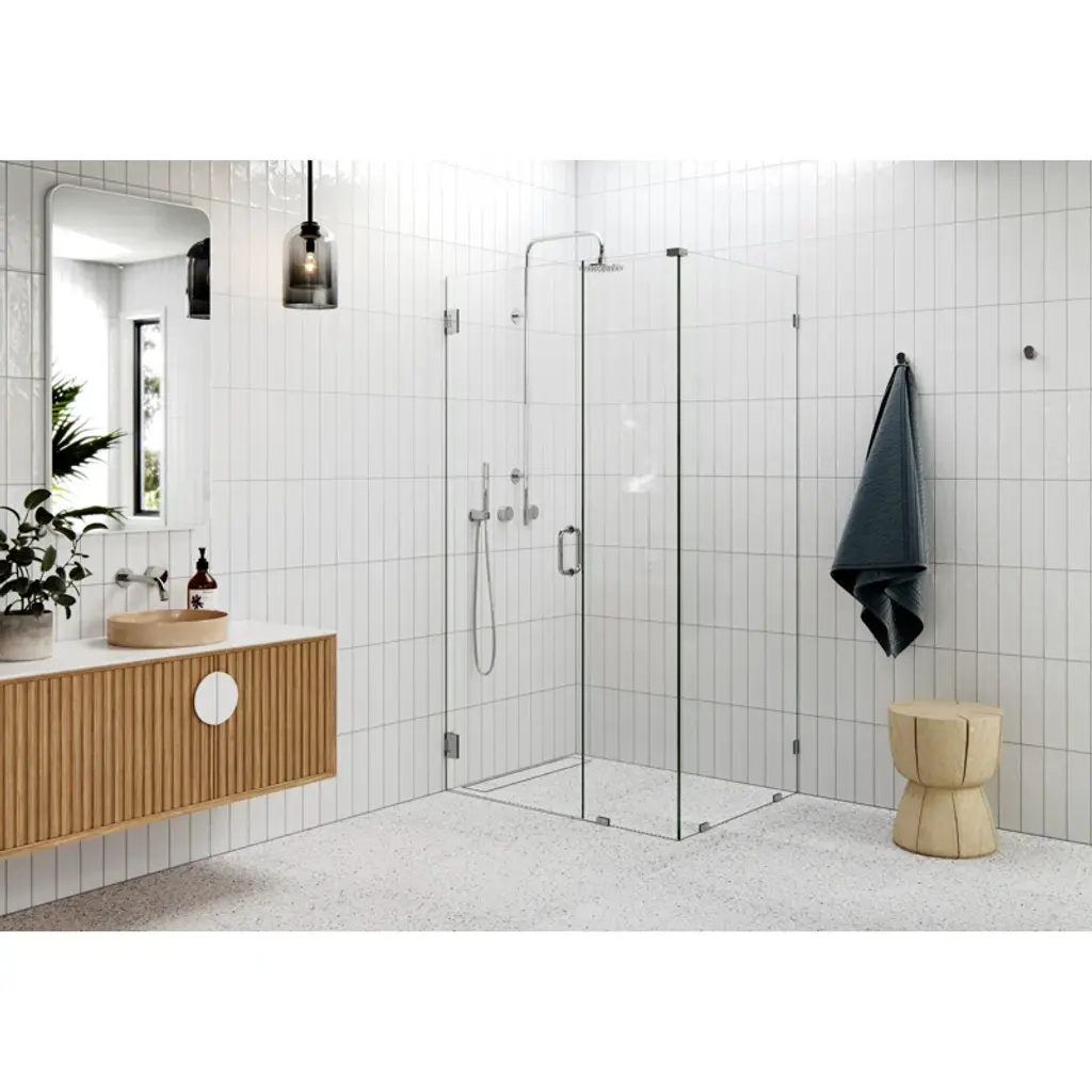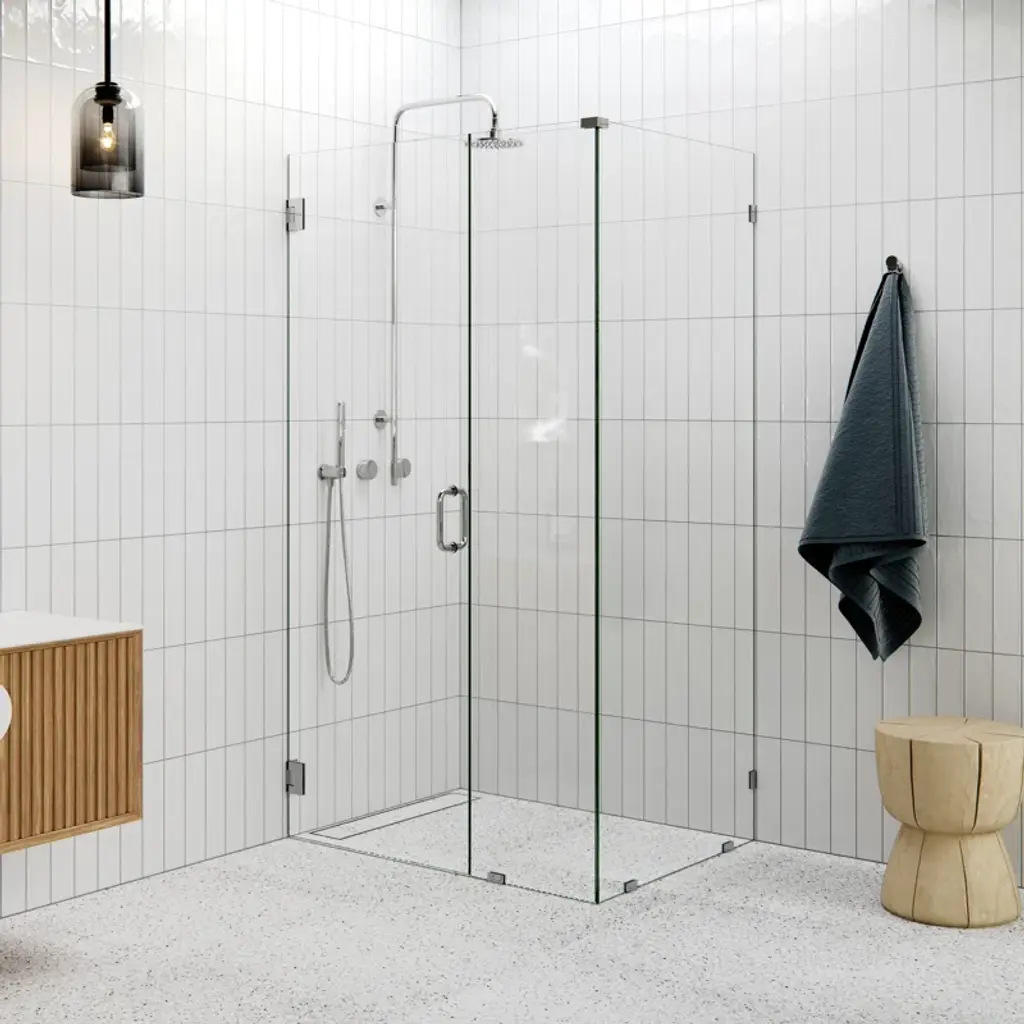 The beauty of the Illume wall hinged 90-degree corner shower enclosure lies in its simplicity of form. Taller than most competitor shower enclosures, our frameless 3/8” tempered glass panels come in a standard 78” height. Glass is treated on both sides with EnduroShield coating, which aids in repelling water and soap residue, allowing the panels to be fully reversible. In addition, our superior quality solid brass hardware is available in a variety of color finishes to suit any bathroom. With our extensive range of frameless shower door and panel sizes, the Illume enclosure by Glass Warehouse creates light, clean lines with a modern sleek finish, whatever the size of your bathroom.