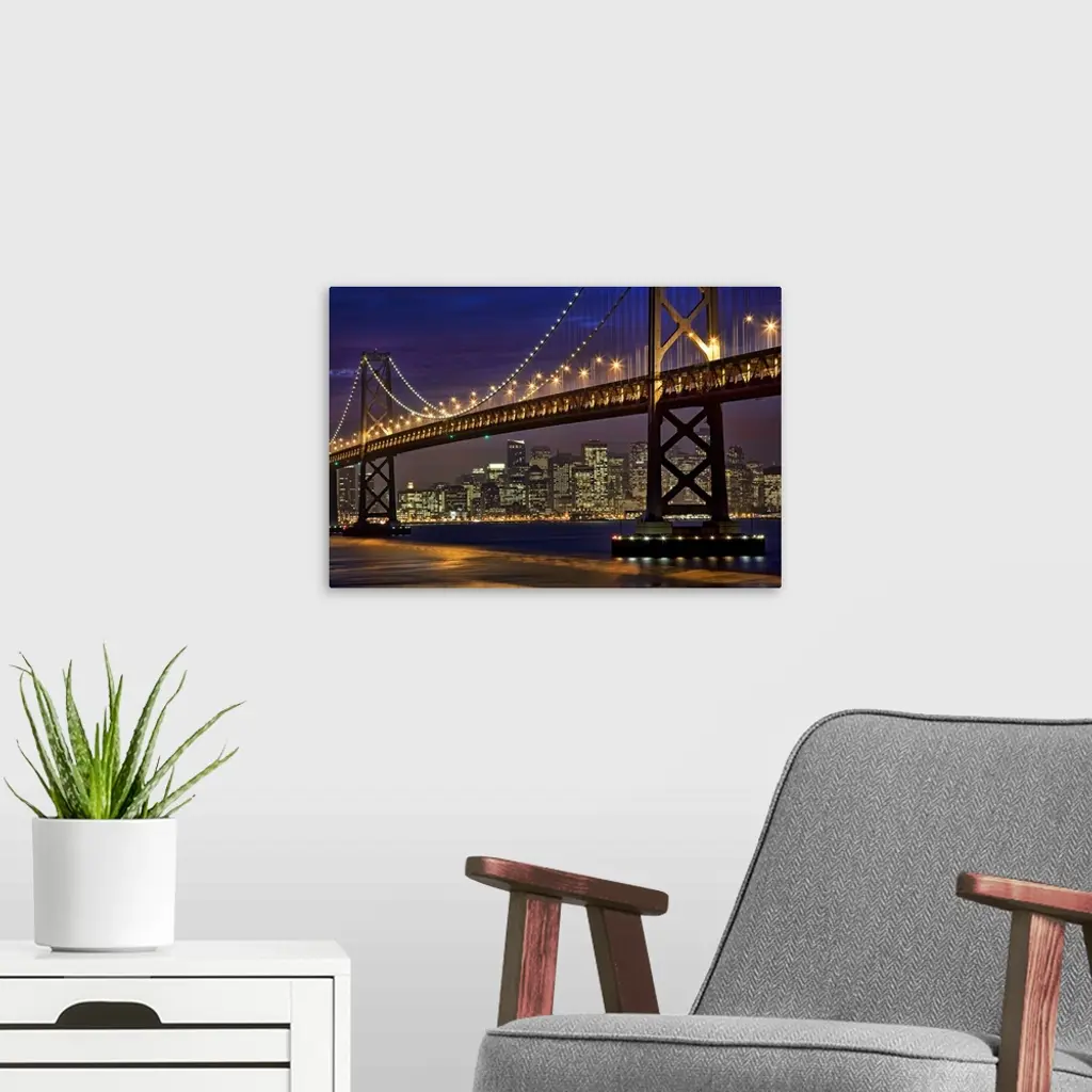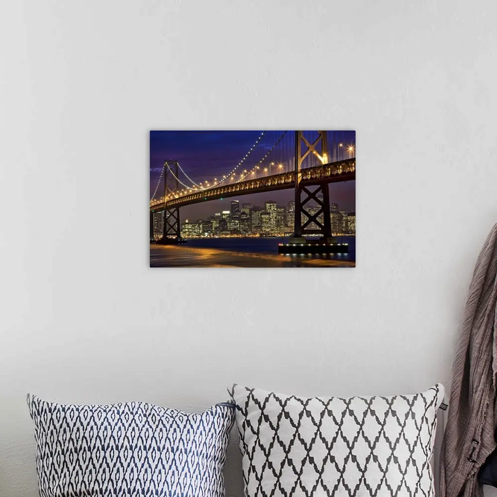 The Bay Bridge is shining brightly under a night sky with the San Francisco skyline shown in the background.