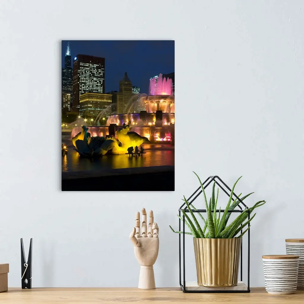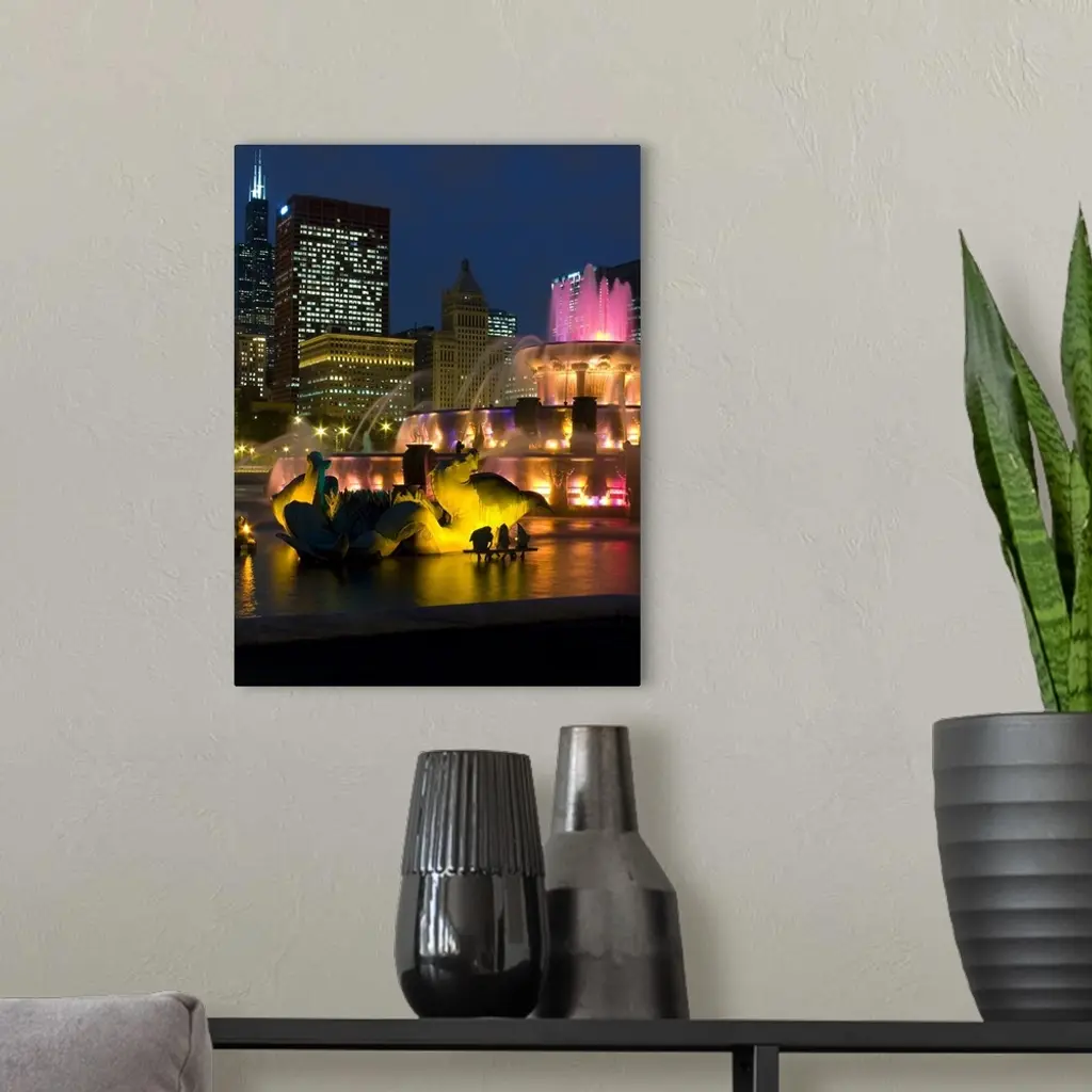 Illuminated fountain with skyscrapers in a city, Buckingham Fountain, Grant Park, Chicago, Illinois, wall art for home and office decor. Discover canvas art prints, photos, mural, big canvas art and framed wall art in GreatBigCanvas.com's varied collections.