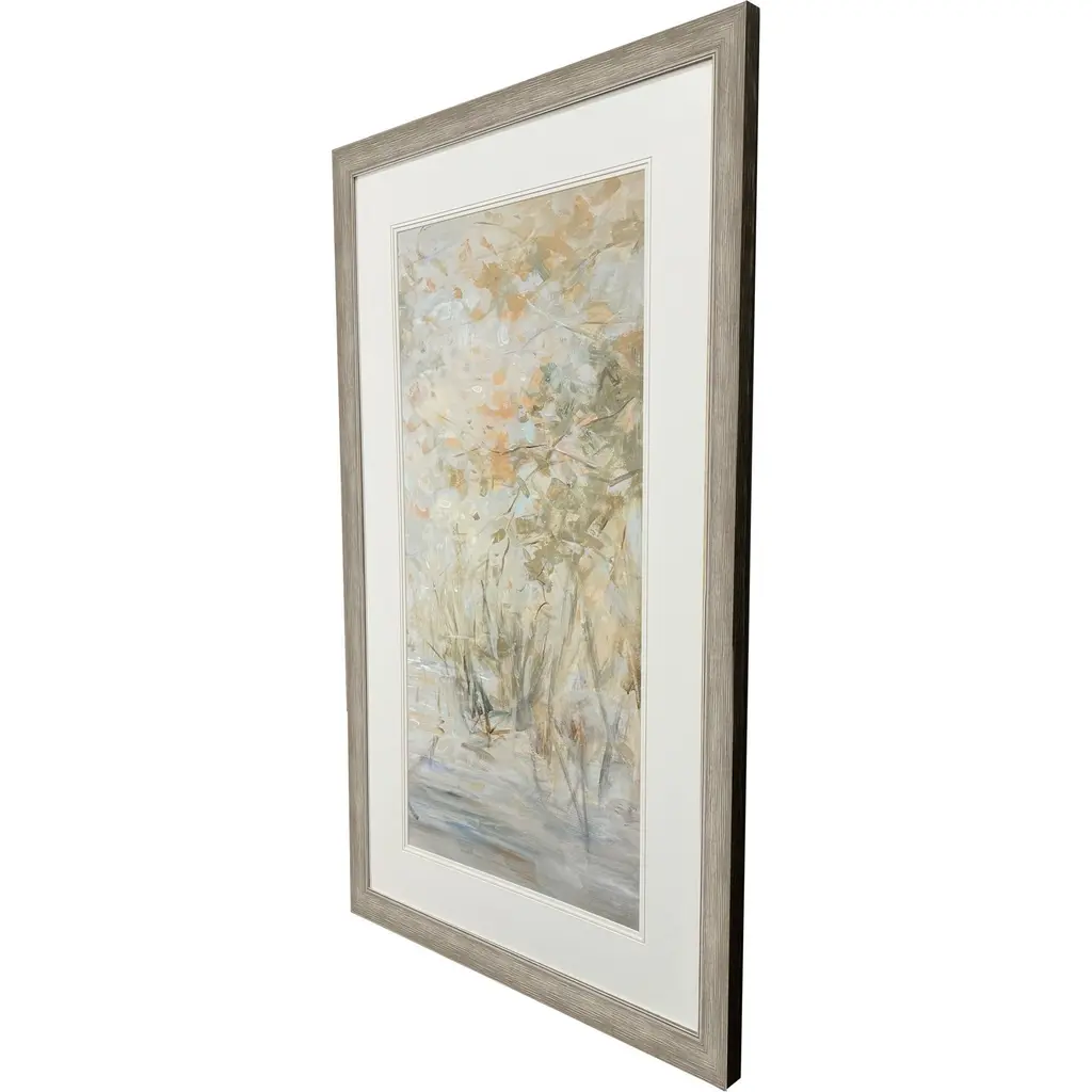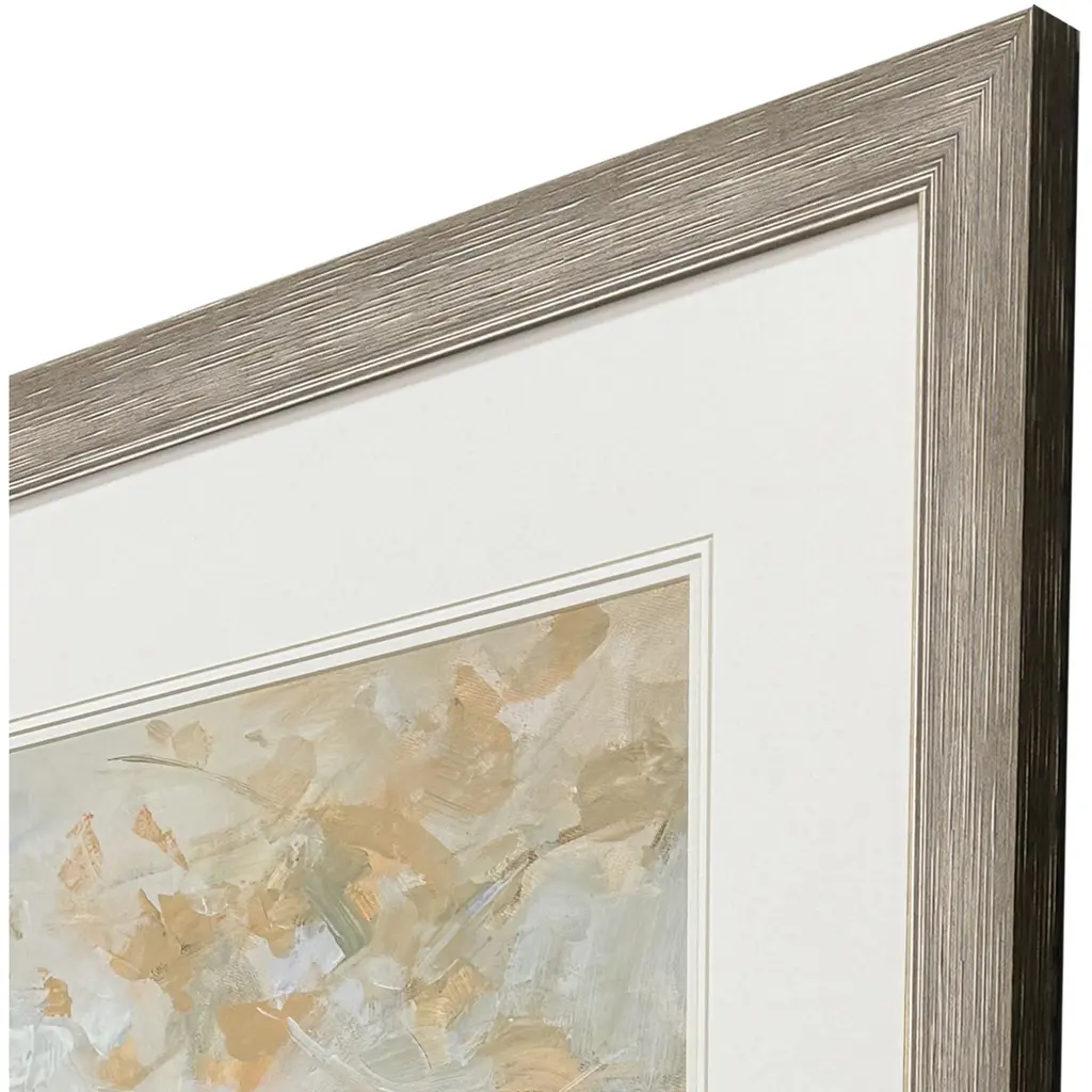 A watery landscape in soft color hues is matted in white and framed in a distressed silver finish molding with an embossed combed pattern.