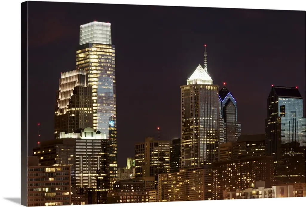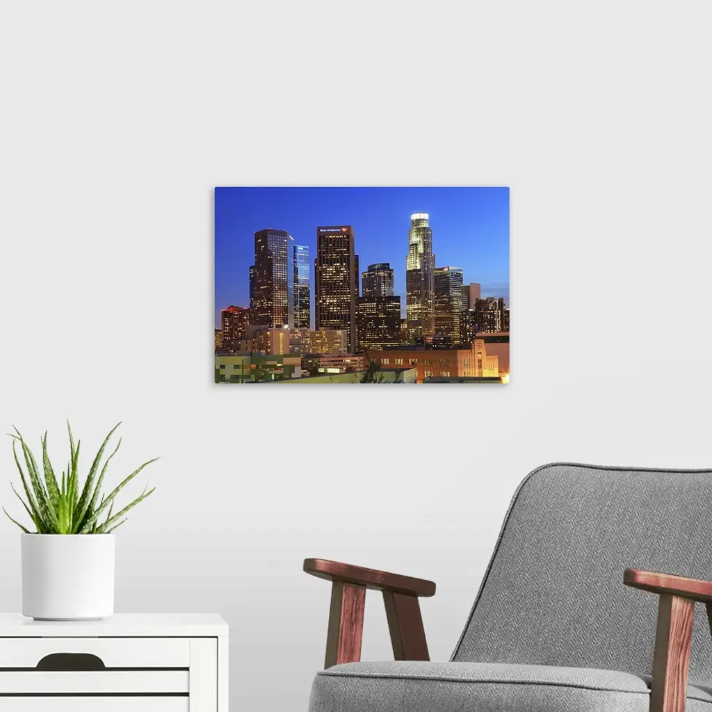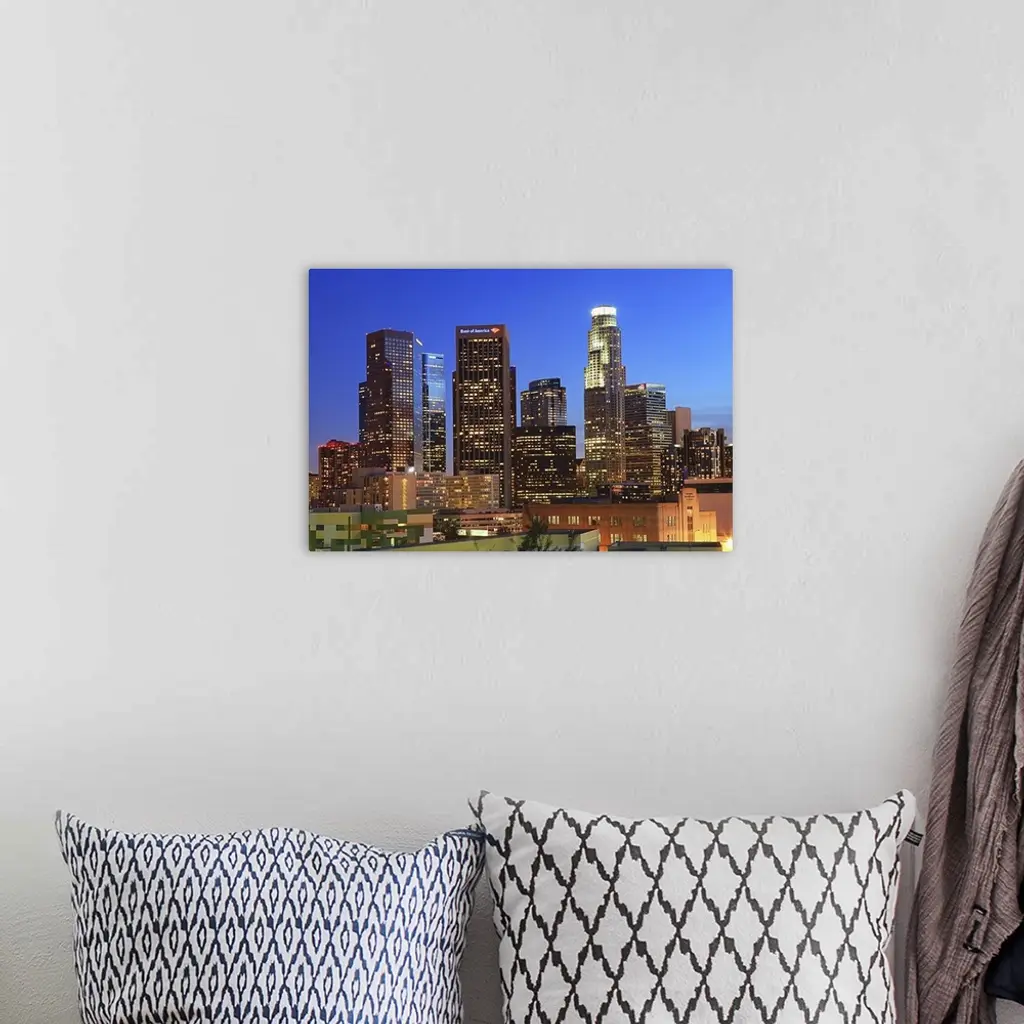 Illuminated of Downtown skyscrapers in Los Angeles. wall art for home and office decor. Discover canvas art prints, photos, mural, big canvas art and framed wall art in GreatBigCanvas.com's varied collections.