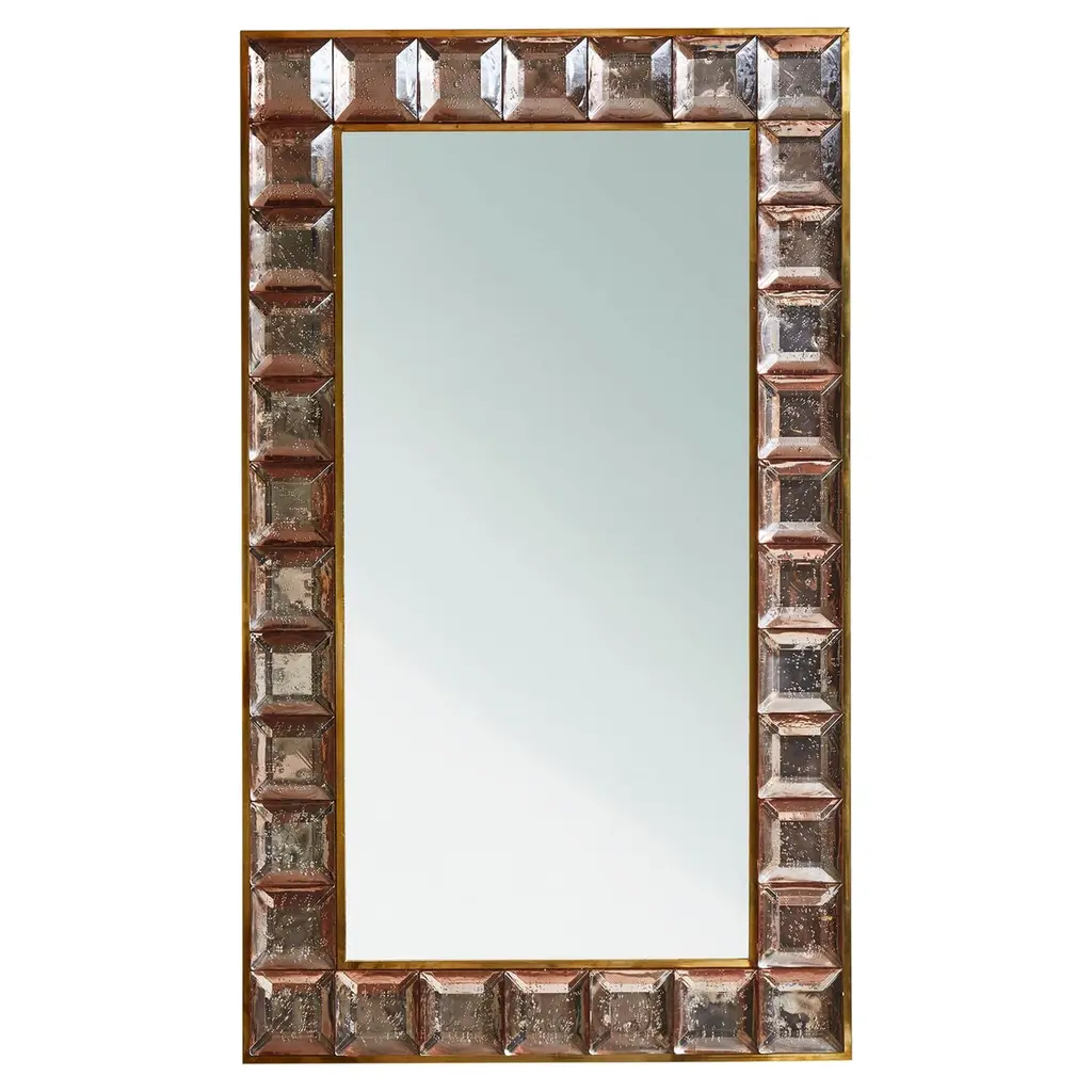 Our mirror's faceted glass tiles feature cloudy occlusions that recreate some of the organic irregularities of real mineral crystals, made all the more captivating when illuminated.