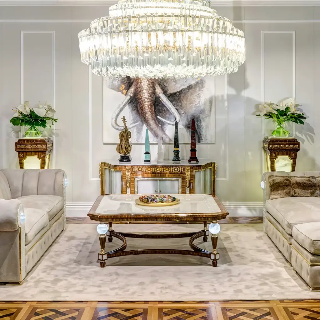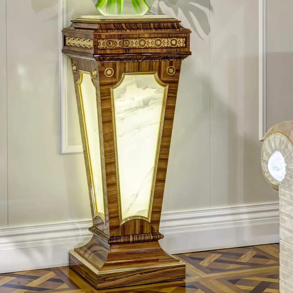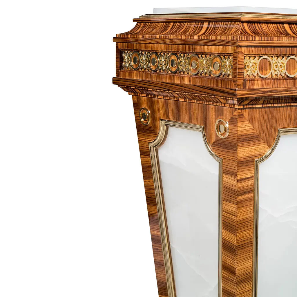 A plush addition to a classic-inspired decor, this column is a statement-making piece resulting from a painstaking artisan process that ensures its uniqueness. The flared wooden body is extensively veneered in Zebrawood and features 24Kgold-plated bronze decorations outlining white onyx inserts illuminated by an internal LED light. It makes for an elegant solution to elevate entryways or living rooms in luxe interiors.