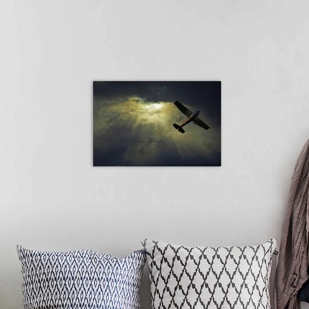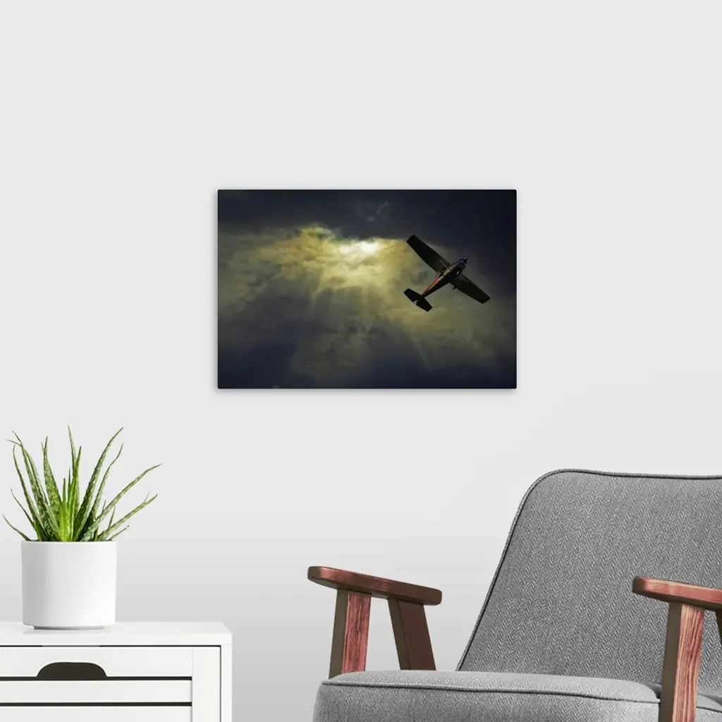 A photograph taken looking upward where rays of sunlight shine through dense cloud cover and a small airplane flies overhead.
