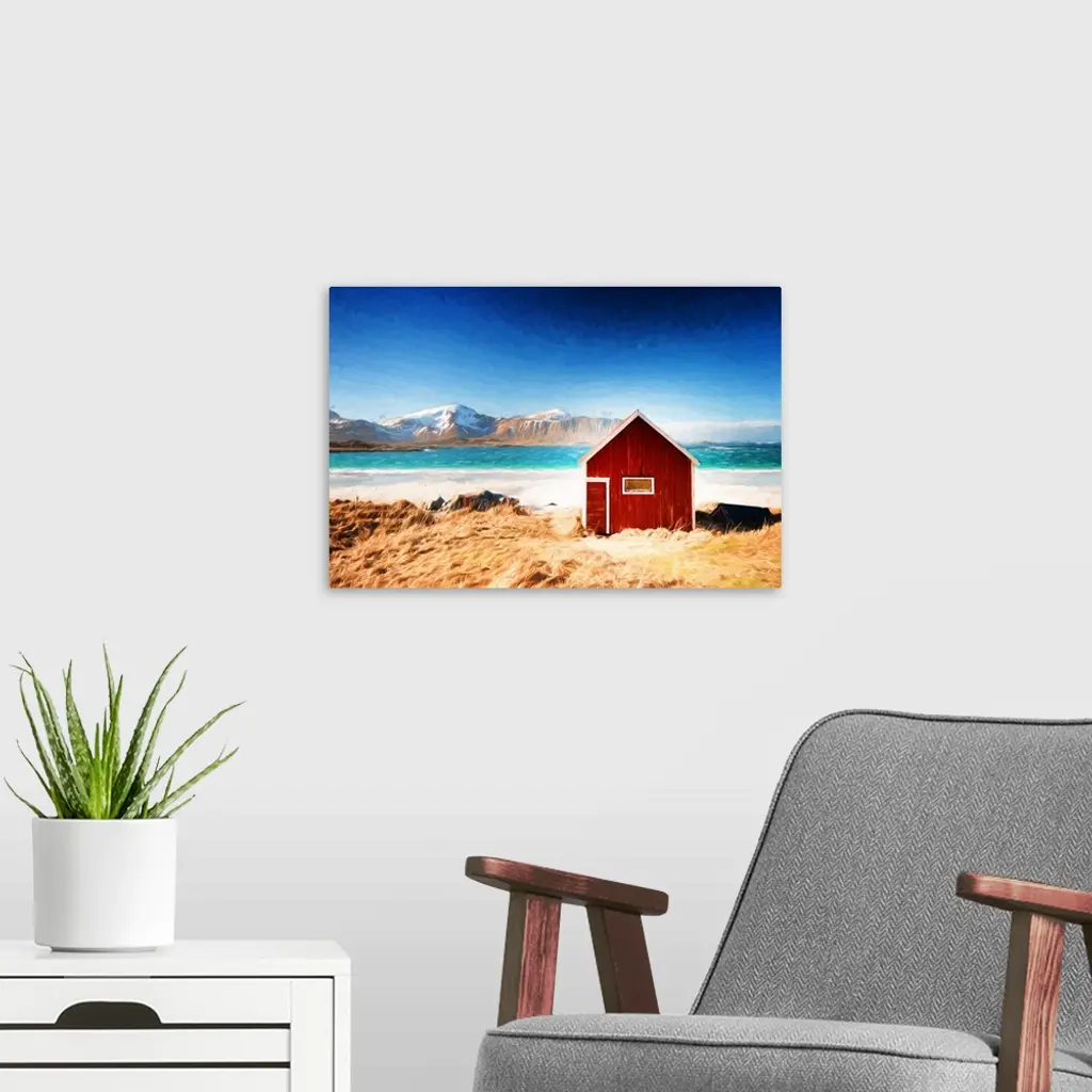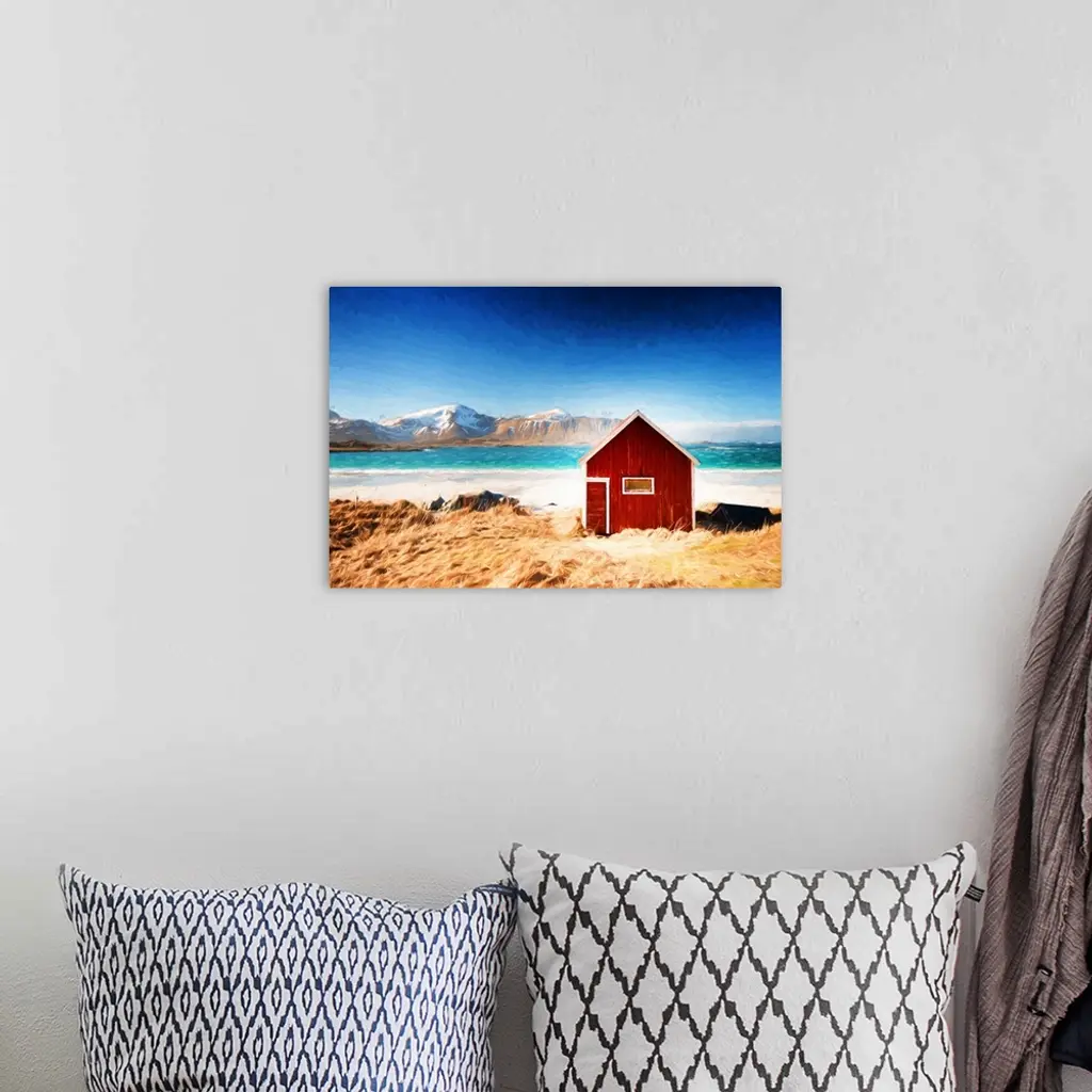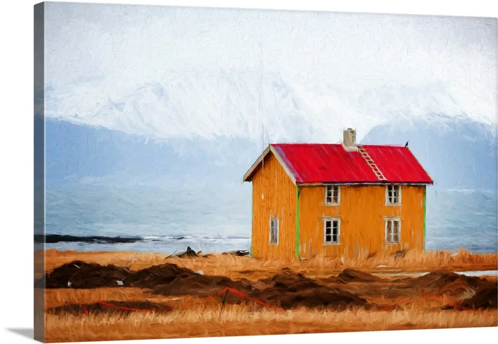 A photograph of a red house sitting in a rugged landscape with a snow covered mountain in the distance.