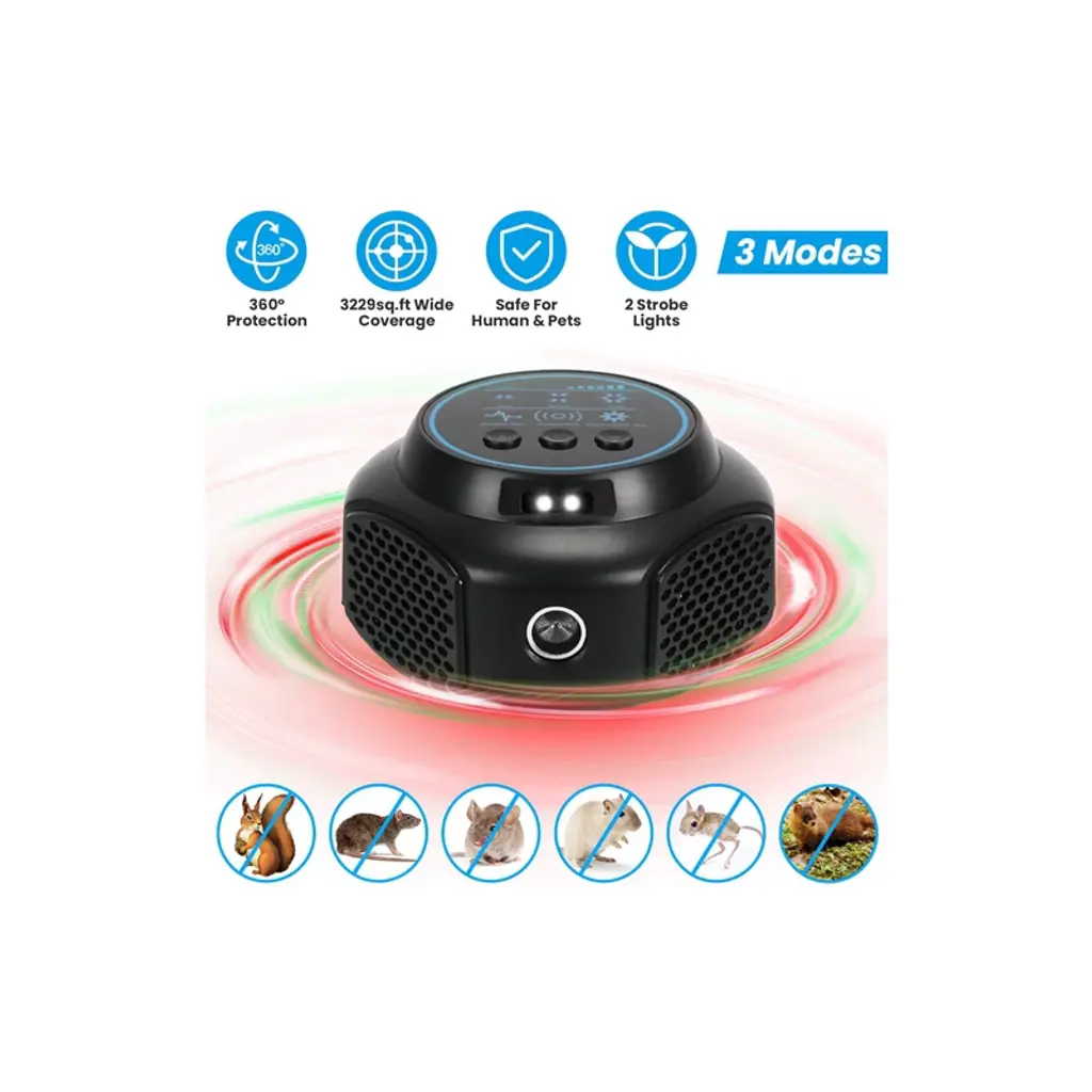 Here is a rewritten description for the **Advanced Ultrasonic Rodent Repeller**: --- **Advanced Ultrasonic Rodent Repeller with 3 Modes, Strobe Lights, and 3229 sq. ft. Coverage** Protect your home, office, or warehouse from rodents with the **Advanced Ultrasonic Rodent Repeller**. Using cutting-edge ultrasonic and pulse wave technology, this device effectively repels mice, rats, squirrels, roaches, and more, without the need for chemicals. The versatile 3-mode system and flashing LED strobe lights ensure that your space remains pest-free, covering up to **3229 sq. ft.** of area. **Key Features:** - **Powerful Ultrasonic Technology**: Emits 1-65KHz ultrasonic sounds and pulse waves that disrupt rodents’ neurological systems, making your space inhospitable to various pests such as mice, rats, squirrels, roaches, fleas, and more. - **3 Customizable Modes**: Tailor the repeller to your specific needs with three modes: - **Mode 1**: Ultrasonic waves for small rodents (mice) - **Mode 2**: Pressure waves for medium-sized rodents (rats) - **Mode 3**: Electromagnetic waves for larger rodents (squirrels) Easily switch between modes with the power and mode buttons. - **Safe & Non-Toxic**: The ultrasonic sounds are above the hearing range of humans and pets, ensuring it is safe for children, babies, cats, and dogs. No chemicals, poisons, or harmful substances are used. - **Strobe Lights for Added Effect**: Equipped with 2 LED strobe lights that flash to disorient rodents in dark environments, effectively deterring them without causing harm. - **Wide Coverage Area**: With 360º protection, this repeller covers up to **3229 sq. ft.**, making it ideal for use in large indoor spaces such as garages, basements, warehouses, kitchens, and more. **Product Specifications:** - **Dimensions**: 13 x 13 x 7.5 cm (5.12 x 5.12 x 2.95 in) - **Weight**: 157g (0.35 lbs) - **Power**: 6-8W, DC 5V, 500mA current - **Noise Level**: 90dB - **Coverage Area**: Up to **3229 sq. ft.** - **Ultrasound Frequency**: 1-65KHz - **LED Strobe Lights**: 2 (on/off function) - **Power Supply**: Type-C USB Cable (98cm/38.58in) and Adapter (110-240V input) **What’s in the Box:** - 1 x Ultrasonic Rodent Repeller - 1 x Type-C USB Cable - 1 x Adapter - 1 x User Manual **Important Notes**: - **Indoor use only**. - Full effectiveness can be seen after **2-4 weeks** of continuous use. - For best performance, ensure the device is placed at least 1 meter away from surrounding objects. - Recommended for year-round use for continuous rodent protection. --- This revised version emphasizes the product’s versatility, effectiveness, and safety, ensuring that users understand its features and how it operates efficiently in their spaces.