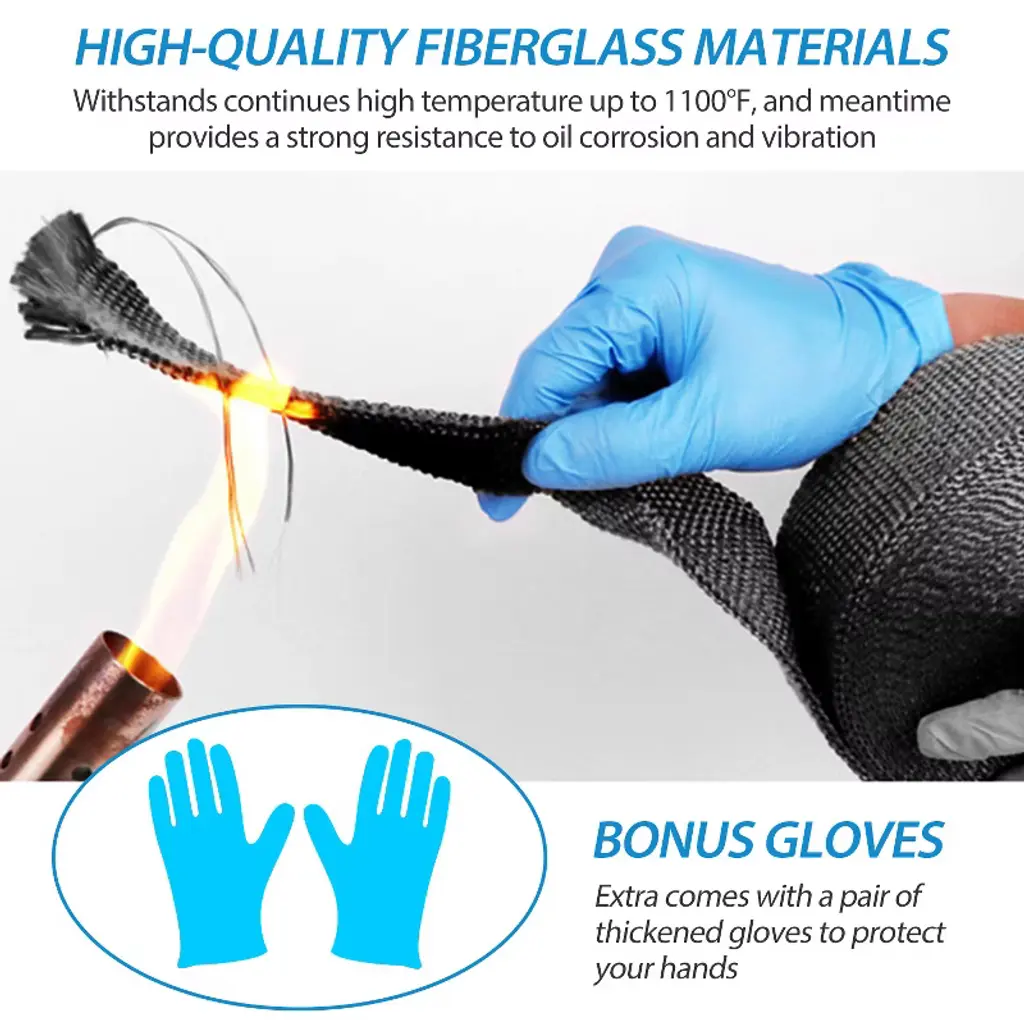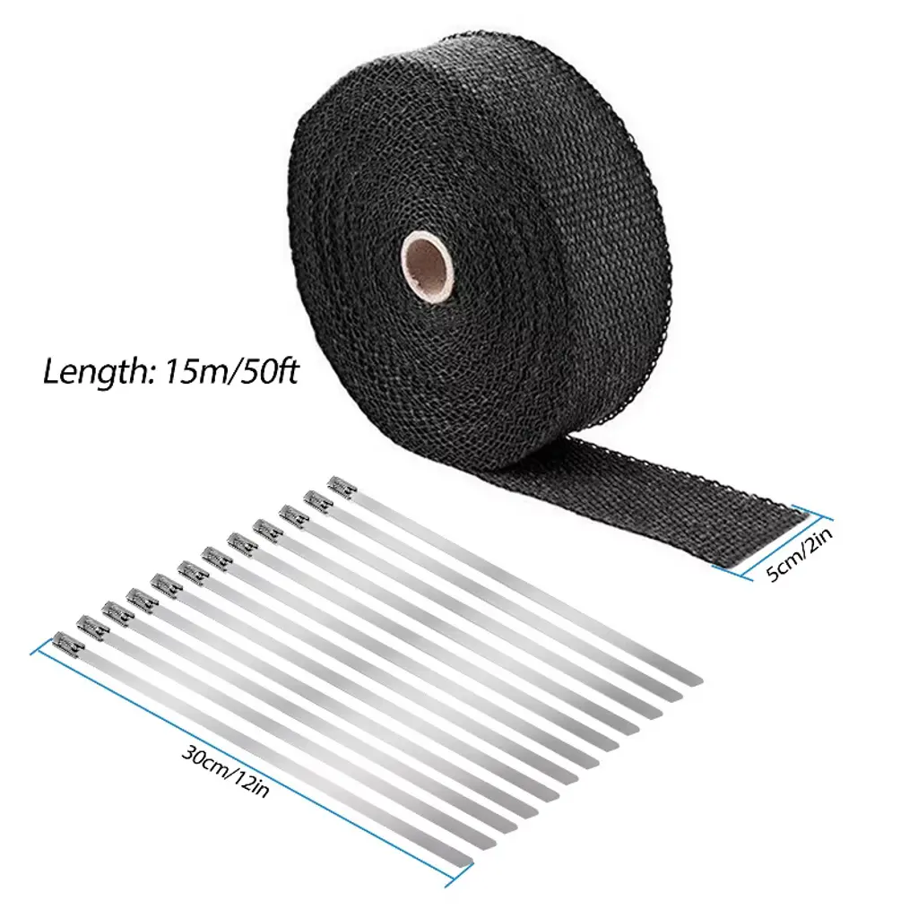 iMounTEK 2" x 50FT Exhaust Heat Wrap Tape with 12 Stainless Steel Locking Ties & Bonus Gloves Features: Exceptional Thermostability: Crafted from high-quality fiberglass, this exhaust heat wrap can endure continuous high temperatures up to 1100°F. It also offers excellent resistance to oil corrosion and vibration, ensuring durability. Effective Heat Insulation: This wrap helps insulate the heat from engine exhaust manifolds, lowering the temperature inside the engine compartment. It protects sensitive power circuits and pipelines, while also reducing exhaust noise, improving both car and motorcycle performance. Pliable Locking Ties: The set includes 12 stainless steel locking ties (12 inches long) to securely fasten the ends of the wrap, ensuring it stays in place. Bonus Gloves: A pair of thickened gloves is included to protect your hands during installation. It's recommended to wear gloves and long-sleeved clothes when wrapping the tape. Wide Application: Suitable for use on motorcycle exhaust pipes, mufflers, automobile engine exhaust manifolds, hot water pipes, gas pipelines, and more. Warm Prompt: Installation instructions are not included, so professional installation is recommended for best results. Specifications: Brand: iMounTEK Material: Fiberglass (Wrap Tape), Stainless Steel (Locking Ties) Temperature Rating: Up to 1100°F Wrap Tape Length: 50ft (15m) Wrap Tape Width: 2 inches (5cm) Wrap Tape Thickness: 0.06 inches (0.15cm) Locking Tie Length: 12 inches (30cm) Item Color: Black Packaging Size: 7.09in x 7.09in x 2.36in (L x W x H) Weight: 1.86lbs (841g) Package Includes: 1 x Exhaust Heat Wrap Tape 12 x Locking Ties 1 x Pair of Rubber Gloves 1 x User Manual