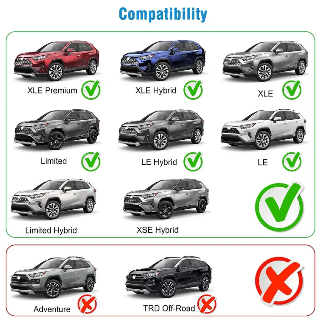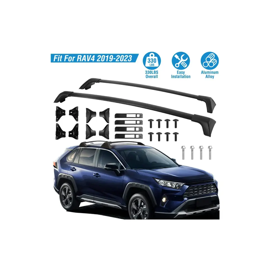 iMounTEK Aluminum Alloy Roof Rack Crossbars for Toyota RAV4 (2019-2024) Upgrade your Toyota RAV4 with the iMounTEK Aluminum Alloy Roof Rack Crossbars, designed for 2019-2024 models with side rails. Perfect for carrying bikes, kayaks, cargo boxes, snowboards, and more, these crossbars offer high durability and easy installation. Key Features: Wide Compatibility: Compatible with 2019-2024 Toyota RAV4 models equipped with side rails, ensuring a perfect fit. Heavy-Duty Aluminum Alloy: Made from high-grade aluminum alloy, these crossbars are 30% lighter than steel and provide superior strength. With .8-inch thickness and 2.76-inch width, they’re designed to last with a corrosion-resistant black matte powder coating. 330LBS High Load Capacity: Each crossbar supports up to 165 lbs, giving you ample capacity to carry heavy gear like bikes, kayaks, cargo bags, and surfboards. Easy to Assemble: Simple installation with clearly labeled parts for front, back, left, and right. The front crossbar is longer to accommodate the vehicle's size, and installation can be completed in 10-15 minutes. Low Wind Noise & Resistance: The curved edge design minimizes wind noise and resistance while maintaining the vehicle’s aesthetic appeal. Specifications: Material: Aluminum Alloy & ABS Color: Black Weight Capacity: 165 lbs per crossbar Crossbar Dimensions: 7cm width, 2cm thickness Package Includes: Front rail crossbar, rear rail crossbar, screws, and installation manual