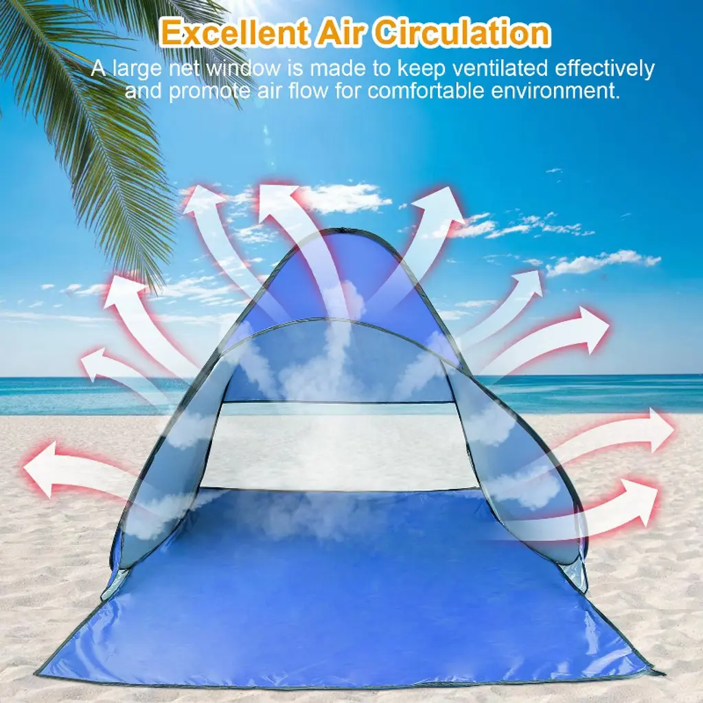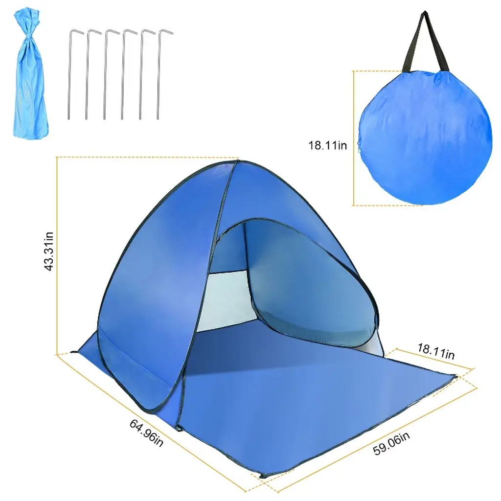 iMounTEK Pop-Up Beach Tent Sun Shade Shelter – Perfect for outdoor adventures, this pop-up tent provides a spacious and comfortable setup for 2-3 people (ideal for 2 adults or 3 kids). Whether you're at the beach, park, lake, camping, or enjoying a backyard retreat, this tent ensures you stay cool and protected from the sun. Key Features: Spacious Design: With an unfolding size of 5.41ft (L) x 4.92ft (W) x 3.61ft (H), this tent comfortably fits 2 adults or 3 kids, making it perfect for families or small groups. Breathable Net Window: Equipped with a net window, this tent promotes excellent airflow to keep the interior cool and ventilated, especially on warm summer days, while also protecting against insects. Instant Setup & Easy Storage: No tools are required—simply pop up the tent for quick setup. It also comes with 6 ground nails to securely anchor it, plus a round carry bag for easy storage and transportation. Durable & Reliable: Constructed from high-quality silver-coated polyester oxford fabric and reinforced with sturdy steel wire frames, this tent is sun-proof (UPF 50+), water-resistant, tear-resistant, and built to last. Versatile Use: Ideal for a variety of outdoor activities including beach trips, park outings, hiking, fishing, camping, music festivals, sporting events, or just relaxing at home or in your backyard. Specifications: Brand: iMounTEK Product Type: Pop-Up Beach Tent Color: Blue Material: 190T Silver Coated Polyester Oxford Cloth, Steel Wire Sun Protection Factor: UPF 50+ Capacity: Fits 2 Adults or 3 Kids Ground Nail Dimensions: 0.5cm/0.2in (diameter), 15cm/5.91in (length) Storage Bag Size: 46 x 46cm/18.11 x 18.11in Net Window Size: 44 x 150cm/17.32 x 59.06in Tent Size: 165 x 150 x 110cm/64.96 x 59.06 x 43.31in Item Weight: 830g/1.83lbs Package Size: 45 x 45 x 3cm/17.72 x 17.72 x 1.18in Package Weight: 1059g/2.33lbs Package Includes: 1 x Pop-Up Beach Tent 6 x Ground Nails 1 x Storage Bag