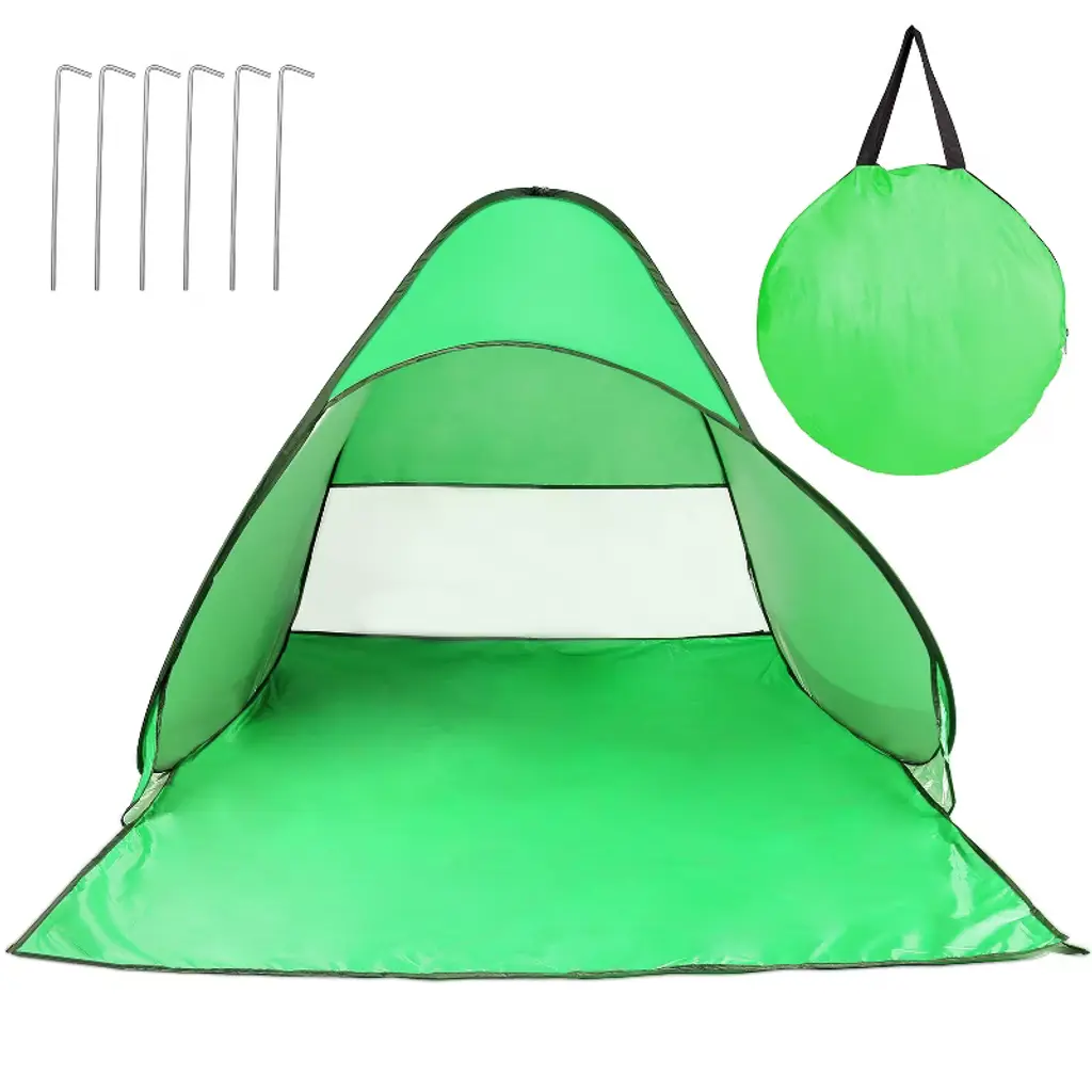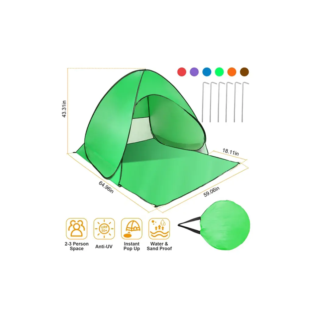 iMounTEK Pop-Up Beach Tent Sun Shade Shelter – Perfect for outdoor adventures, this pop-up tent provides a spacious and comfortable setup for 2-3 people (ideal for 2 adults or 3 kids). Whether you're at the beach, park, lake, camping, or enjoying a backyard retreat, this tent ensures you stay cool and protected from the sun. Key Features: Spacious Design: With an unfolding size of 5.41ft (L) x 4.92ft (W) x 3.61ft (H), this tent comfortably fits 2 adults or 3 kids, making it perfect for families or small groups. Breathable Net Window: Equipped with a net window, this tent promotes excellent airflow to keep the interior cool and ventilated, especially on warm summer days, while also protecting against insects. Instant Setup & Easy Storage: No tools are required—simply pop up the tent for quick setup. It also comes with 6 ground nails to securely anchor it, plus a round carry bag for easy storage and transportation. Durable & Reliable: Constructed from high-quality silver-coated polyester oxford fabric and reinforced with sturdy steel wire frames, this tent is sun-proof (UPF 50+), water-resistant, tear-resistant, and built to last. Versatile Use: Ideal for a variety of outdoor activities including beach trips, park outings, hiking, fishing, camping, music festivals, sporting events, or just relaxing at home or in your backyard. Specifications: Brand: iMounTEK Product Type: Pop-Up Beach Tent Color: Green Material: 190T Silver Coated Polyester Oxford Cloth, Steel Wire Sun Protection Factor: UPF 50+ Capacity: Fits 2 Adults or 3 Kids Ground Nail Dimensions: 0.5cm/0.2in (diameter), 15cm/5.91in (length) Storage Bag Size: 46 x 46cm/18.11 x 18.11in Net Window Size: 44 x 150cm/17.32 x 59.06in Tent Size: 165 x 150 x 110cm/64.96 x 59.06 x 43.31in Item Weight: 830g/1.83lbs Package Size: 45 x 45 x 3cm/17.72 x 17.72 x 1.18in Package Weight: 1059g/2.33lbs Package Includes: 1 x Pop-Up Beach Tent 6 x Ground Nails 1 x Storage Bag
