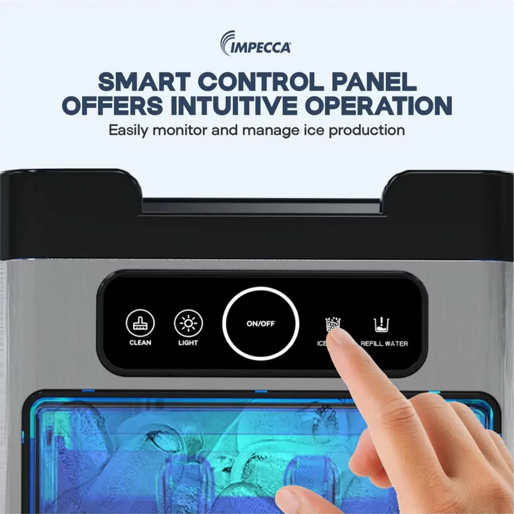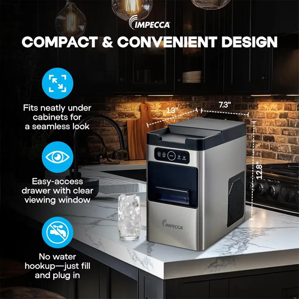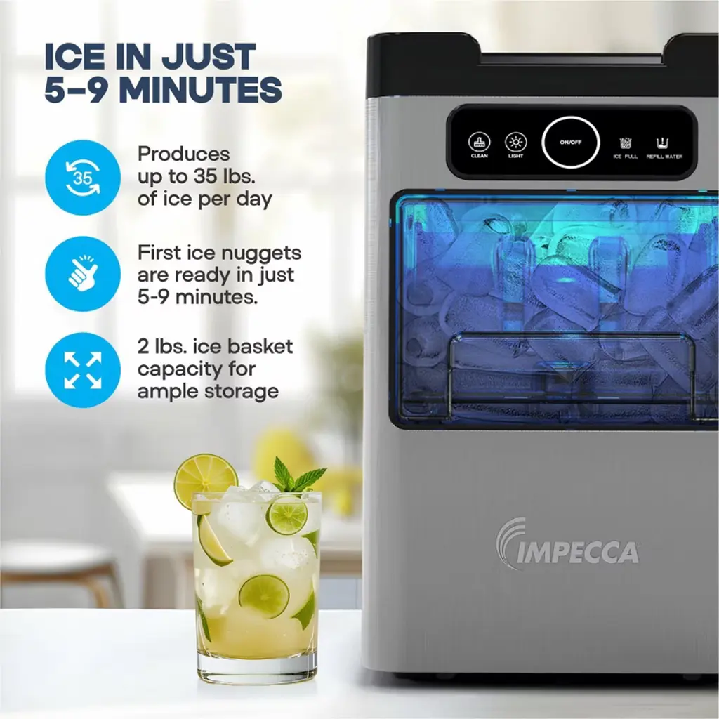 Enjoy soft, chewable, restaurant-quality nugget ice right at home with the IMPECCA IIM-3301ST Mini Soft Nugget Ice Maker. Compact in size but big on performance, this sleek ice maker produces up to 35 pounds of fresh nugget ice per day, with the first batch ready in as little as 5 minutes. Designed for convenience, the drawer-style access, transparent viewing window, and intuitive touch panel make ice-making effortless—no water line required. Simply plug it in, fill the reservoir, and let it work. The automatic self-cleaning function keeps your ice tasting fresh and your machine running smoothly. With a 2-pound ice basket and stylish matte finish, the IIM-3301ST looks as good as it performs—perfect for kitchens, home bars, RVs, and more.
