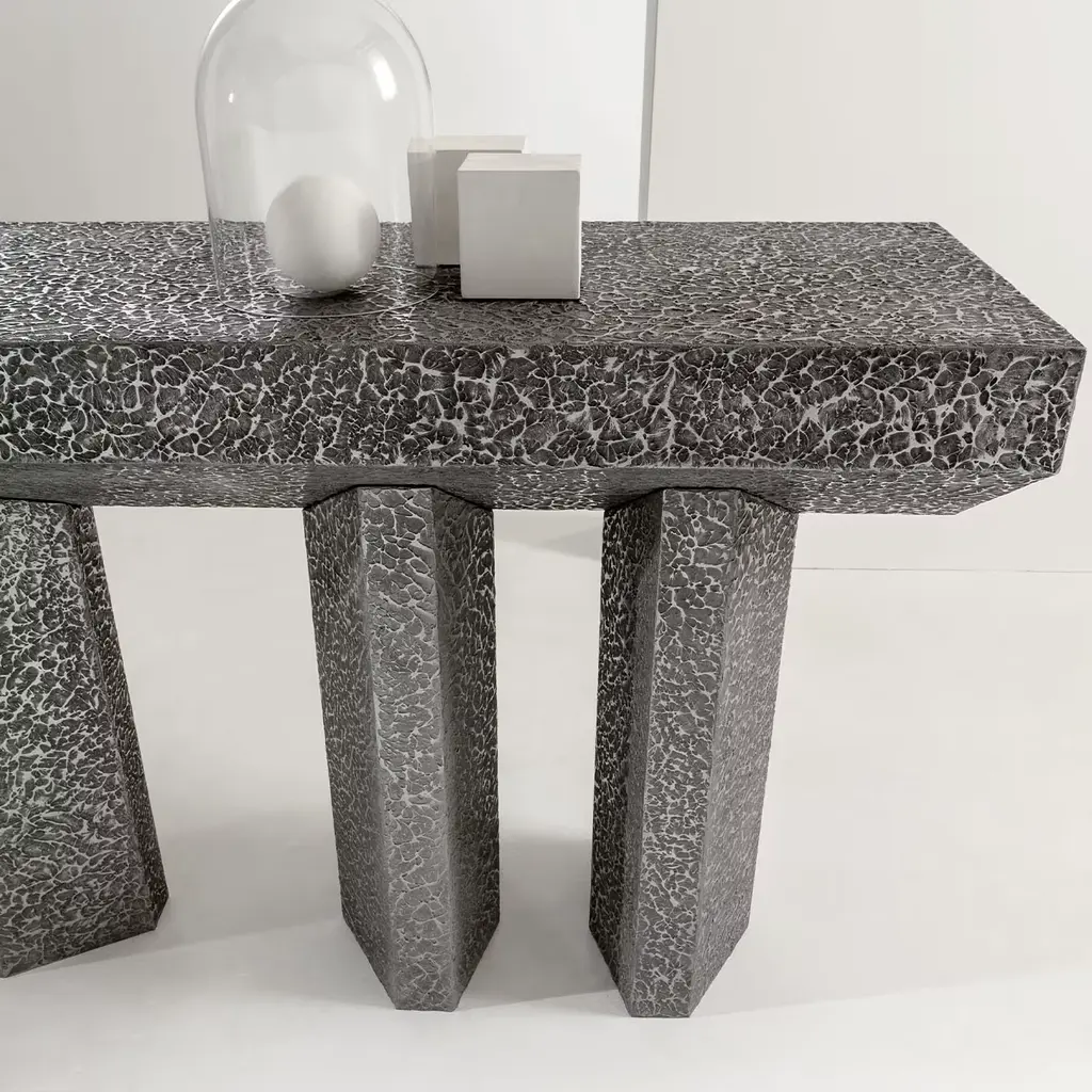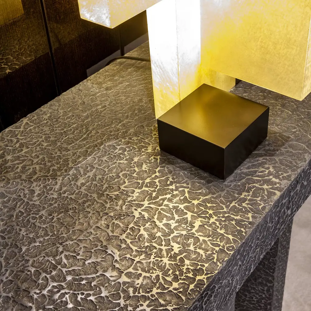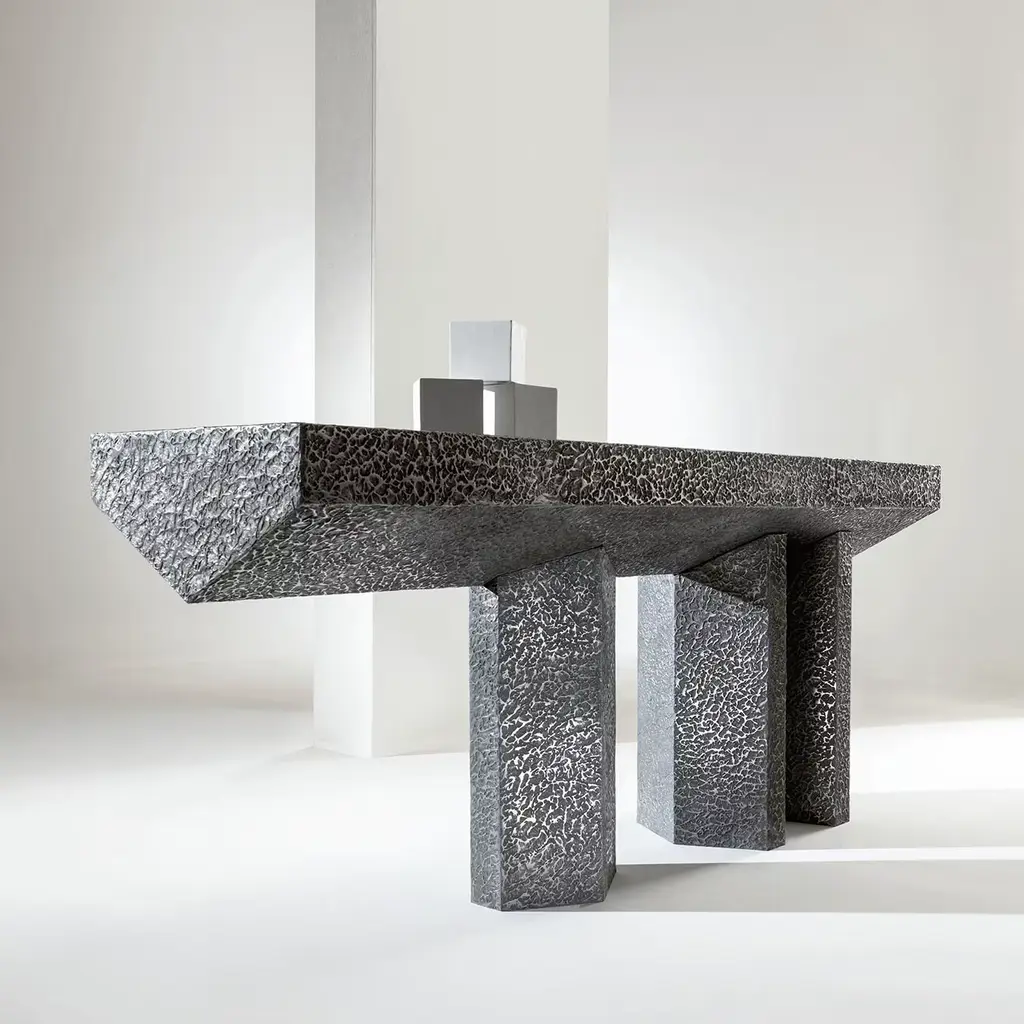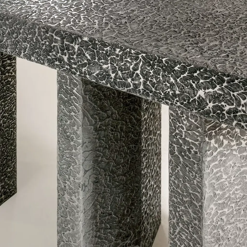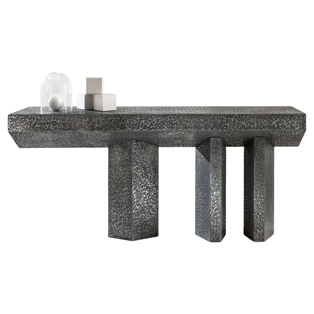 Rigorously sculpted edges outline the dynamic asymmetrical design of this console. A stunning sculptural addition to contemporary entryways, it boasts an extensive tin layer characterized by a special Efesto carving effect. Striking in its bold geometric impact, it comes in a variety of finishing options and RAL colors that can be explored with the Concierge. Design by Romani Saccani Architetti Associati. This piece is currently on show and immediately available at Artemest Galleria New York.