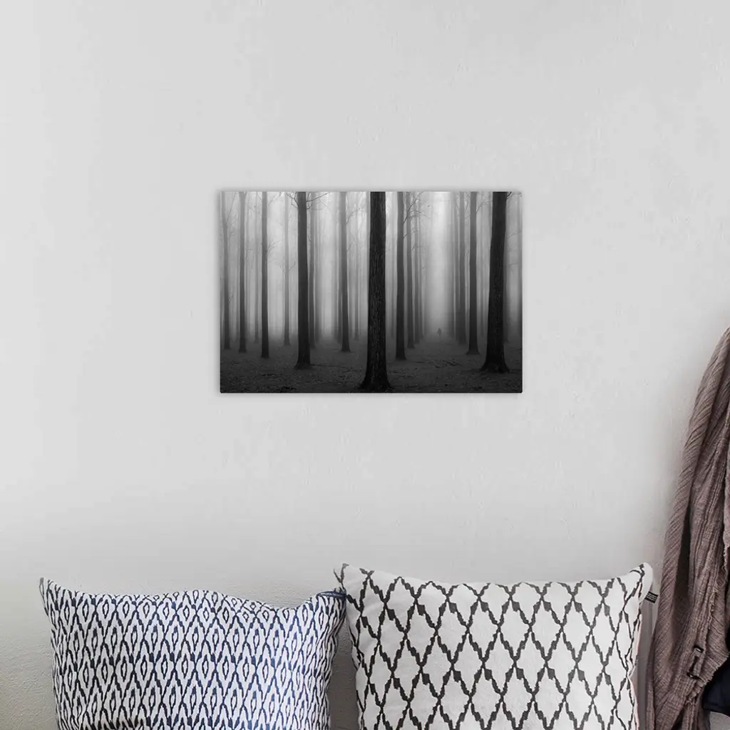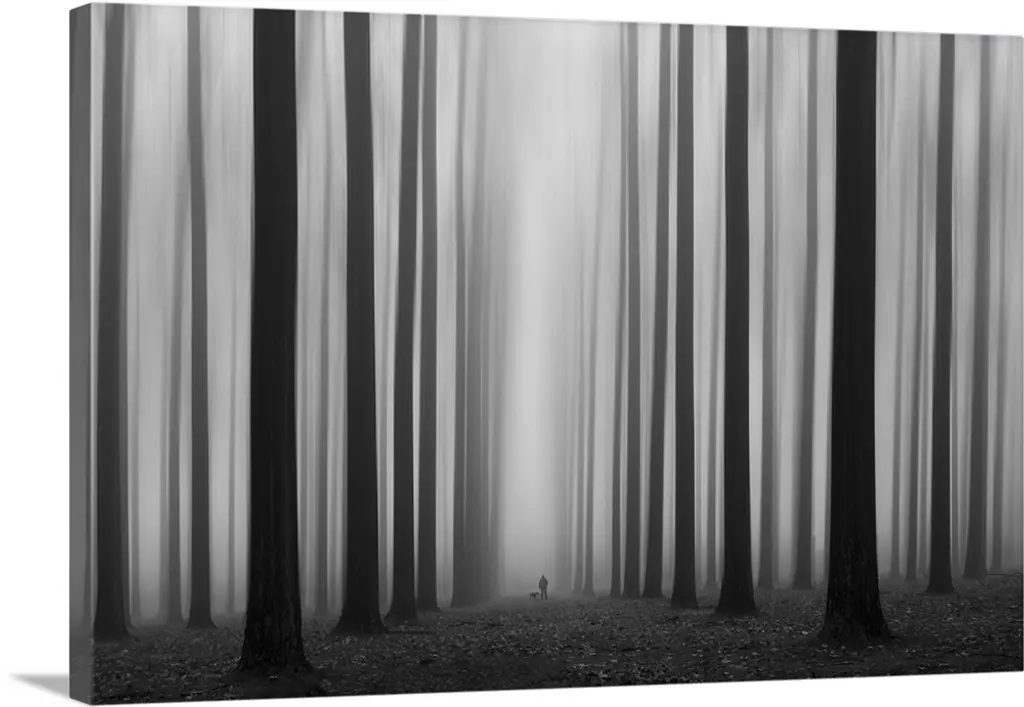 A silhouetted figure walks through a foggy forest of tall thin trees in rows.