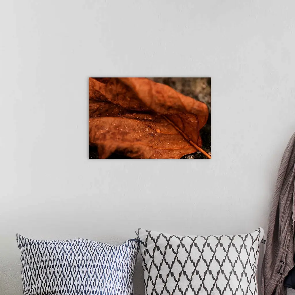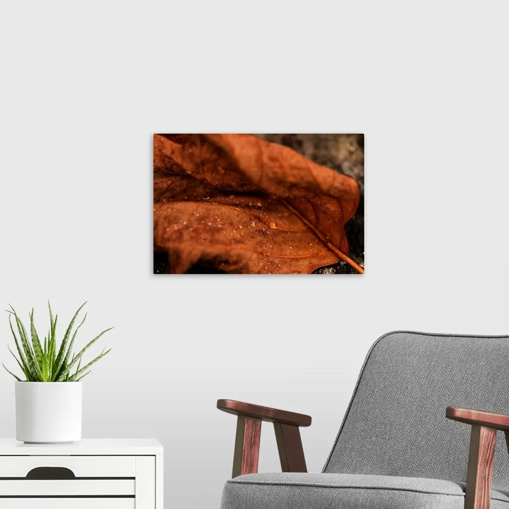 Fine art photo of a leaf with dew drops in the creases, close up.