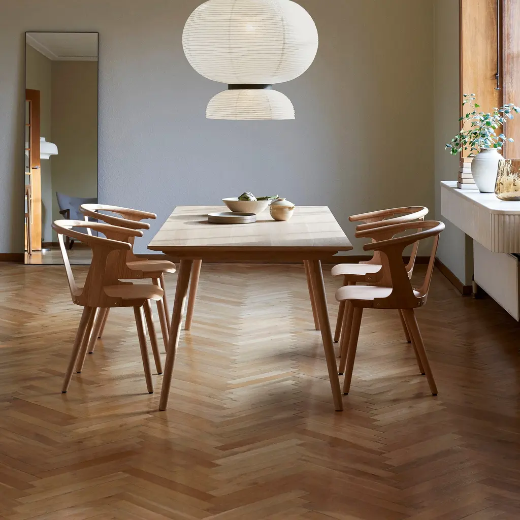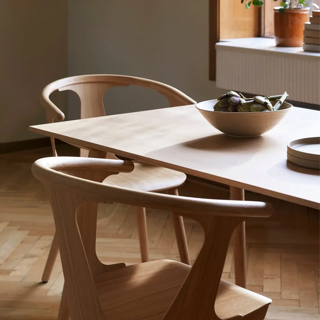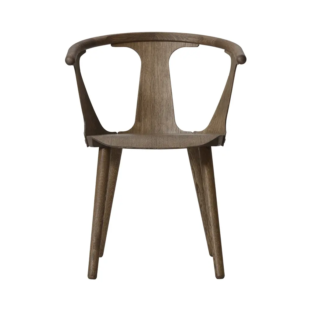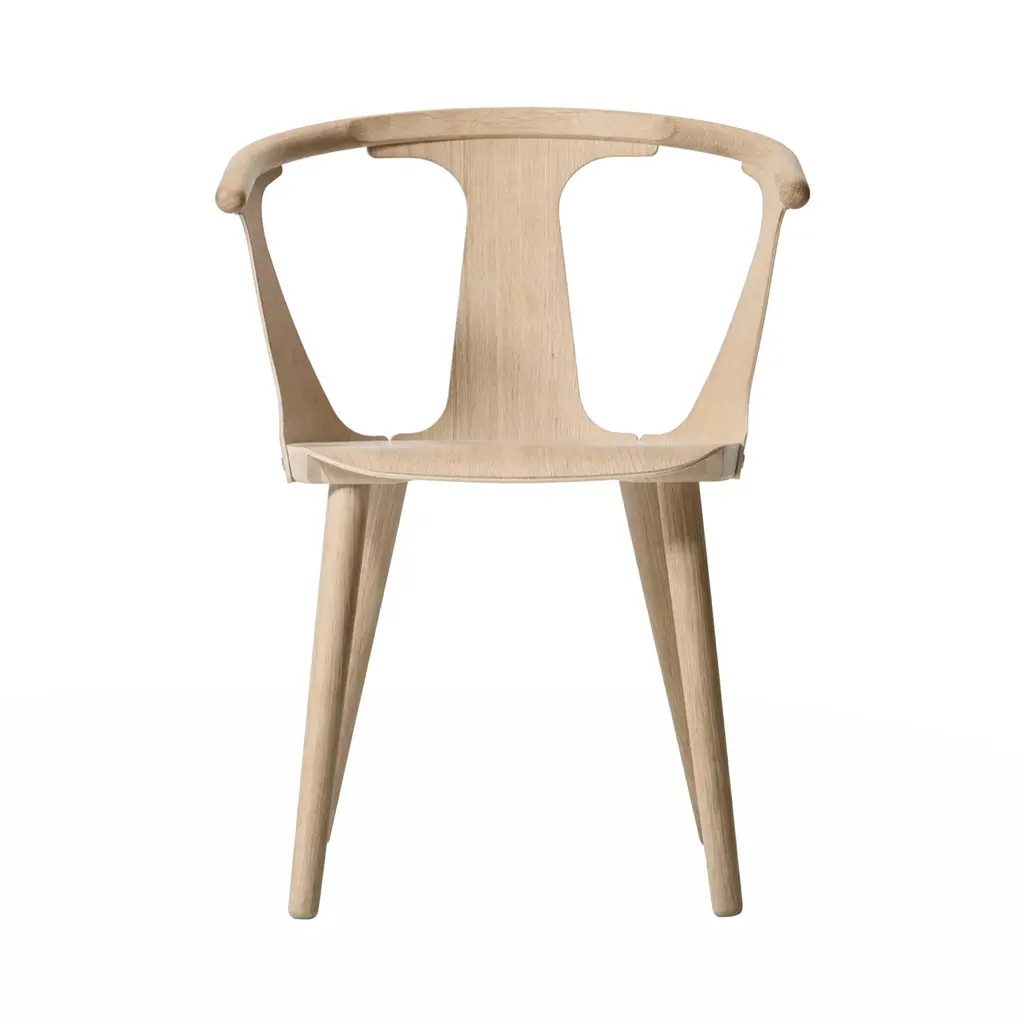 Helsinki-born Sami Kallio rightfully named his chair the In Between, reflecting its perfect balance between methods of manufacturing, design and aesthetics. It's produced by way of hand and machine. There is the wood turning, a classic technique using a lathe for greater detail. Compression molding is also applied, allowing for strength despite the lightness of the thin frame. It's no accident that ash and oak, which Sam uses for this chair, respond very well to these techniques. Dynamically angled legs provide balance and equilibrium of form to the low-swung, crescent back, the armrest and very slightly pitched seat pan. The back and side panels offer solid support and a visual shape that is contrasted by the gaps. This play of positive and negative space further illustrates the In Between notion.If the semicircular rail brings to mind that 1949 Danish icon the Wishbone Chair (a.k.a. the Y Chair), Sam freely admits his regard for designer master Hans Wegner. Yet Sam also pushes his In Between forward with a more graphic, modular and lighter form.In Between is part of the "Between Gaps" series by this award-winning designer, who is now based in in Gothenburg, Sweden, and is produced by &Tradition in Copenhagen.