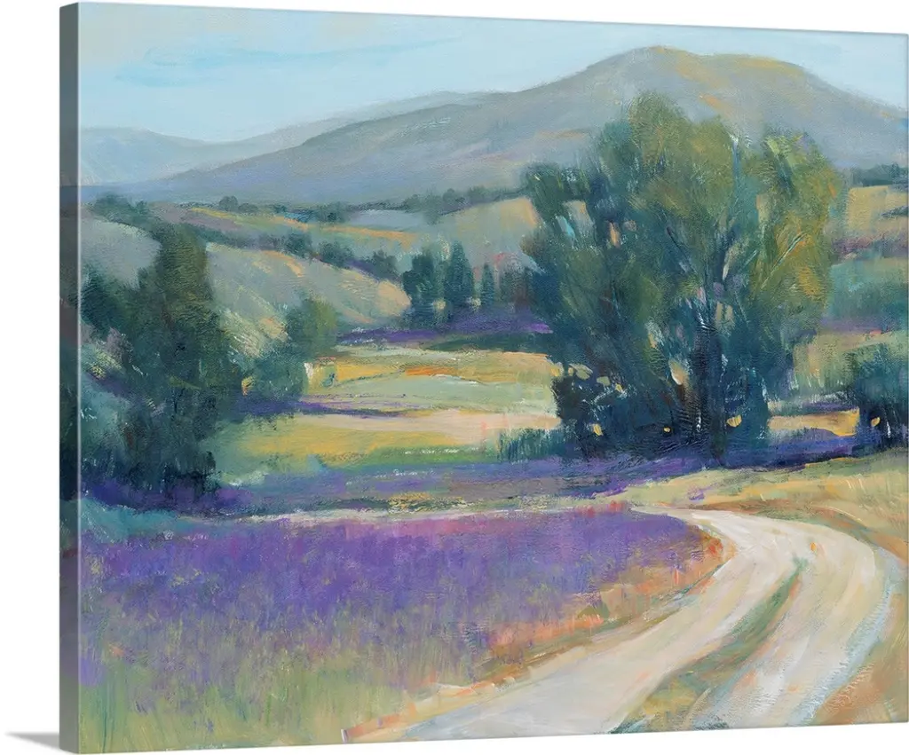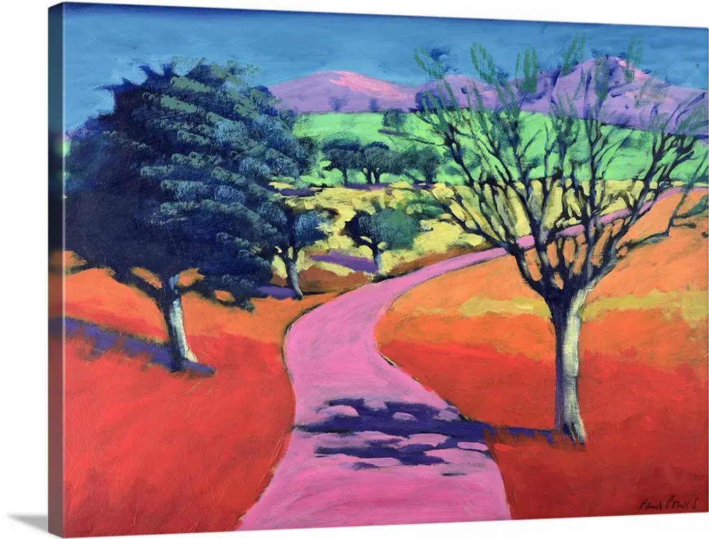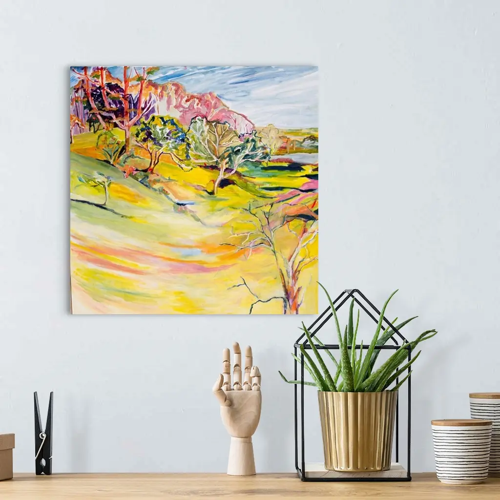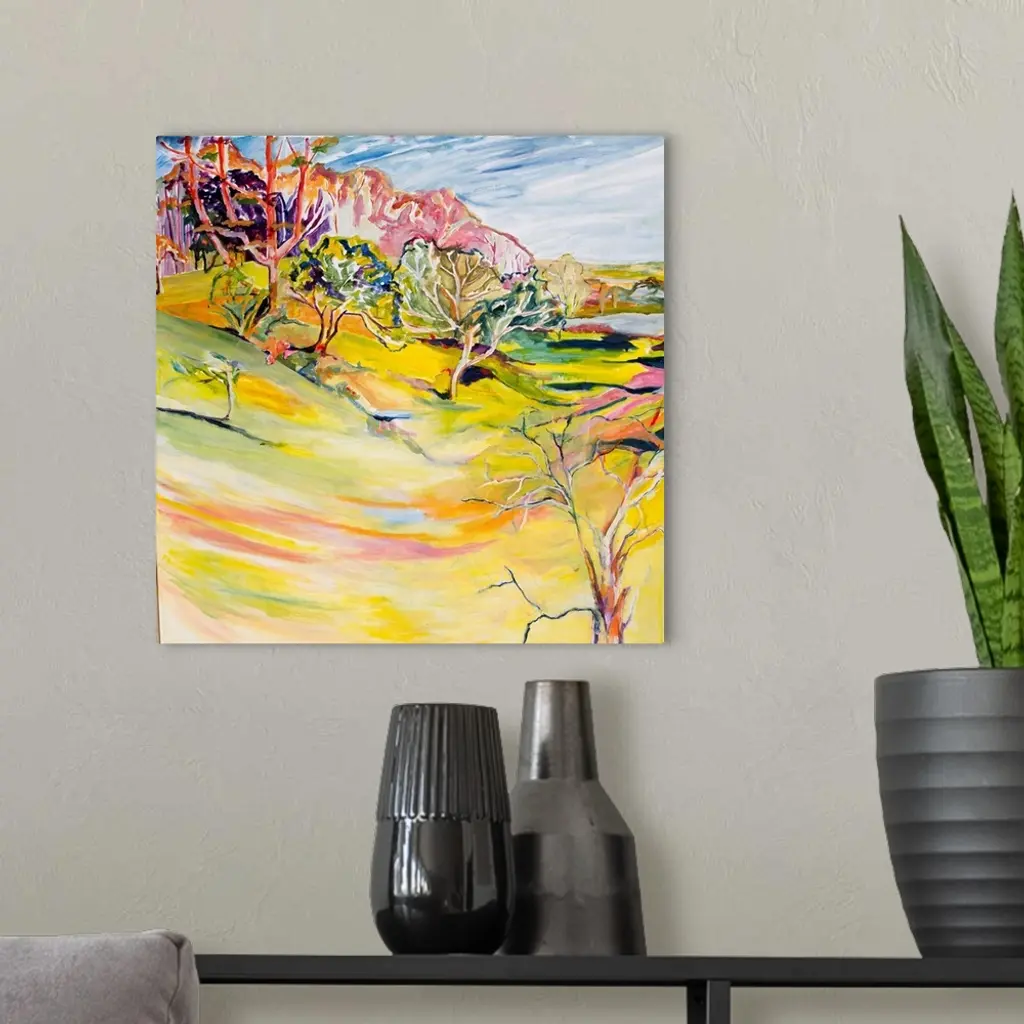A contemporary landscape with a golden foreground and richly colored trees and plants.