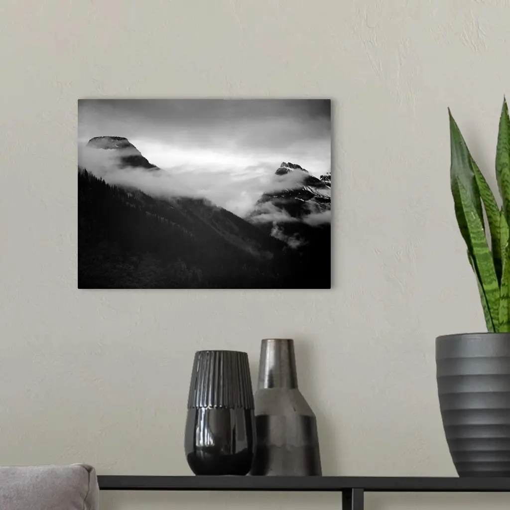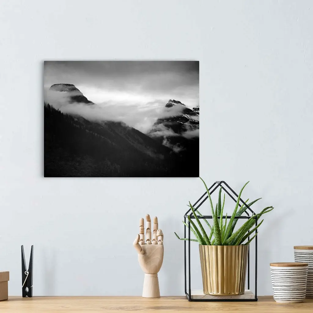 In Glacier National Park, mountain partially covered with clouds.