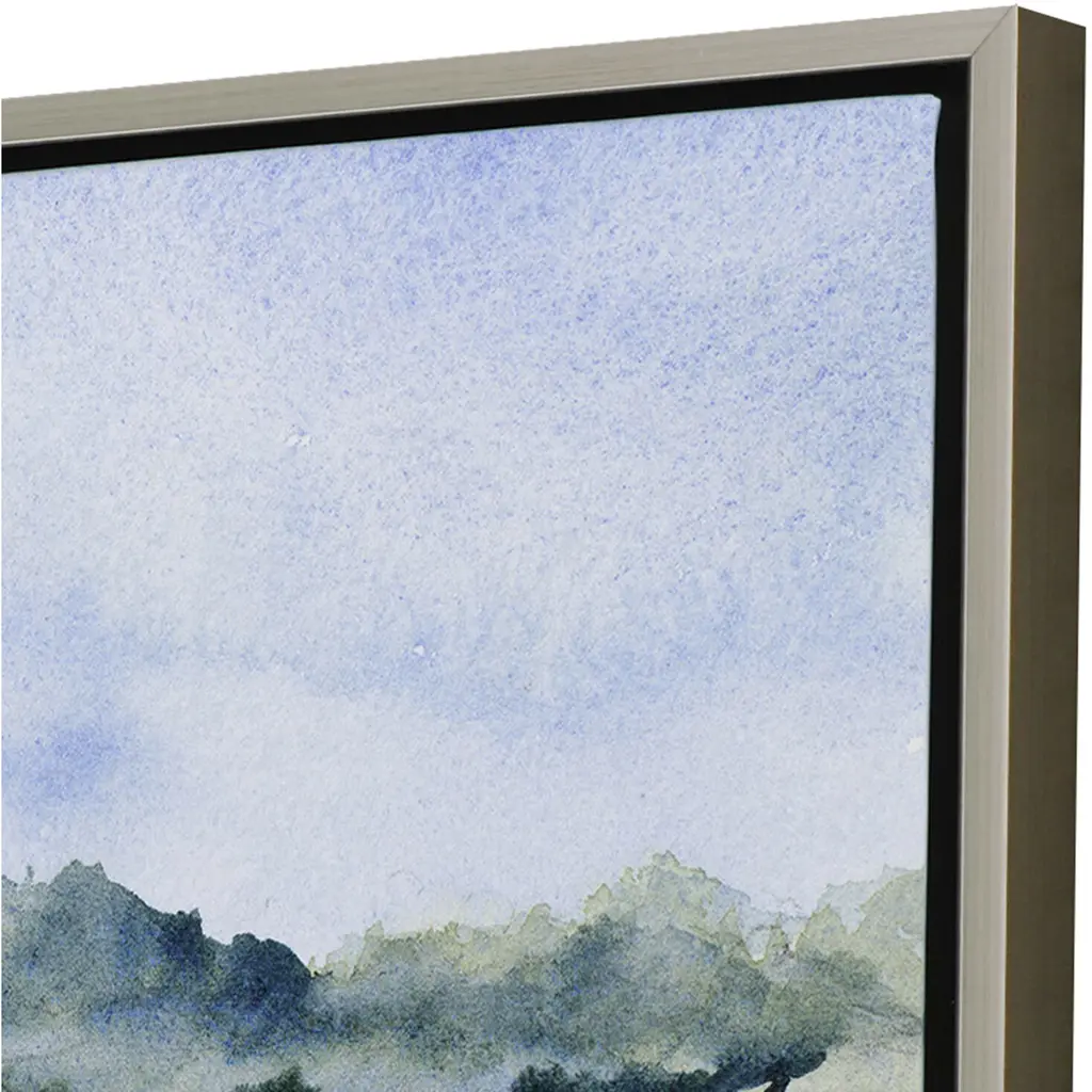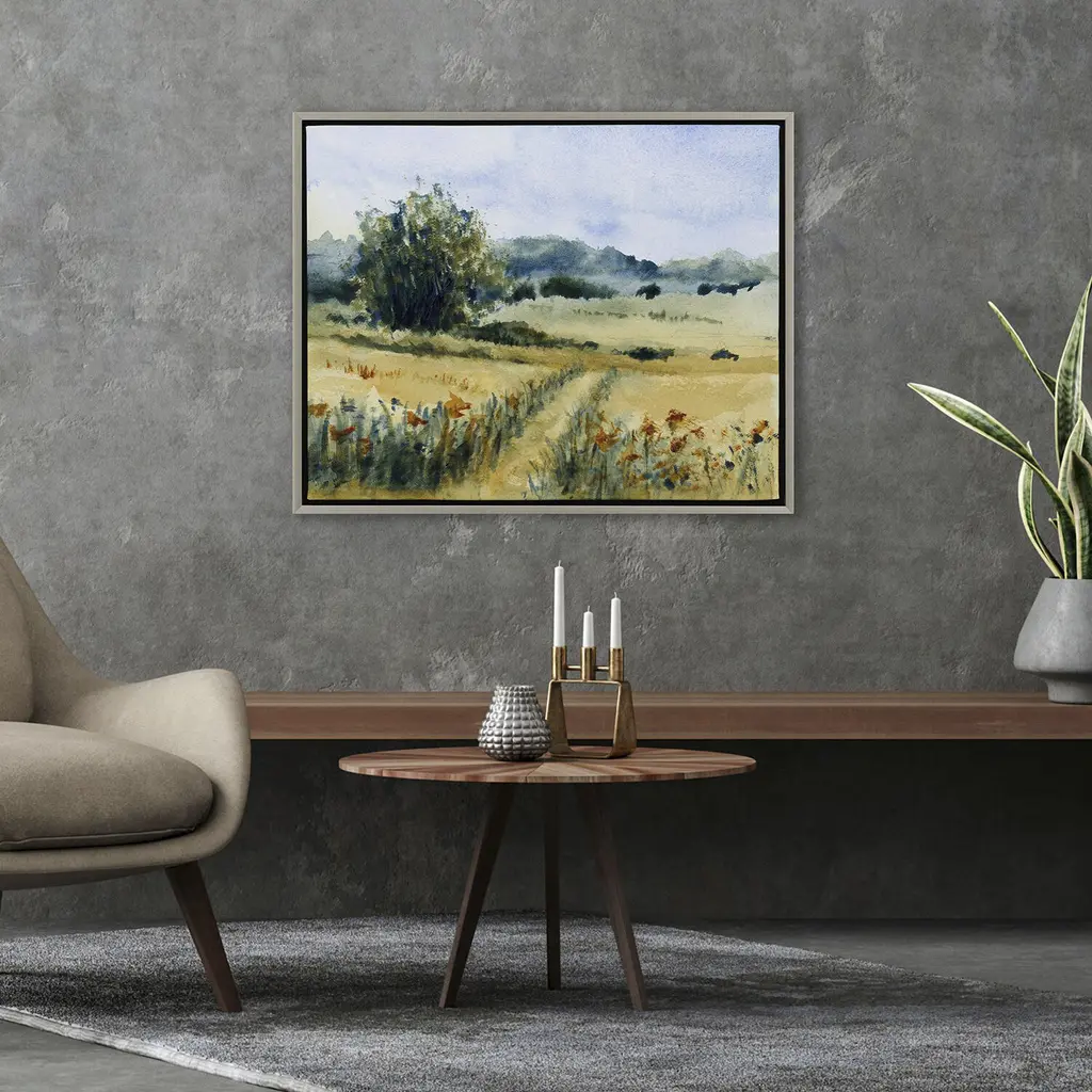 A gracious country meadow grants a silent respite. Canvas is wrapped around wood stretcher bars and mounted in a brushed silver floater frame.