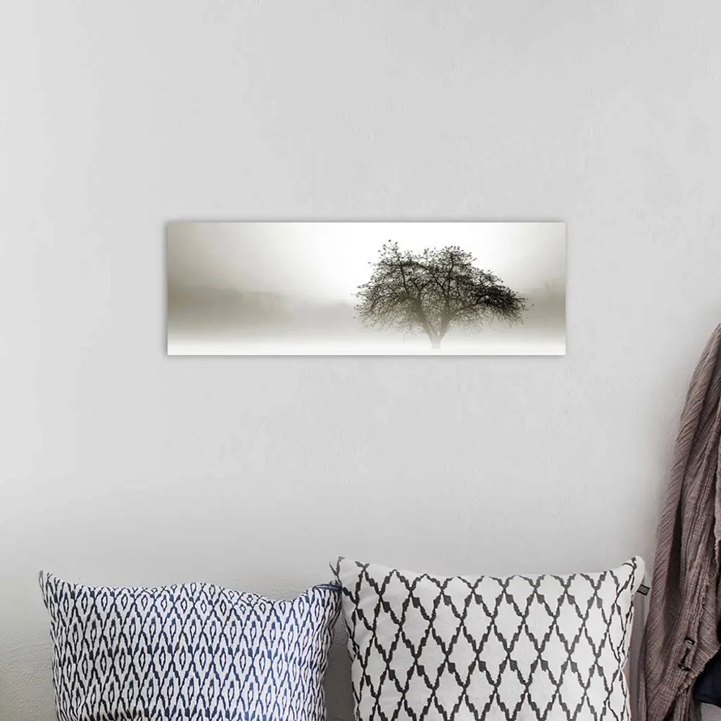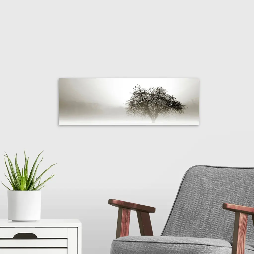 Panoramic photograph of tree silhouette in fog with barely visible forest in the distance.