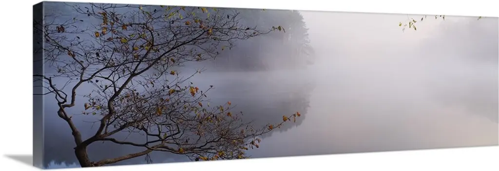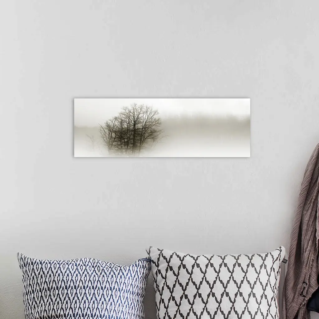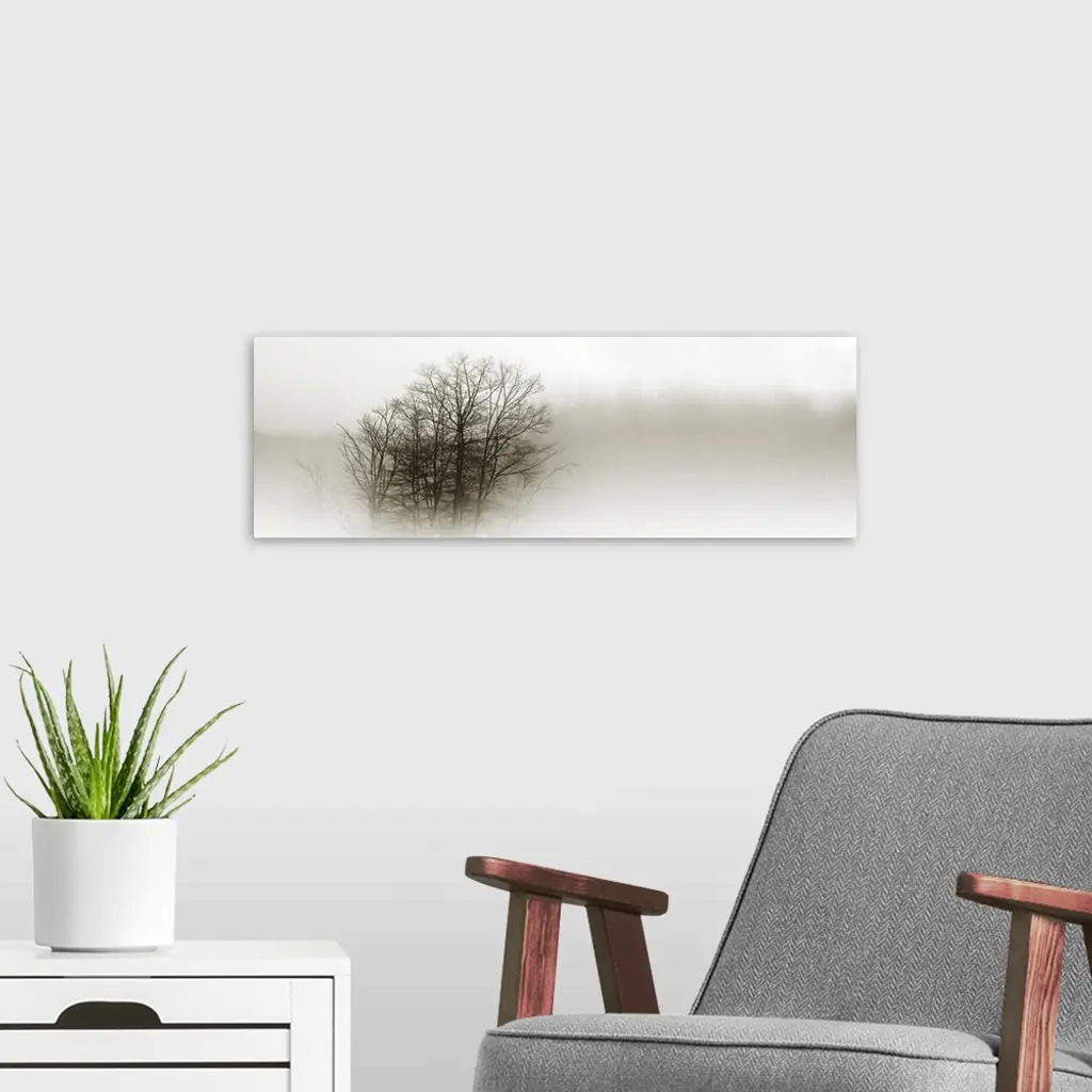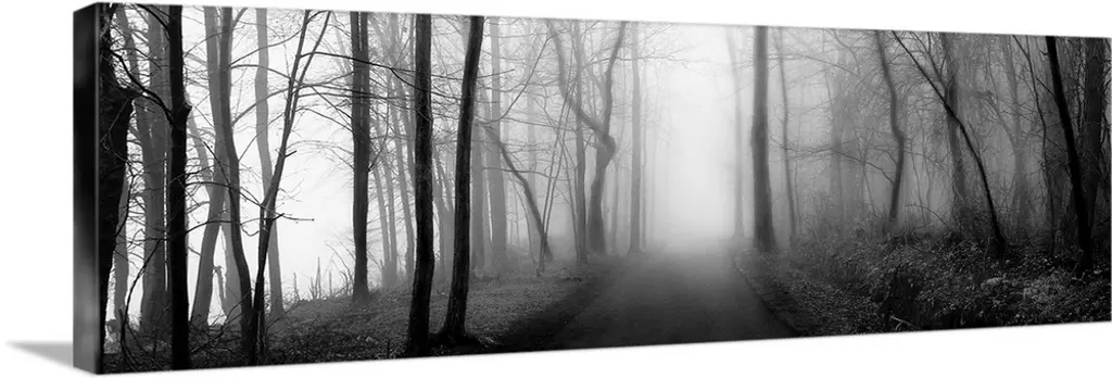 Eerie black-and-white panoramic photograph of the silhouettes of trees shrouded in fog.