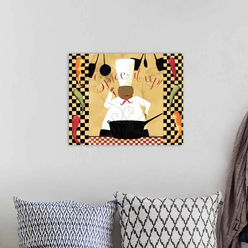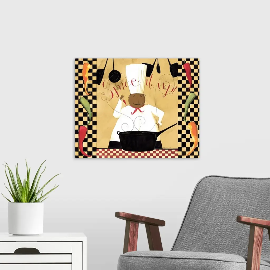 Happy chef standing in front of a sauce pan with steam rising from it. With the words "Spice it up" at the top of the image.