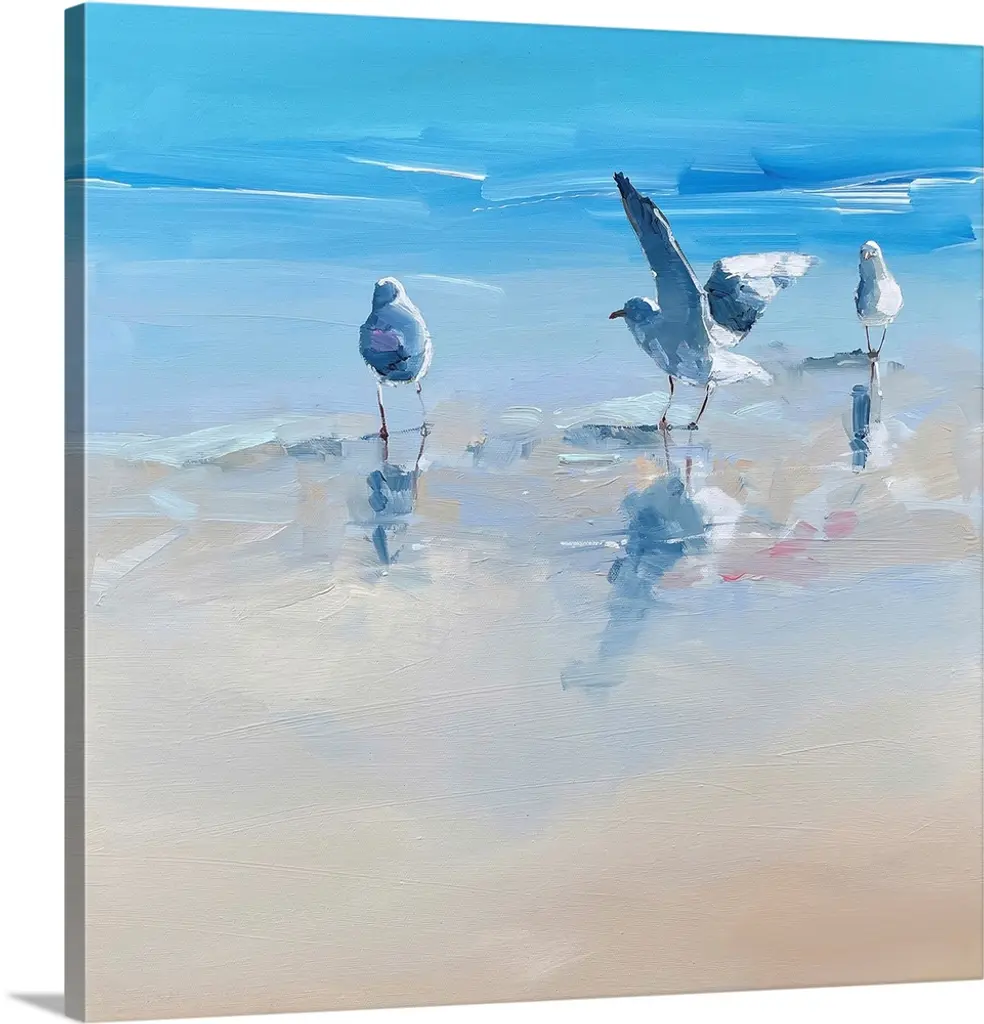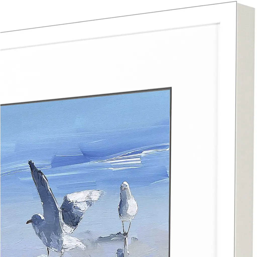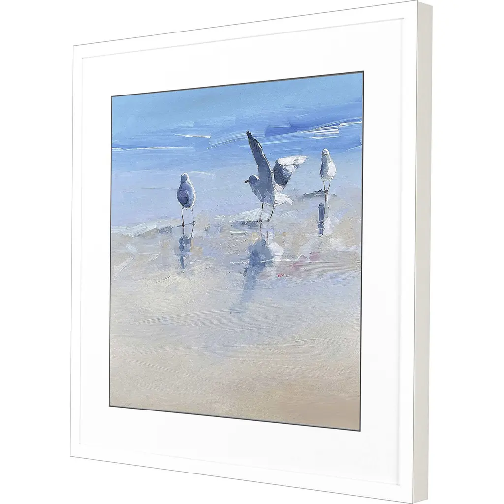 Seagulls cheerfully play along the beach at the shore. Matted in white and framed in a lacquered white wood shadow box style moulding.