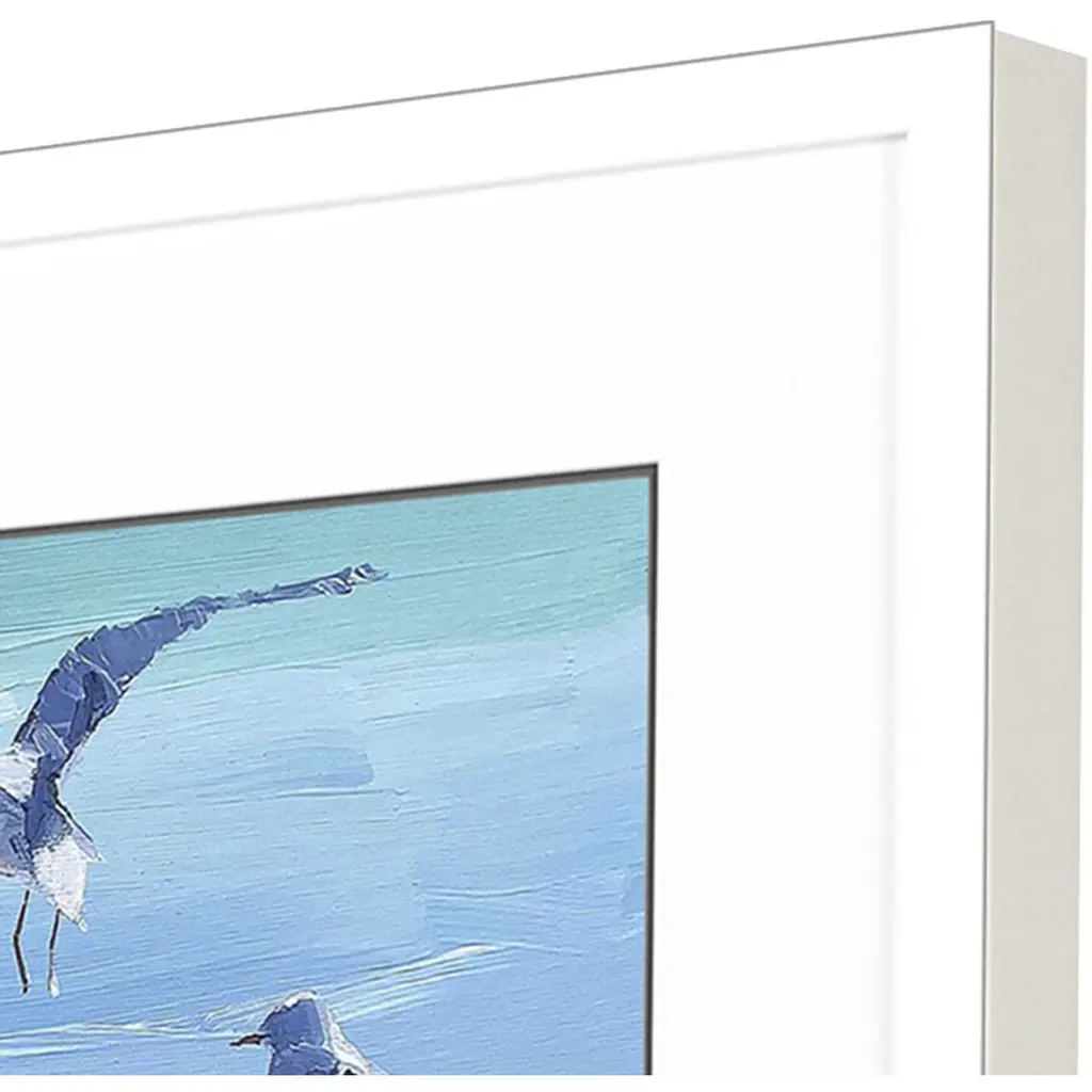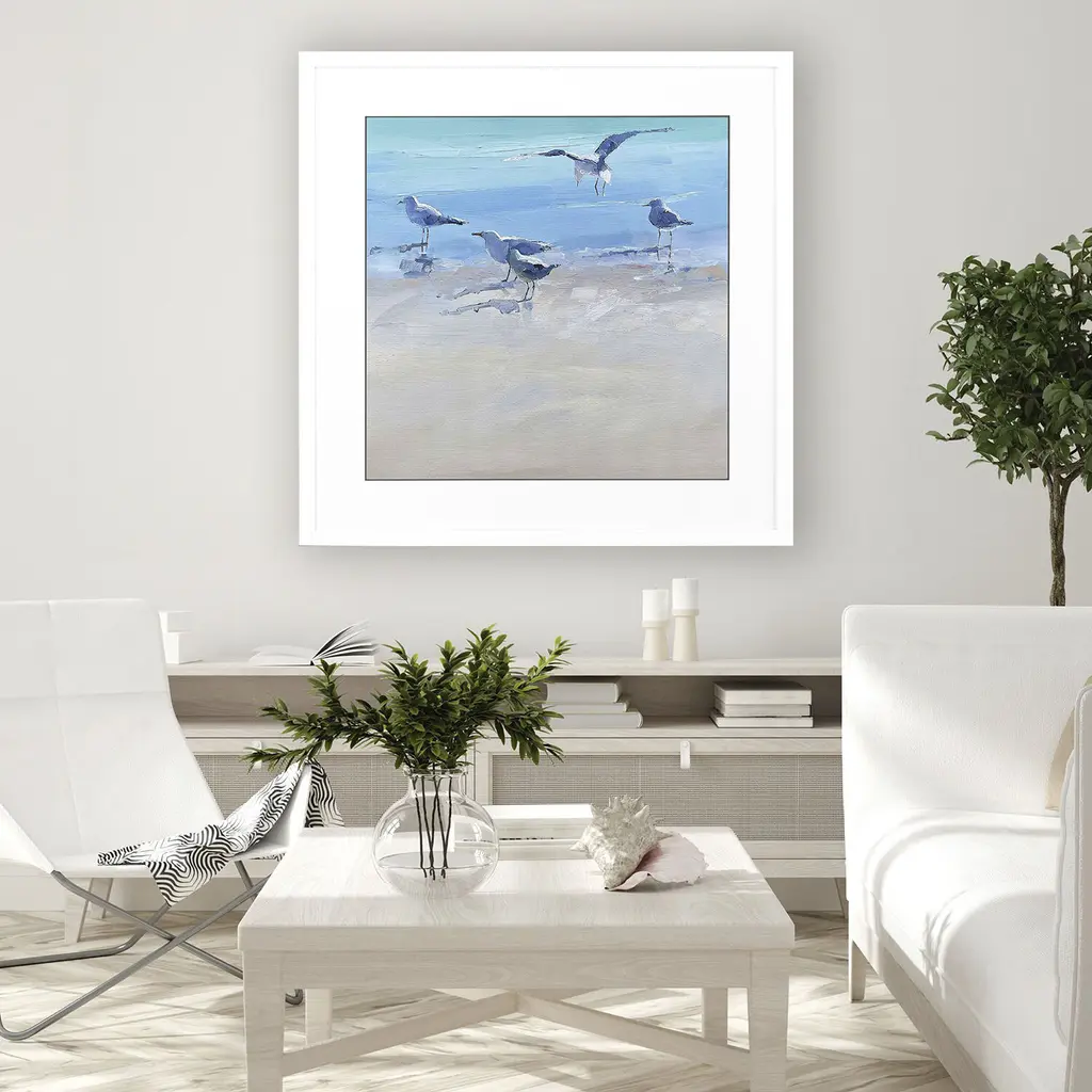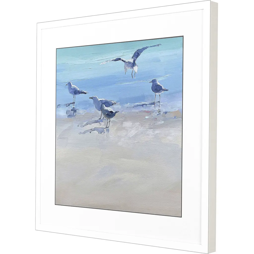 Seagulls cheerfully play along the beach at the shore. Matted in white and framed in a lacquered white wood shadow box style moulding.