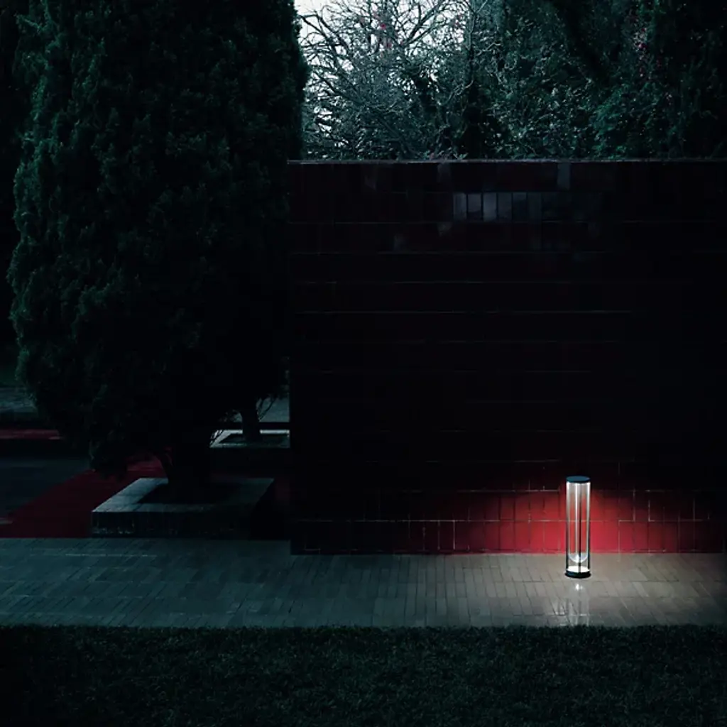 The In Vitro LED Bollard by FLOS is an airy, architectural design from Philippe Starck that draws on the classic combination of a glass globe that houses a visible lightbulb. Removing the lightbulb, this piece creates a voluminous space for light to fill, housing an integrated opalescent diffuser at the top of an open metal frame that a borosilicate glass shade is set within. Made from die-cast and extruded aluminum and treated with a chemical conversion process, the frame of this design is built to withstand the elements.