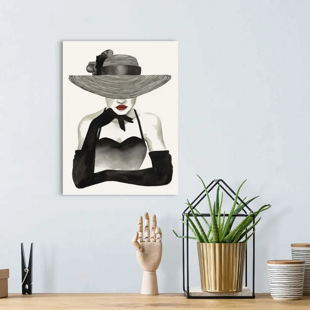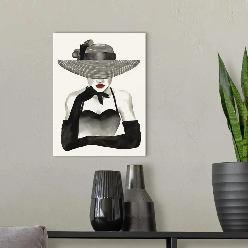 Fashion docor image of a slender woman wearing elbow length black gloves and a large straw hat. Her eyes are covered, giving her an enigmatic look. The perfect look for a contemporary bathroom, bedroom or dressing room.