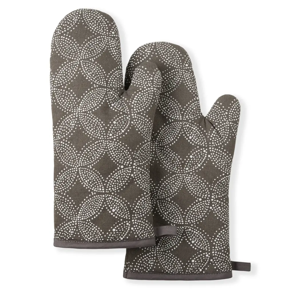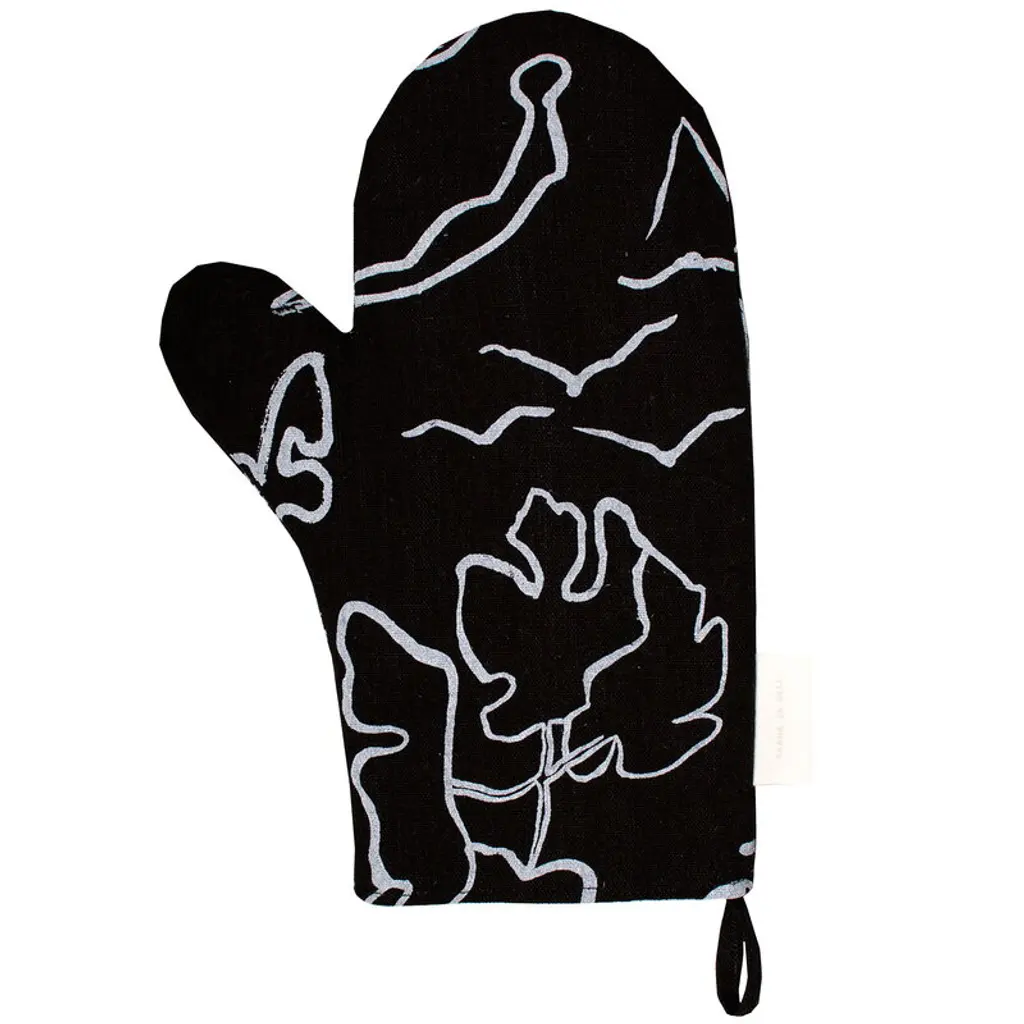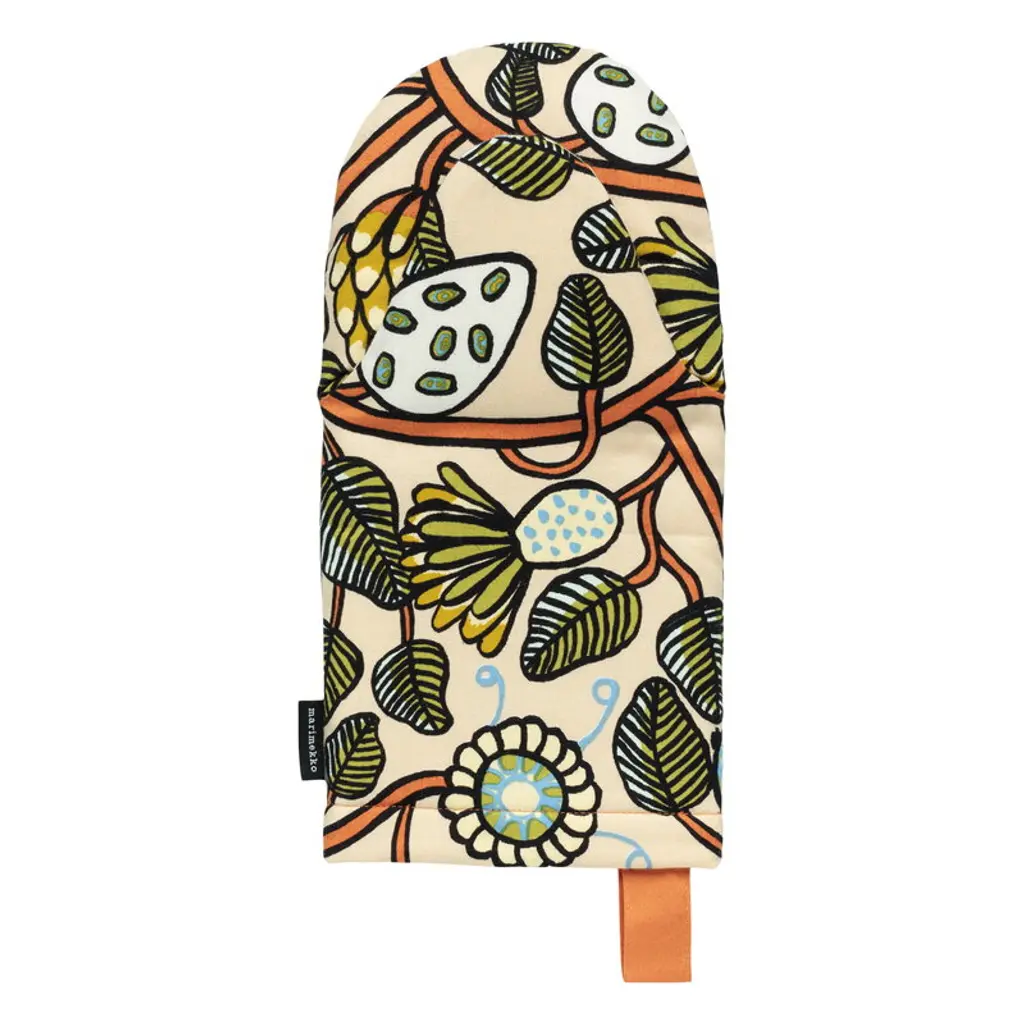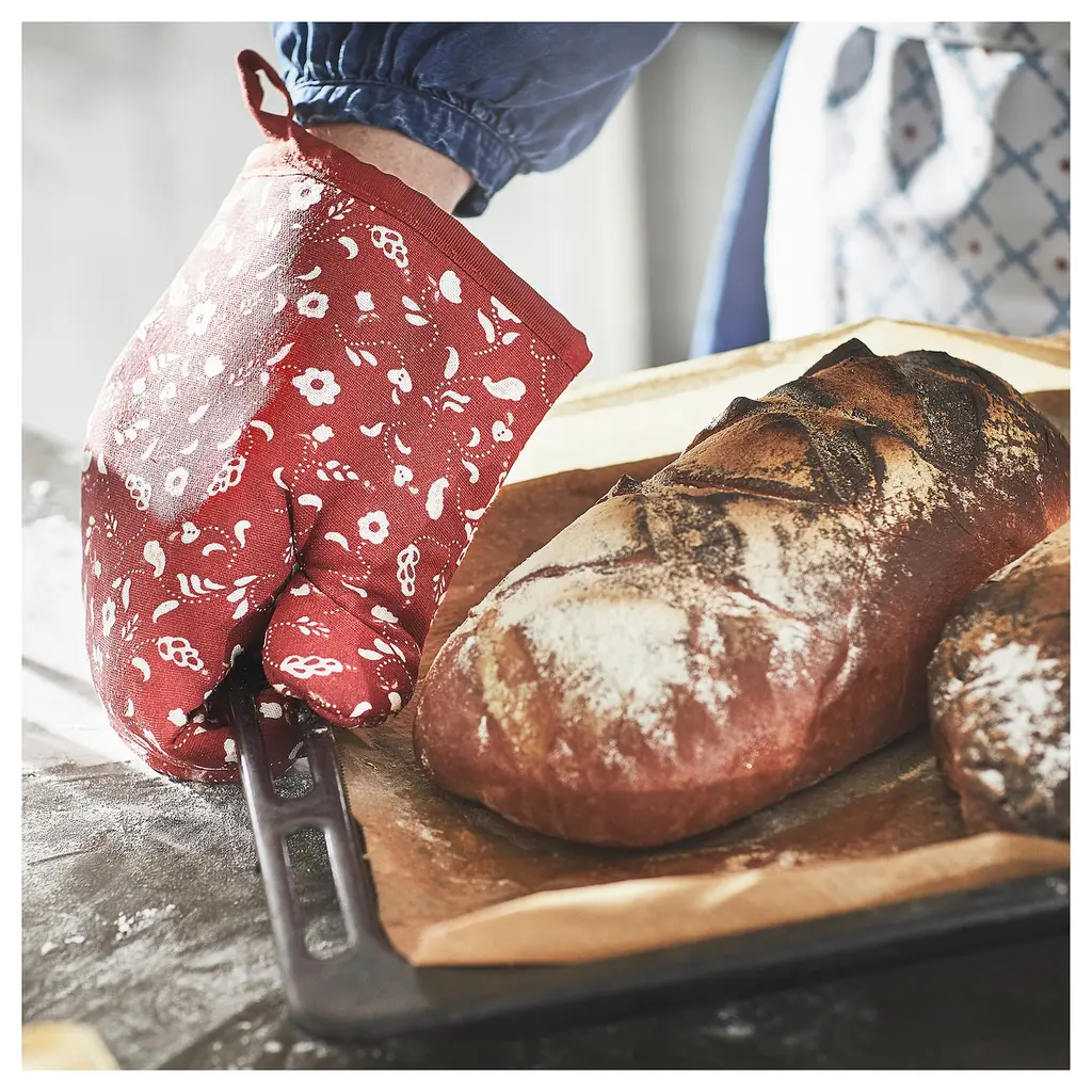 INAMARIA Oven mitt - patterned/red. Convenient for both right or left-handed use. Felted polyester layer in between gives very good heat insulation. With loop for hanging and easy storing when not in use.