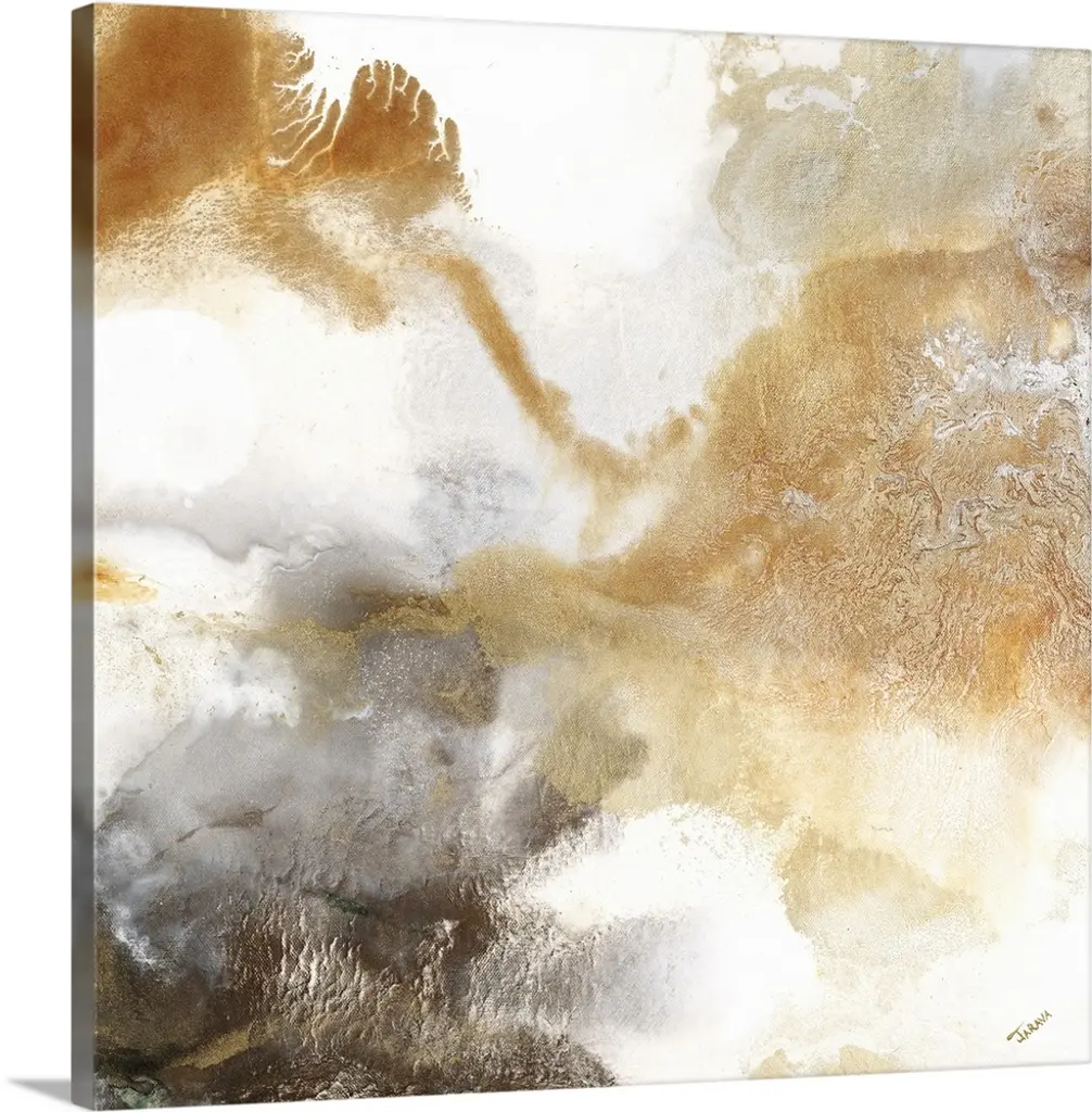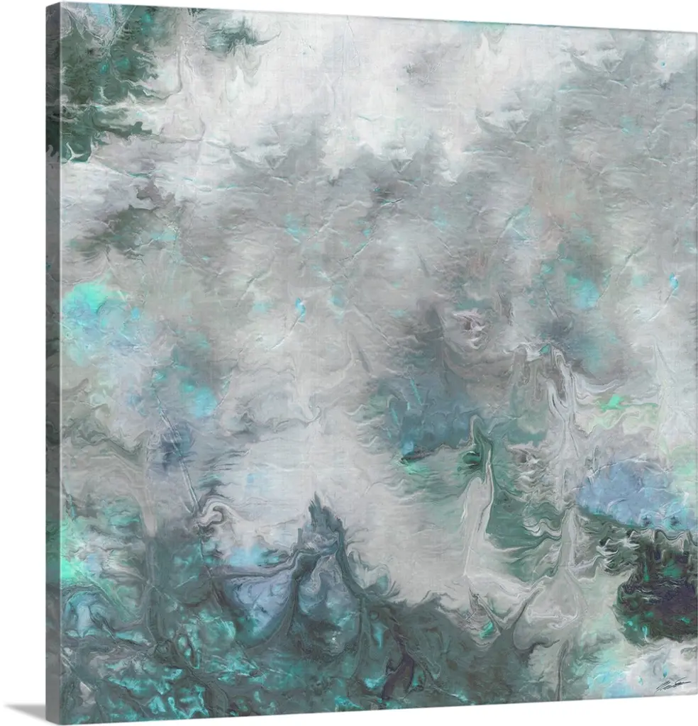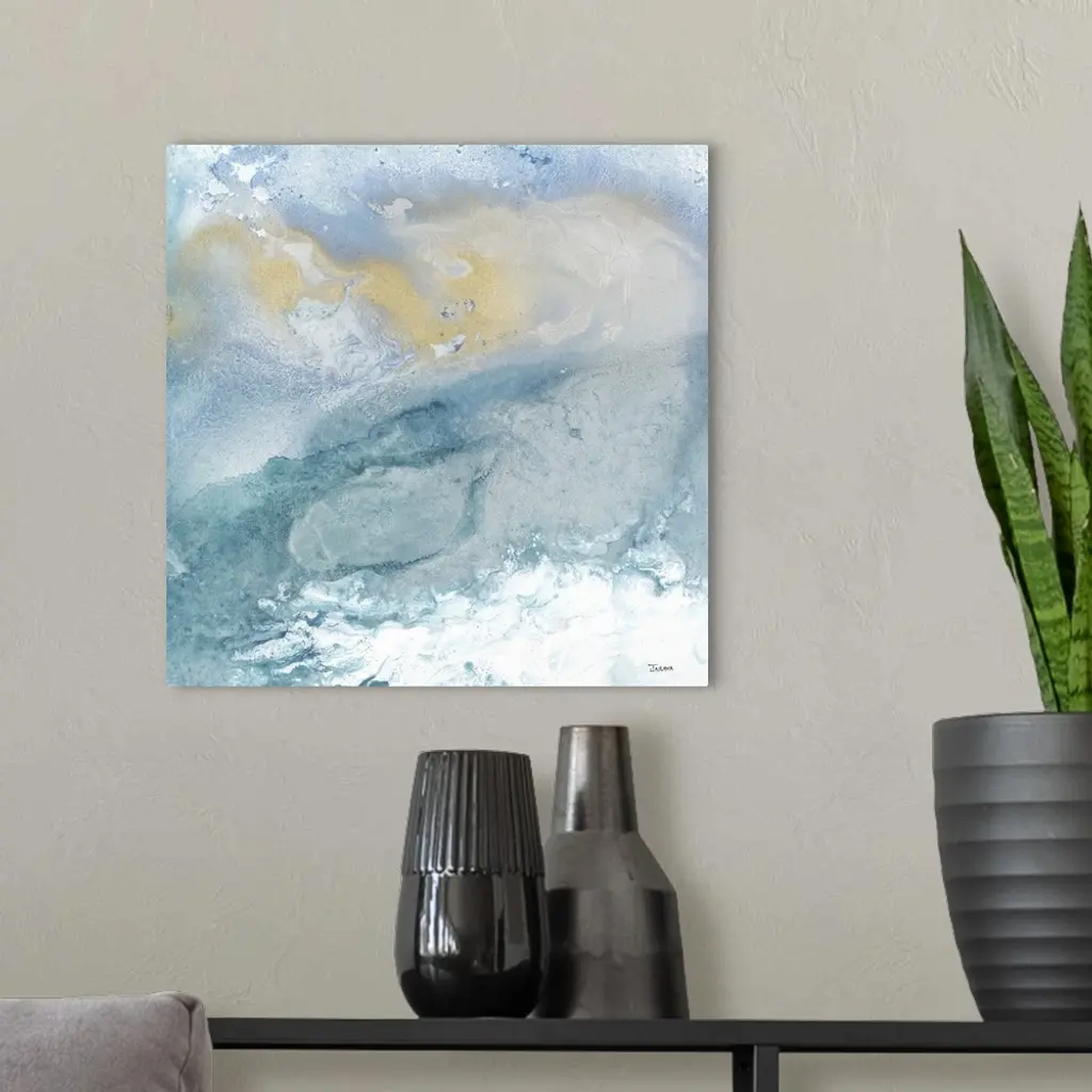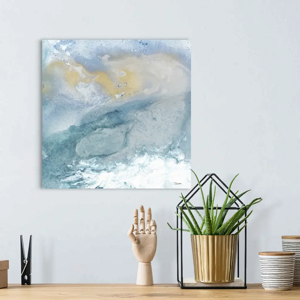 Square abstract art in shades of blue, gray, white, and gold forming together.
