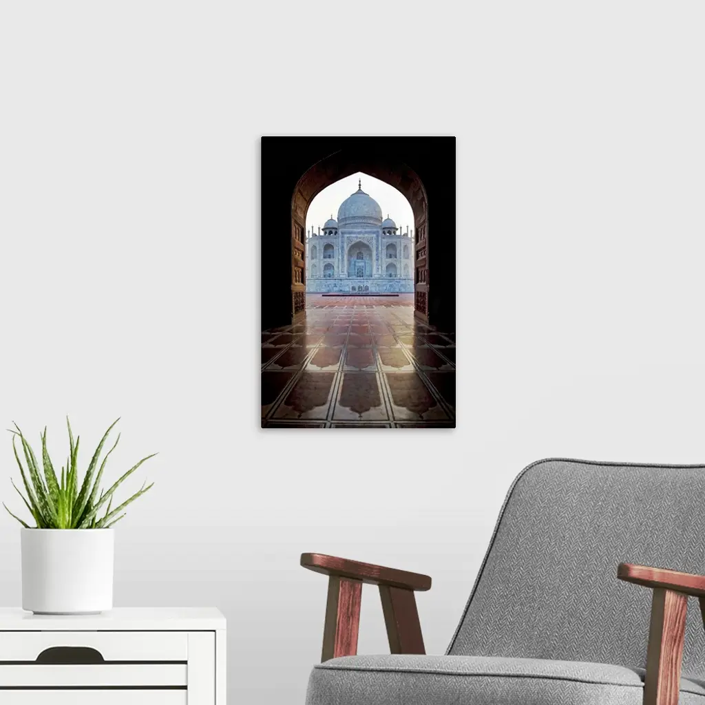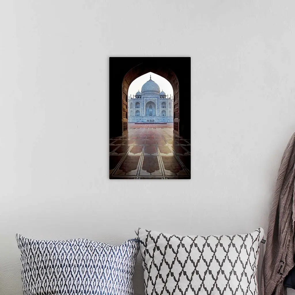 Photograph taken of the Taj Mahal through an archway.