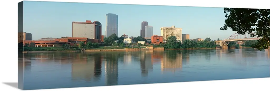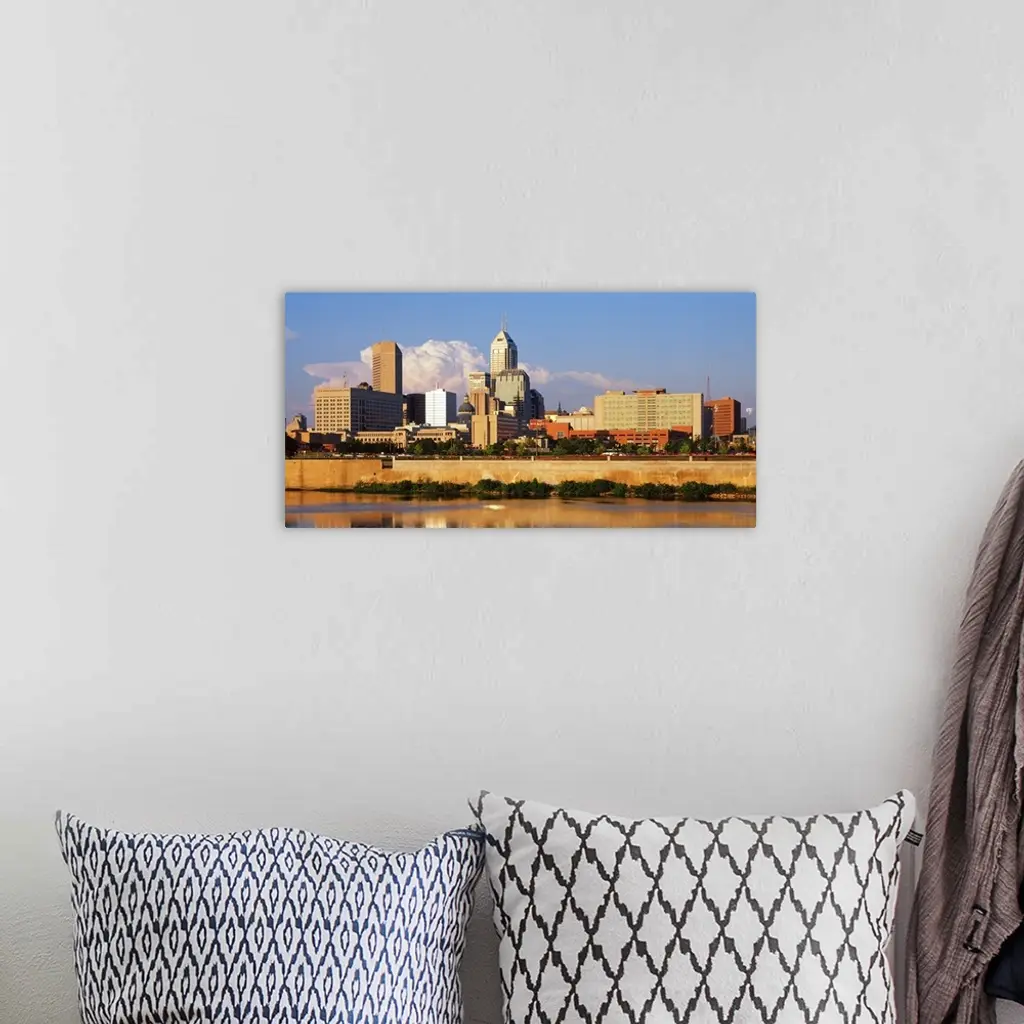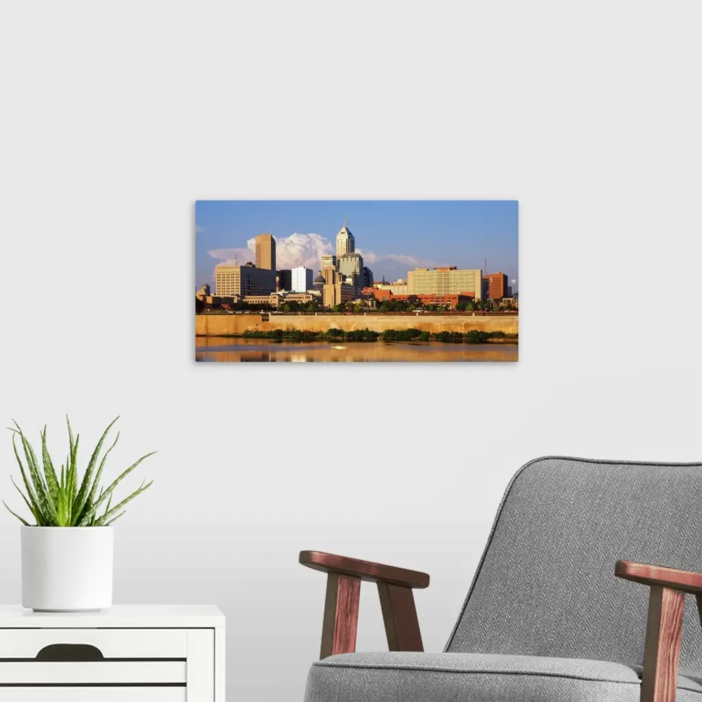 Photograph of the Indianapolis, Indiana city skyline from the water on a sunny day.