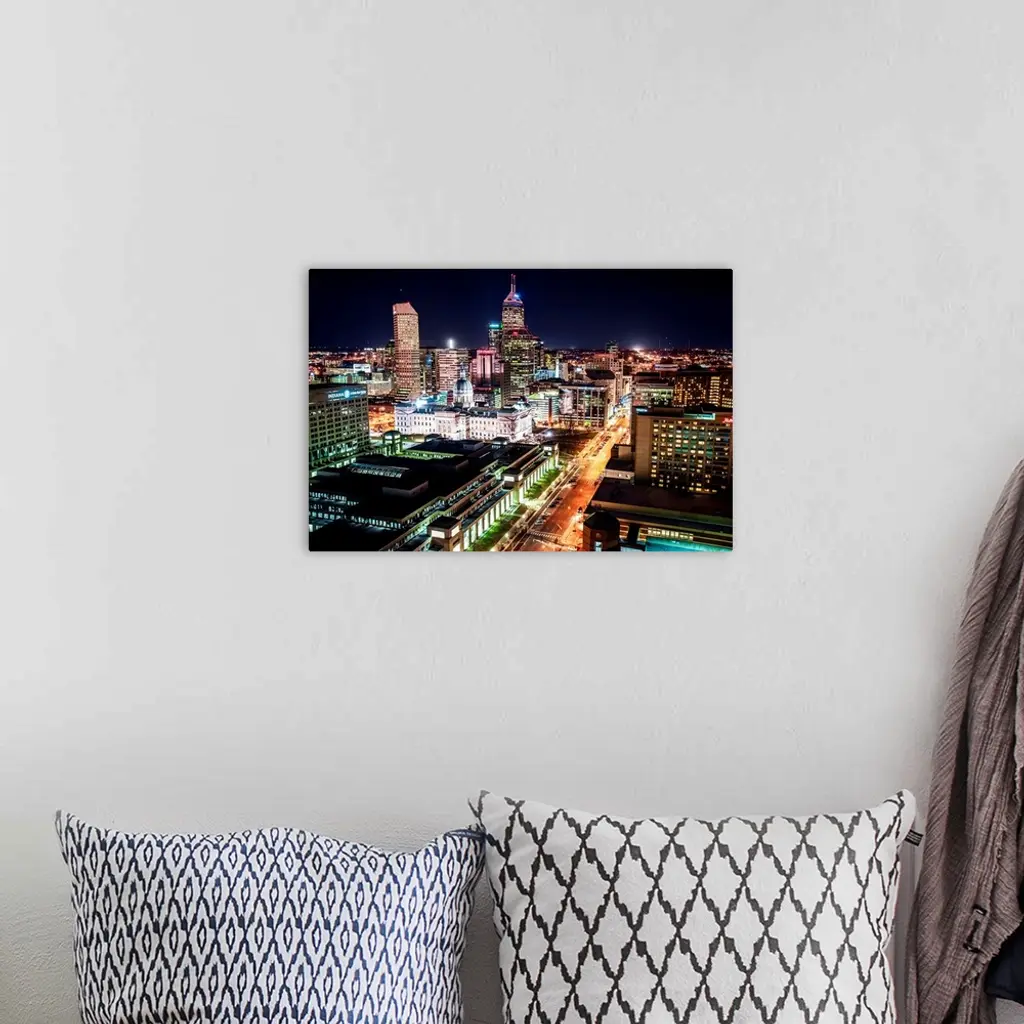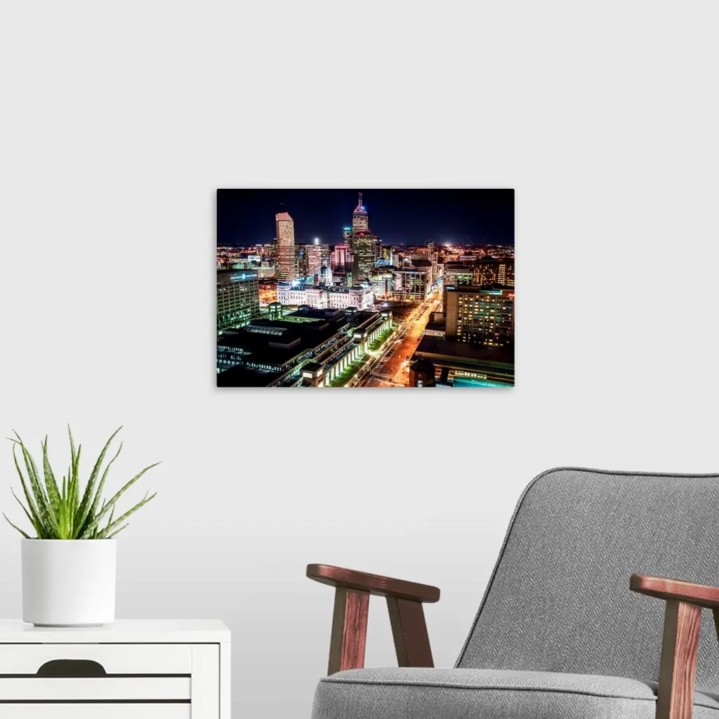 Skyscrapers illuminated at night with busy streets in Indianapolis, Indiana.