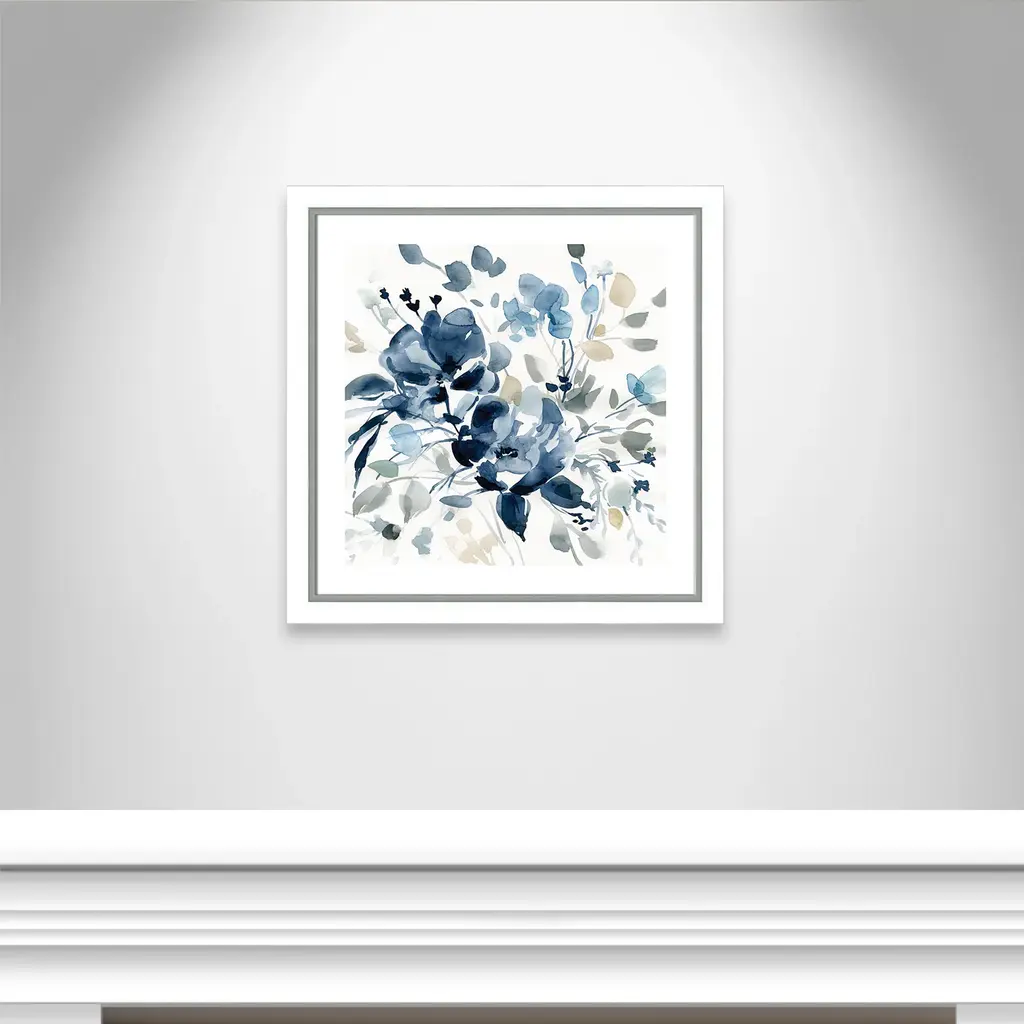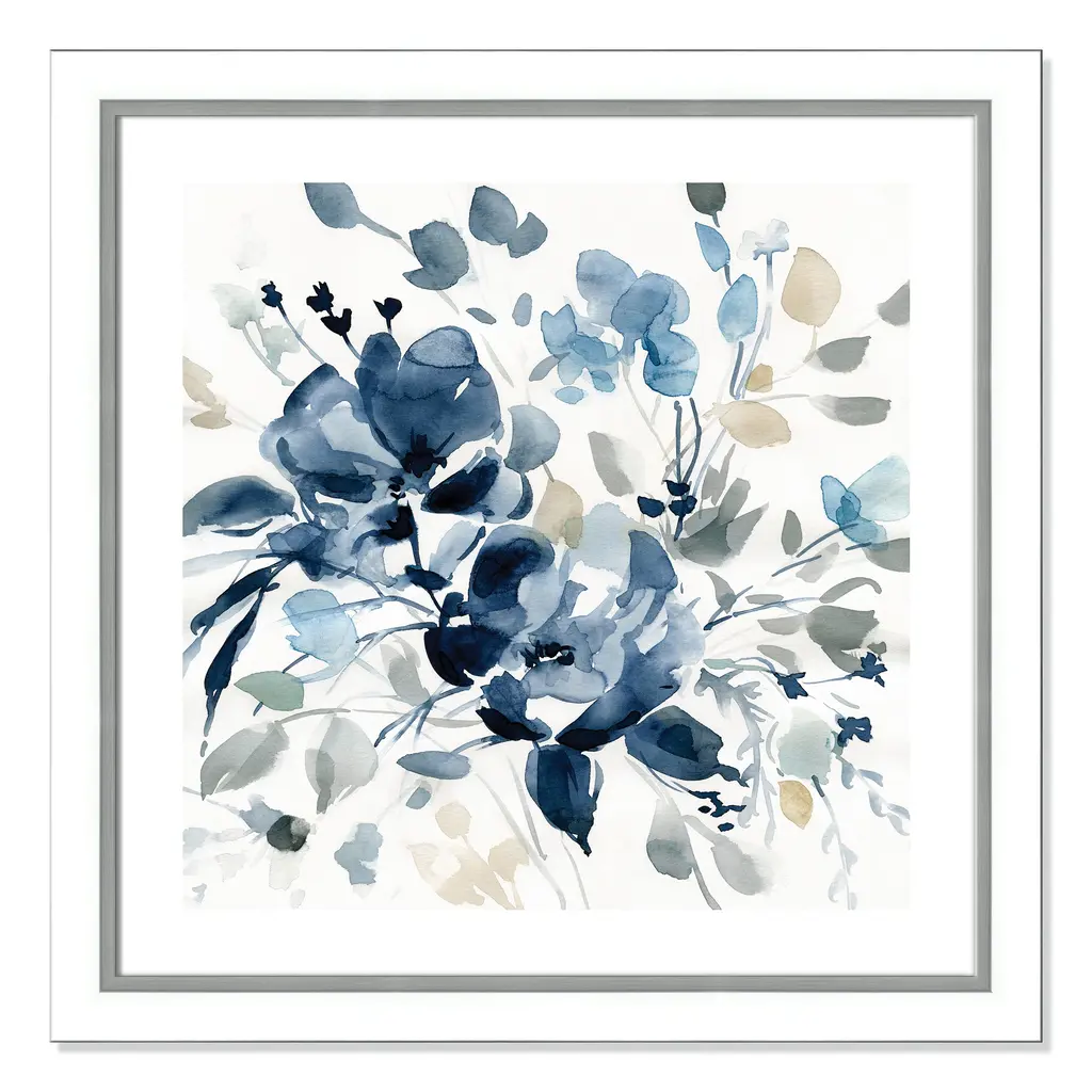 Transform your walls with the latest color trends in home décor! This dainty watercolor floral image combines rich shades of indigo and neutral tones for a classic, elegant appearance. Finished in a modern frame made of PS materials, this is the perfect addition to your walls. Archival fine art giclée print on acid-free and lignin-free 100% cotton rag paper; image includes a bright white self-matting border Printed with gallery-quality inks using the finest giclée print technology for unsurpassed color gamut and clarity Lightweight and finished under shatter-resistant acrylic; hanging hardware attached for easy and secure installation Handcrafted in the USA and ships with a Certificate of Authenticity Lightweight and finished under shatter-resistant acrylic