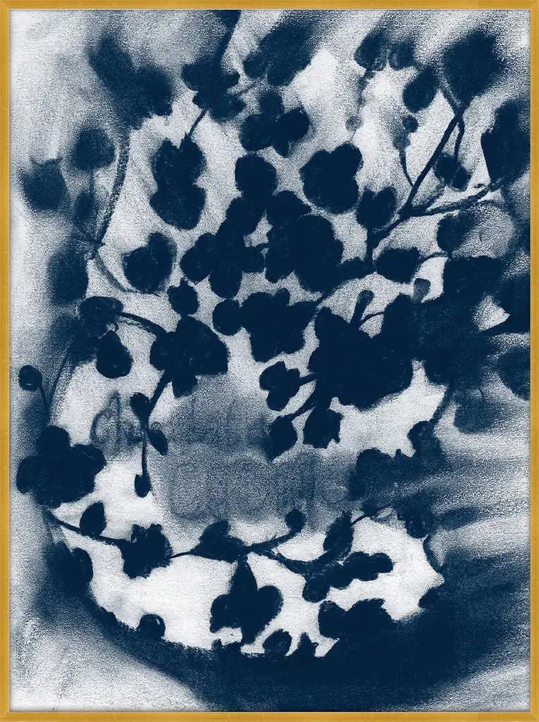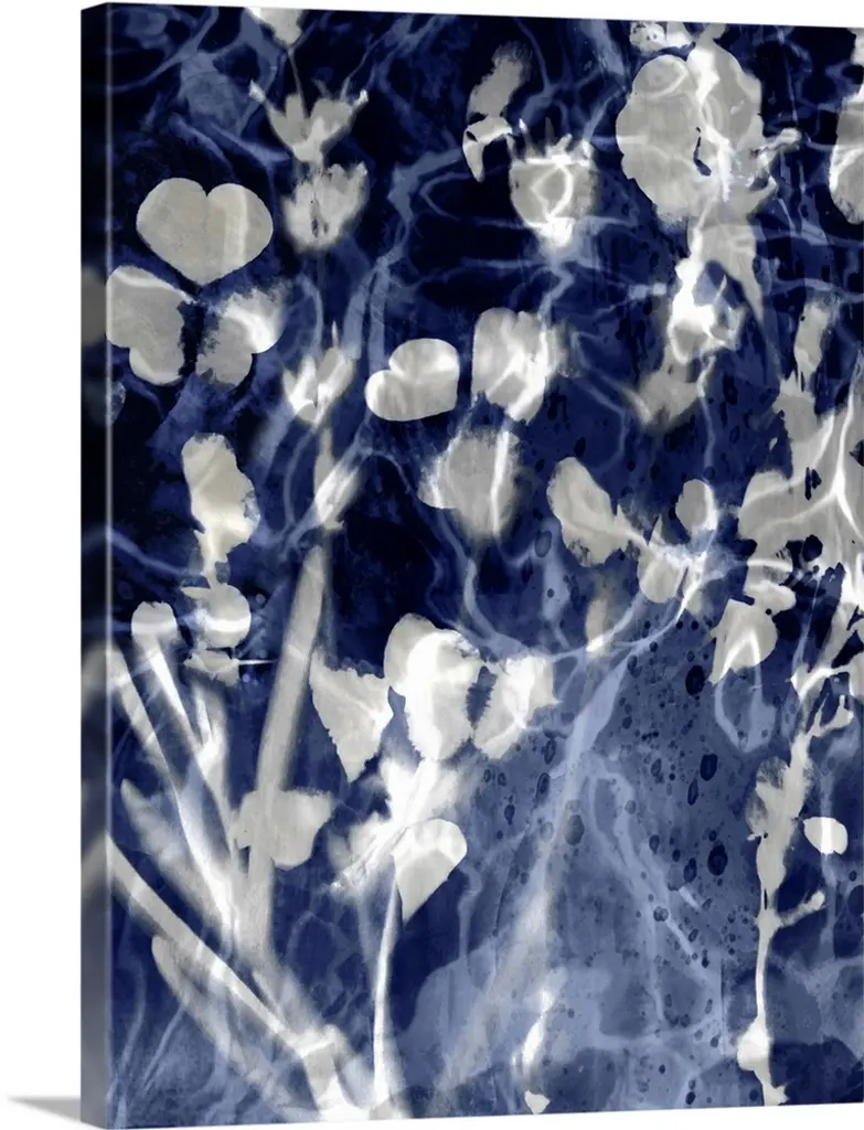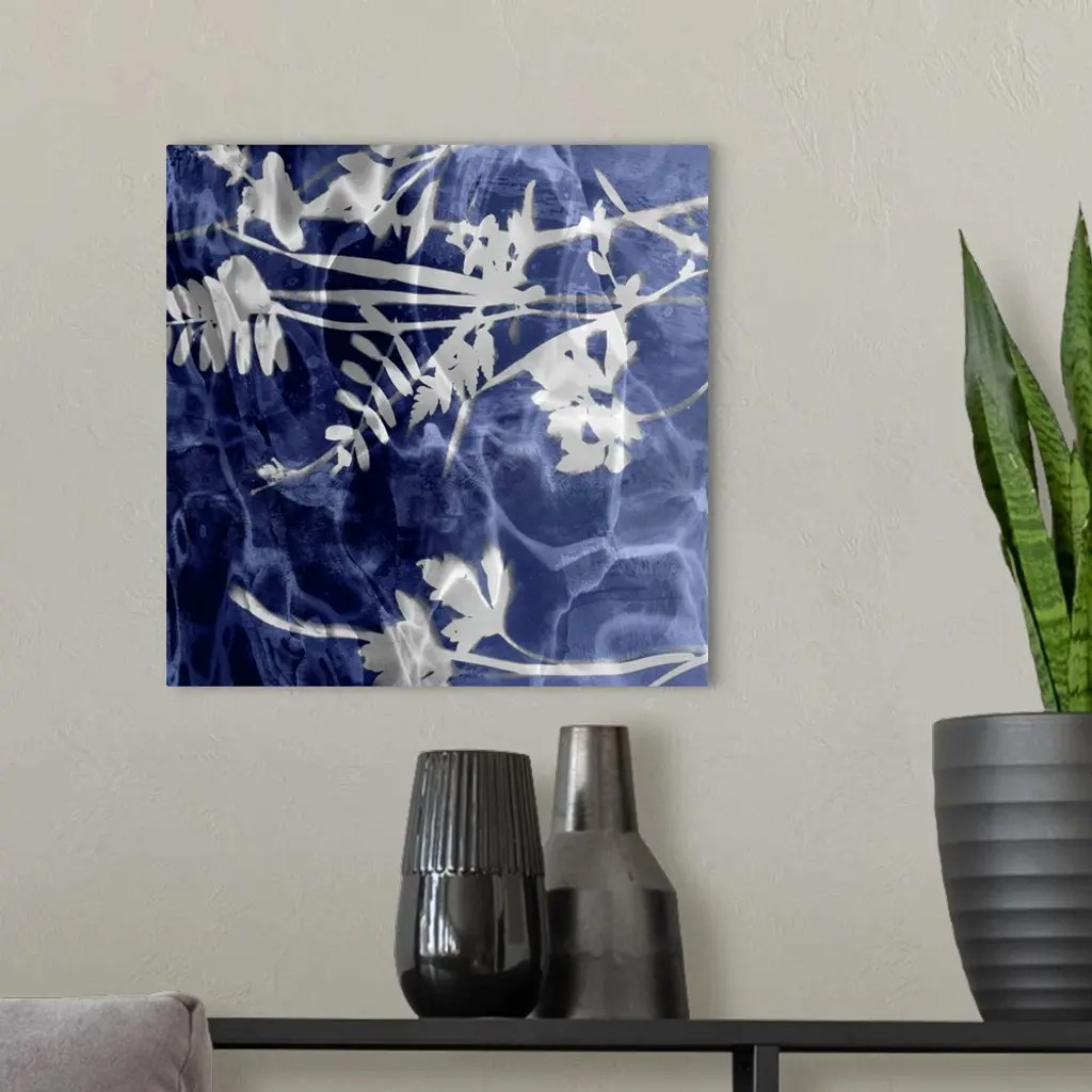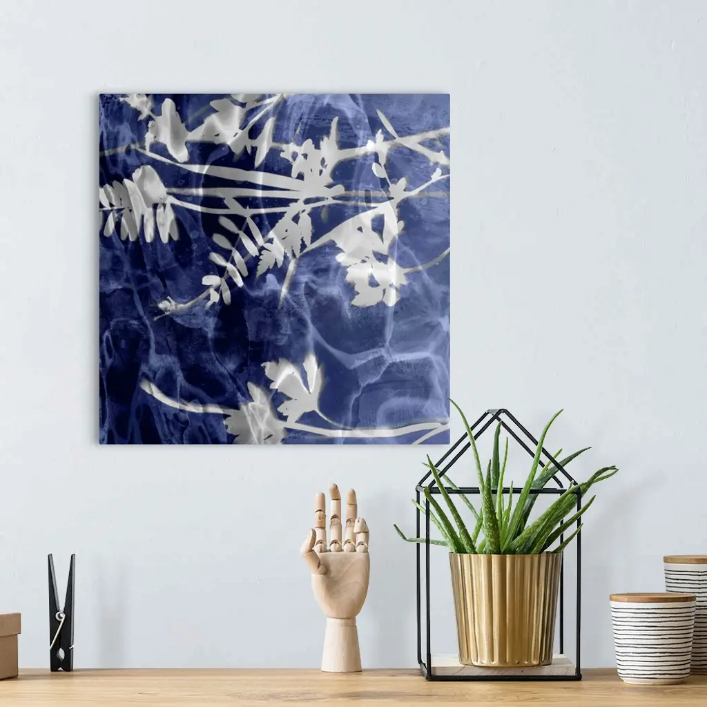 Square home decor with silver silhouettes of leaves and flowers on an indigo background with a watery look.