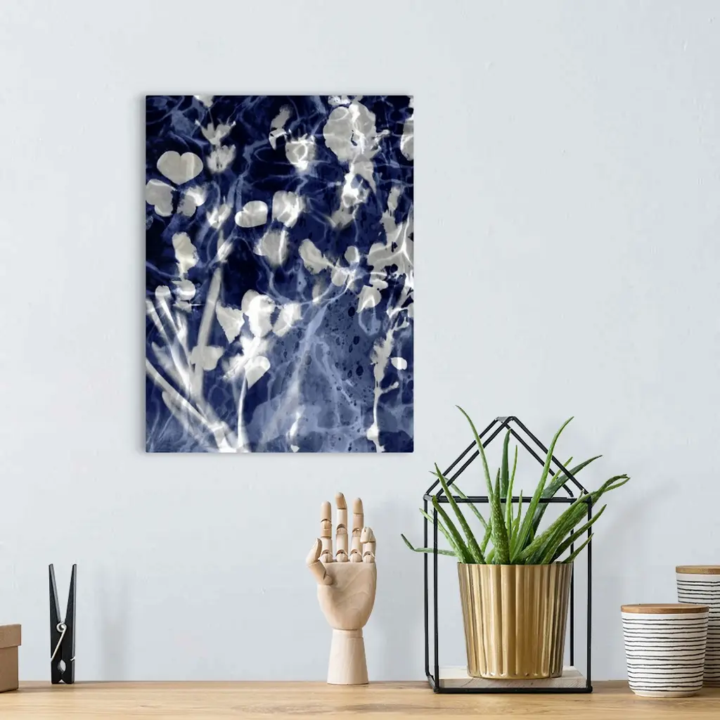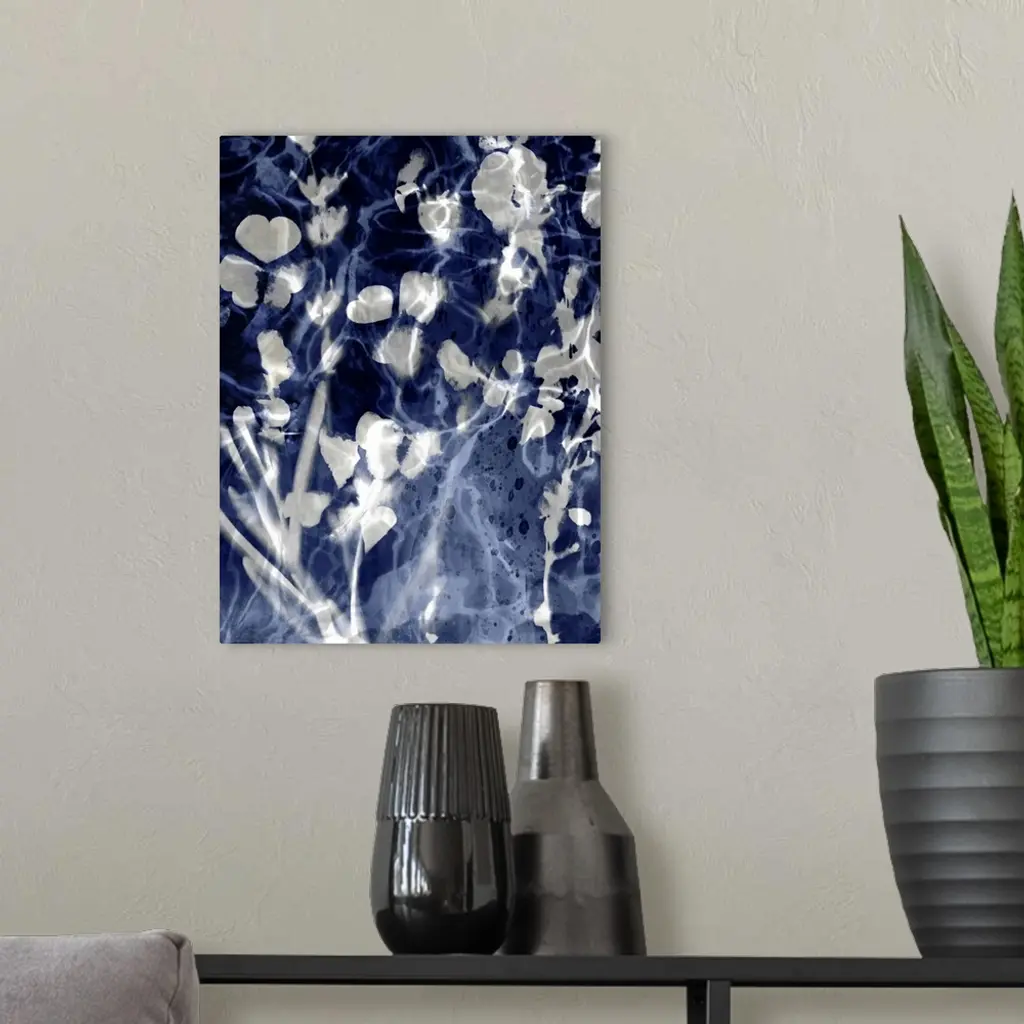 Home decor with silver silhouettes of leaves and flowers on an indigo background with a watery look.