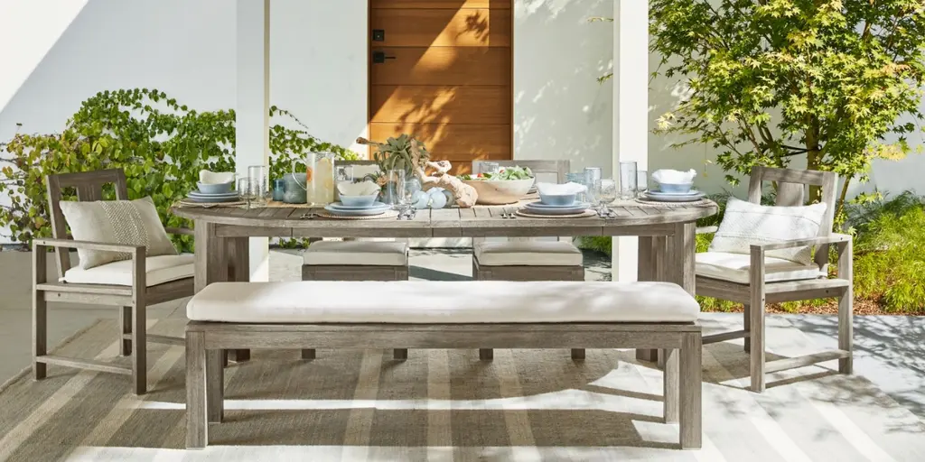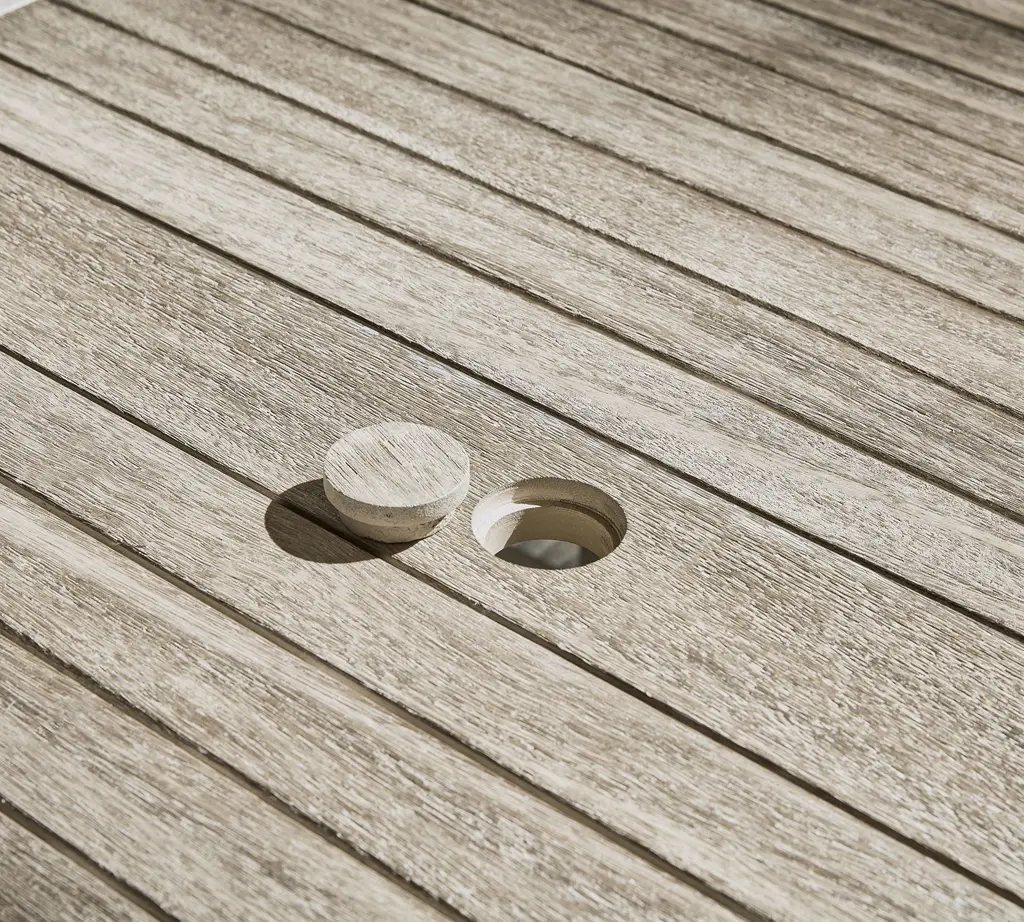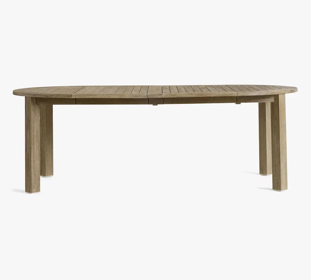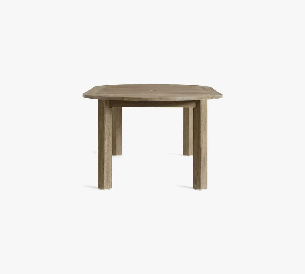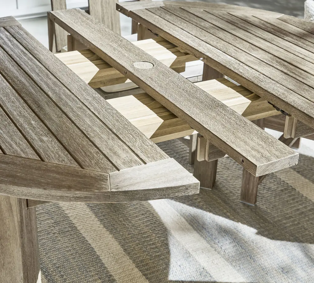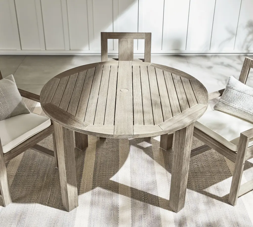 Clean lines, a compact profile and laid-back good looks help our Indio Collection fit in anywhere. Versatile and durable, this four-person table extends into a lozenge shape to fit up to eight, with a hole at the center to hold an umbrella. It is crafted from sustainable, kiln-dried, solid eucalyptus wood for weather resistance and a relaxed, sun-drenched vibe.