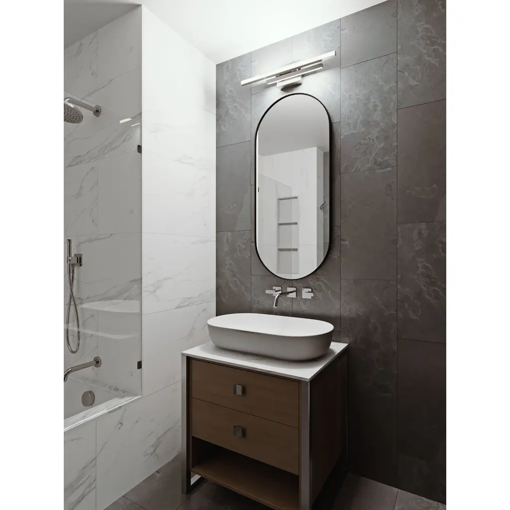 A sleek and contemporary accent light, the Indra LED Vanity by AFX lends a unique presence to bathroom mirrors, vanity tables, tub spaces, and more. It's framed in sleek metal in a range of finishes, with an integrated LED light element that helps to illuminate the hardest to light spaces. This fixture is dimmable and title 24 compliant with 5-in-1 CCT to perfectly light the modern home for years to come.