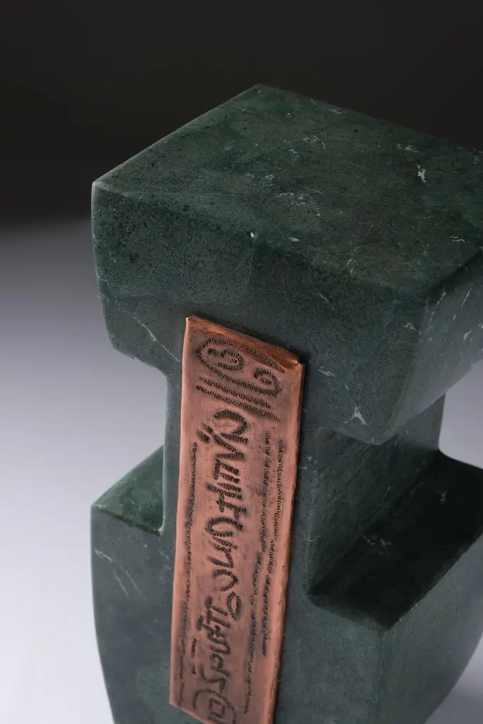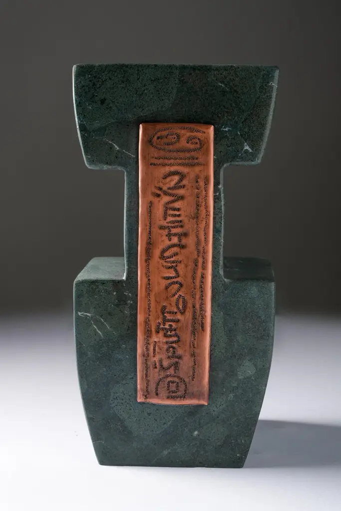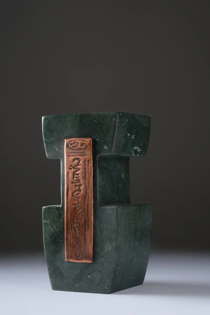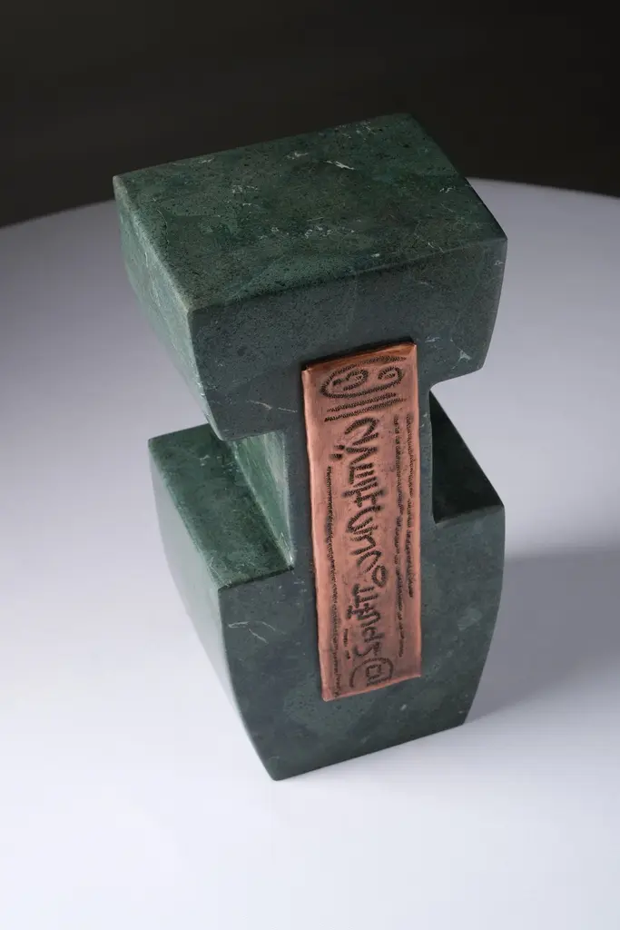 Indra Monolith by Ayse Zelal TugrulOne of a KindDimensions: D 12 x W 15 x H 30 cm.Materials: Marble, copper.Indra is the Vedic God of rain and thunderstorms, symbolizing the incredible power of leadership and creativity.Zelal, born in Diyarbakir, in the ancient lands of the Tigris and Euphrates, received her education in Istanbul, Boston, and Milan. From a background in civil engineering and a master's degree in architecture, she seamlessly transitions into her role as a designer, combining engineering precision with artistic vision. Today, his work draws inspiration from the ancestral heritage of Mesopotamia, where copper and natural stone are central elements. Copper symbolizes the surviving legacy of ancient civilizations and the passage of time, while natural stone embodies the pure elegance of the earth. Through the natural processes of aging and oxidation, each piece acquires a distinctive character, evoking the narrative of evolution. Zelal's work, not aiming to be a historical artifact, represents the search for form within artistic expression.